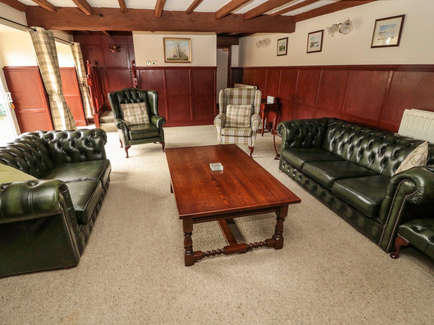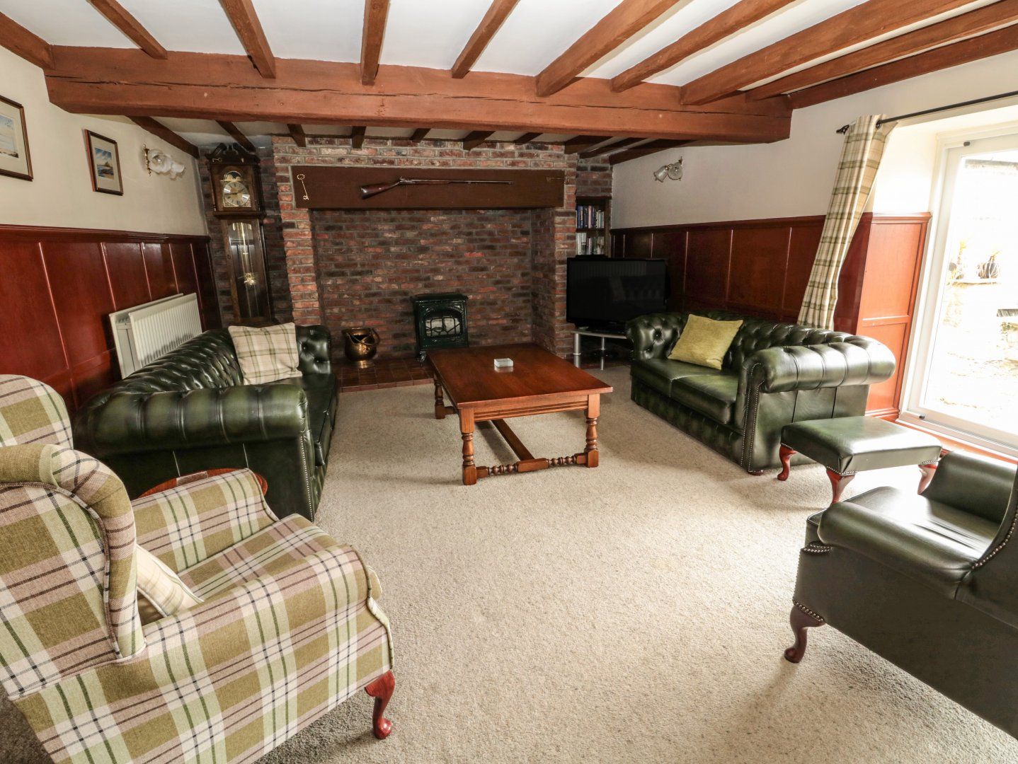 Central heating. Electric oven and hob, microwave, kettle, toaster, fridge, freezer, washing machine, tumble dryer, dishwasher. Smart Tv, WiFi. Fuel and power inc. in rent. Bed linen and towels inc. in rent. Cot and Highchair available. Off-road parking for 2 cars. Front patio with bench and shared rear courtyard with furniture and pond. One small dog welcome. Sorry, no smoking. Shop 1.3 miles, pub 3 miles. Note: There is a step leading from the car park to the patio, please take care. Note: There is an unfenced pond in the rear courtyard, please take care and ensure that children and pets are supervised at all times. Note: No stag/hen parties or similar Note - As from 7th Jan 23 the triple bunk beds will be removed and replaced with a double bed. Please note: From 30th December 22, the maximum occupancy will be x5 guests.