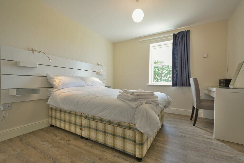 Bedroom 1 with double bed, dresser and wardrobe. En suite shower room with shower, WC and basin.