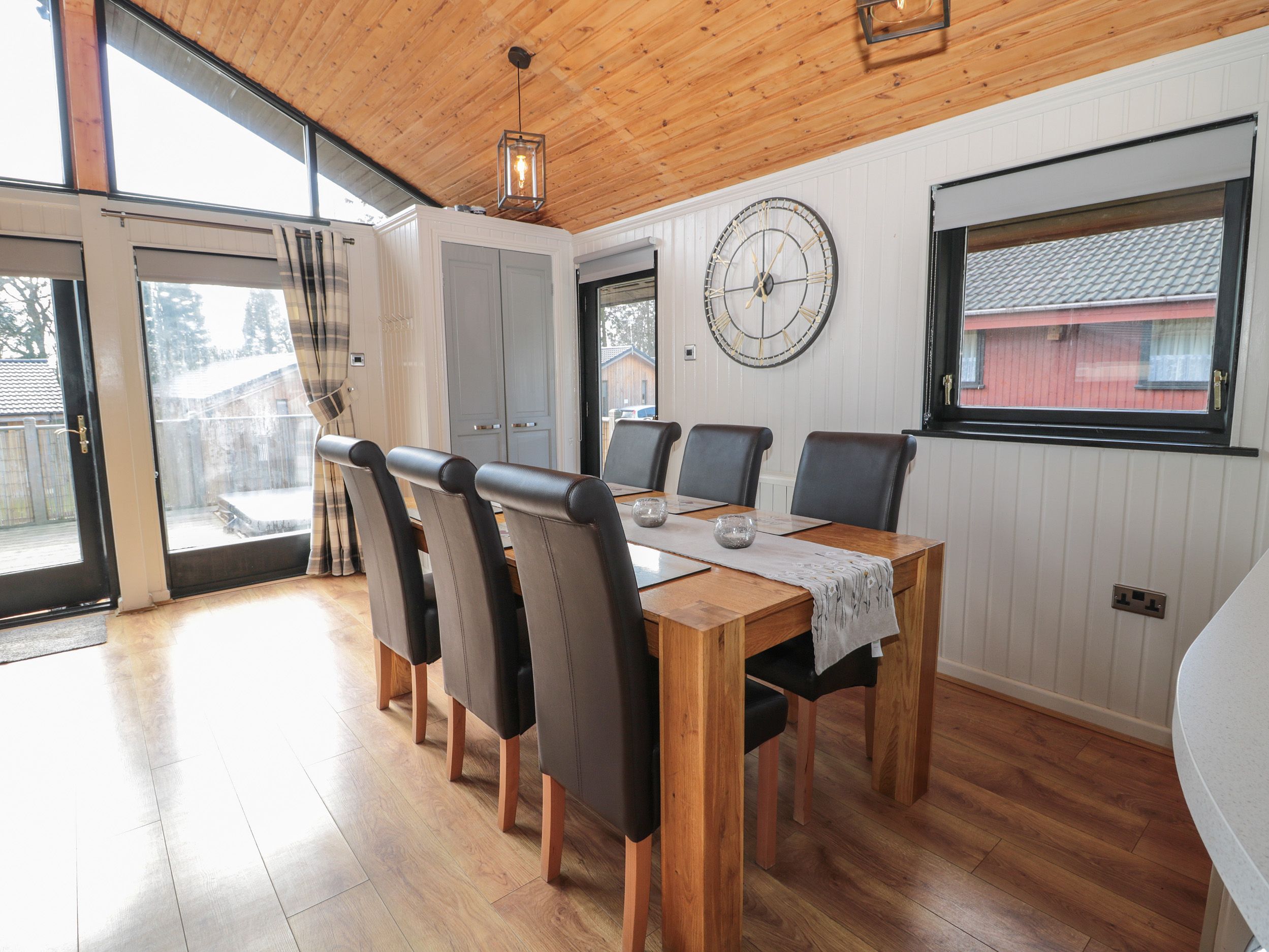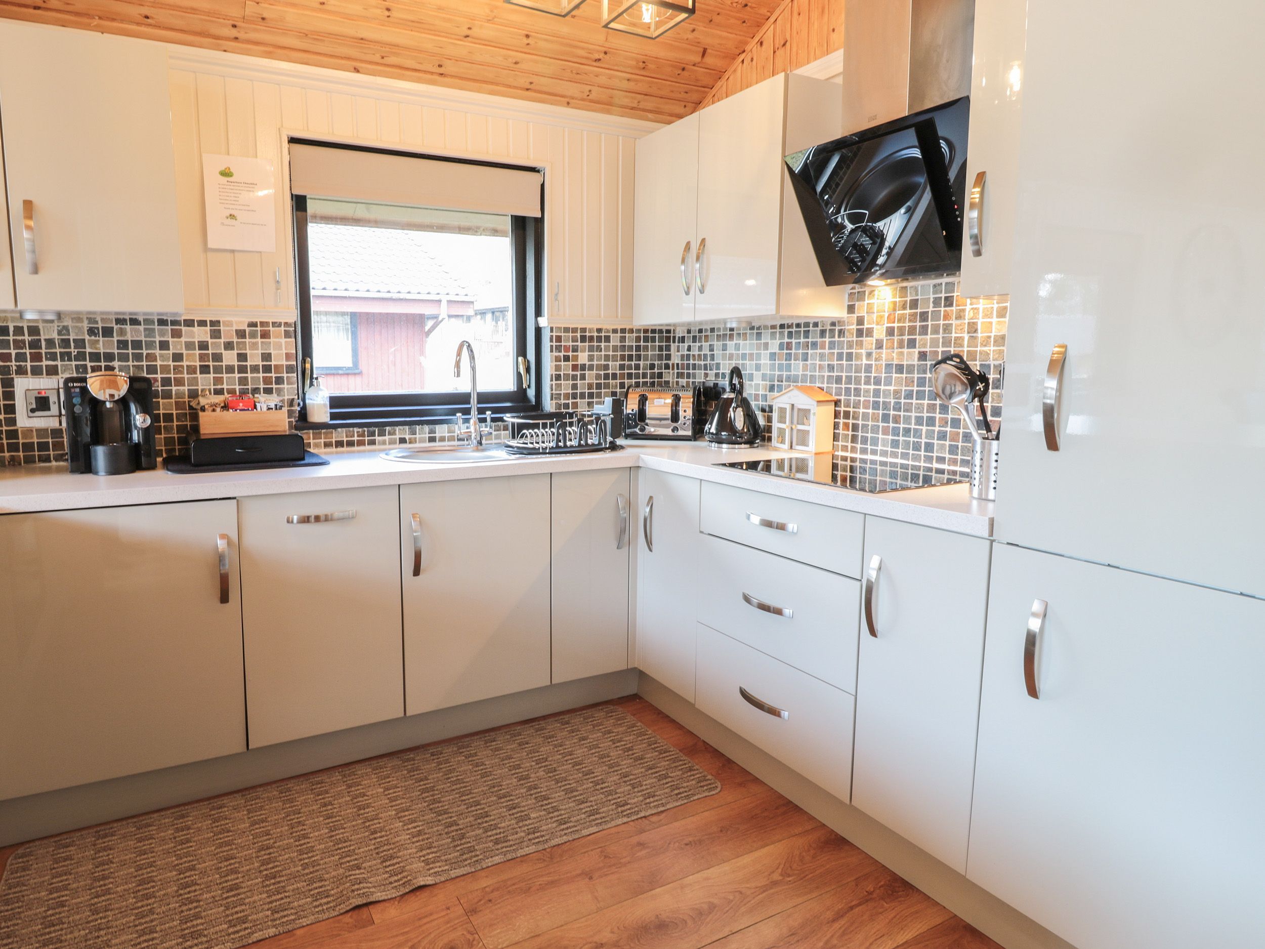 Amenities Electric central heating. Electric oven, induction hob, microwave, fridge/freezer, dishwasher, washer/dryer, kettle & wine chiller. Freeview Smart TV with DVD, Netflix and Amazon Prime, and WiFi. Fuel and power inc. in rent. Bed linen and towels inc. in rent. Cot and highchair available. Off-road parking for two cars. Private decking with hot tub and seating. Two well-behaved dog welcome. Sorry, no smoking. Shop 1.1 miles, pub 0.2 miles. Note: Barbecues and fireworks are not permitted on-site. Note: There are 6 steps up to the decking. Note: The property is set within 500-acres of woodland grounds shared with other guests. Note: There is an unfenced lake in the grounds