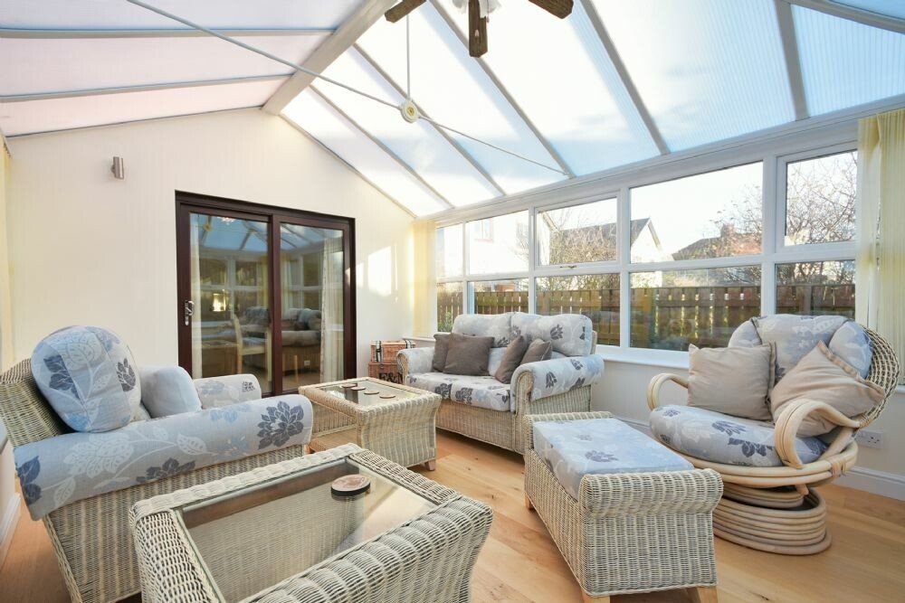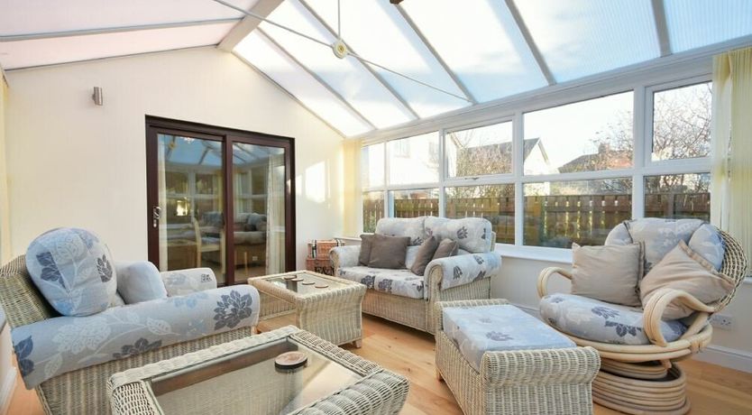 Conservatory with comfy seating and doors to the rear garden.