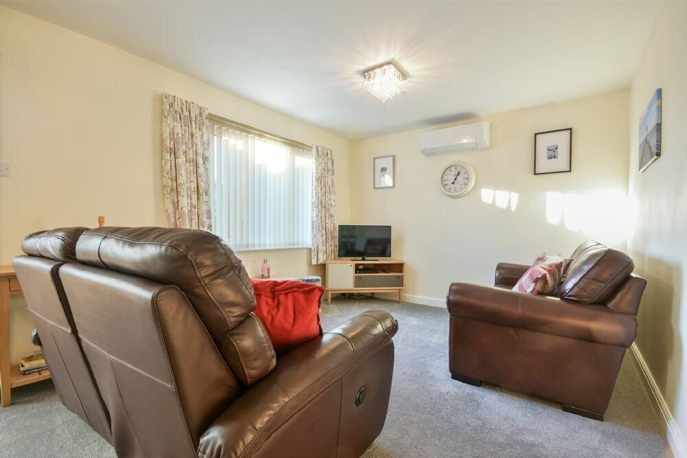 Lounge/diner with comfy sofas, TV, dining table and chairs and air source heater.