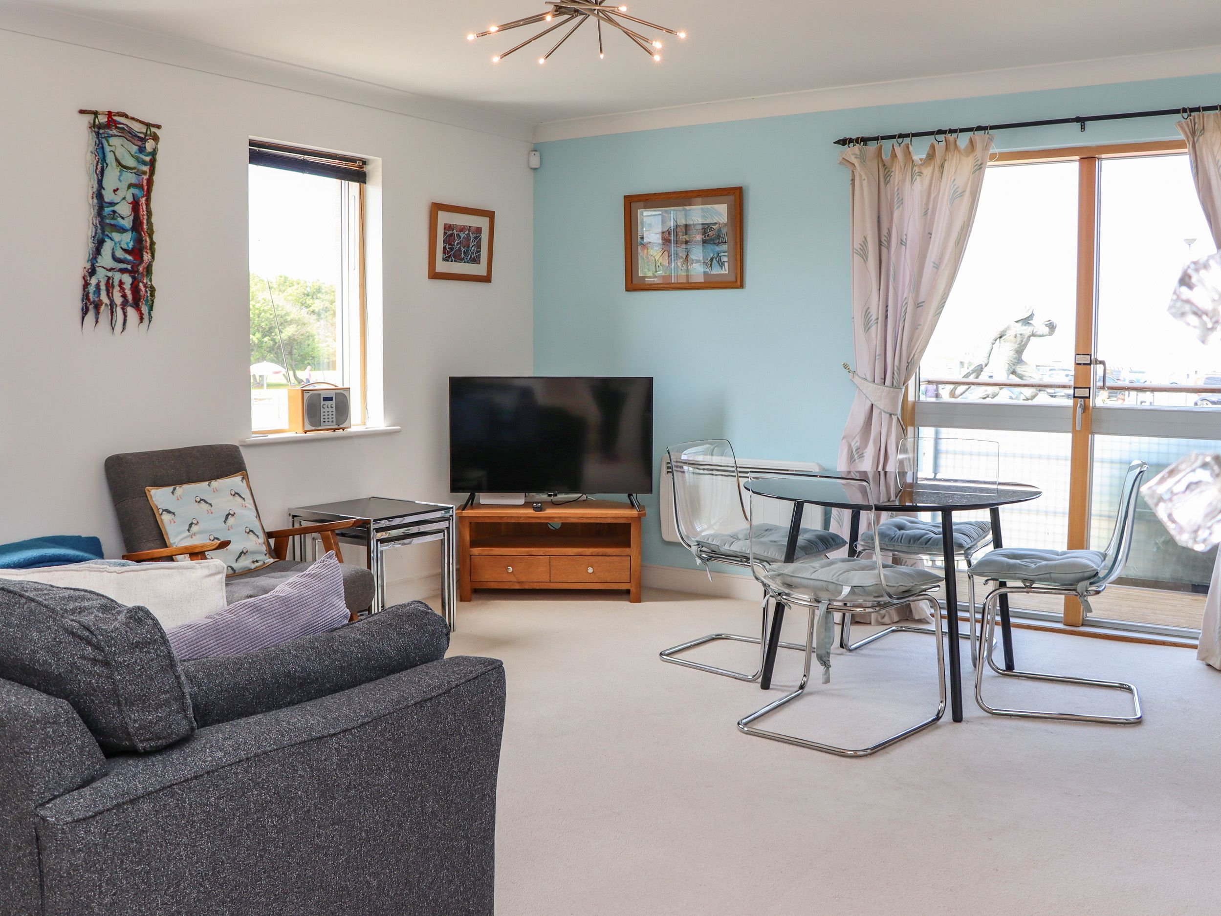 Open plan lounge/diner with comfy sofa, relaxer chair and footstool, Smart TV, dining table and 4 chairs, French doors to balcony with outdoor seating for 4 people.