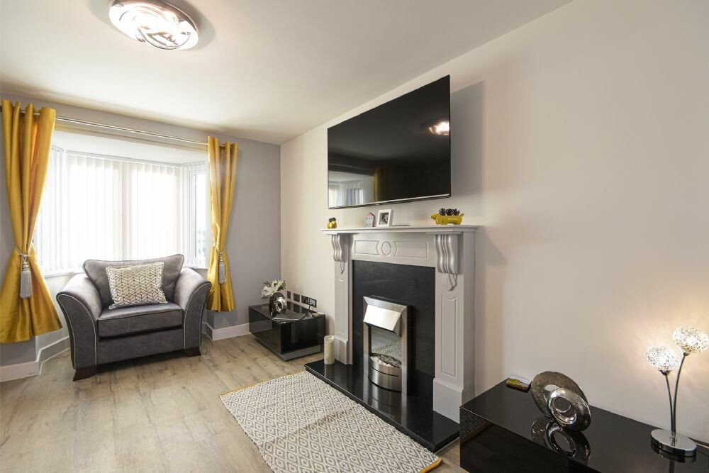 Lounge with comfy 3-seater sofa, foot stool and 2 large arm chairs, Smart TV and electric fire.