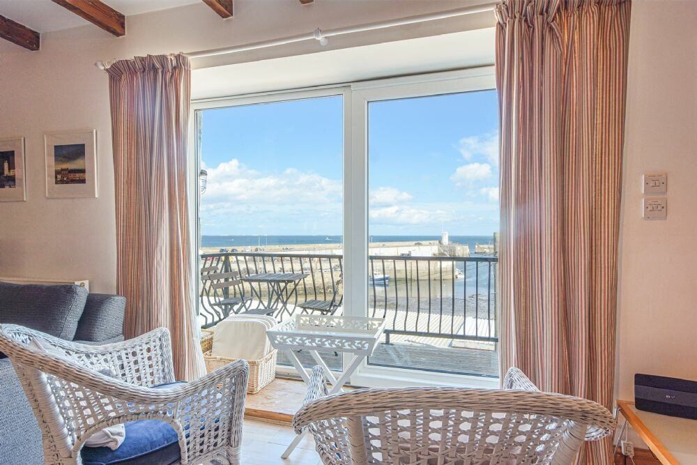 Balcony with table and chairs overlooking harbour and Farne Islands.