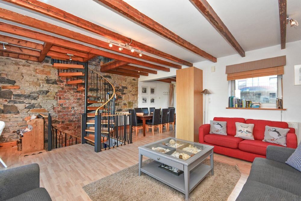 Holiday home Farne Lookout has an outstanding location with fantastic uninterrupted panoramic sea views overlooking the busy harbour in Seahouses and the Farne Islands. From the windows in the living room and upstairs bedroom you can enjoy all the hustle and bustle of a working harbour with the fishing boats bringing their catches in, lifeboat launches, and a wealth of bird life including the famous 'Cuddies Duck' who bob about in the inner harbour. This fabulous four storey seafront property provides a flexible base with easy access to the beach and village amenities. It is furnished to a high standard and there is access from the rear into the second floor and also from the harbourside into the ground floor.