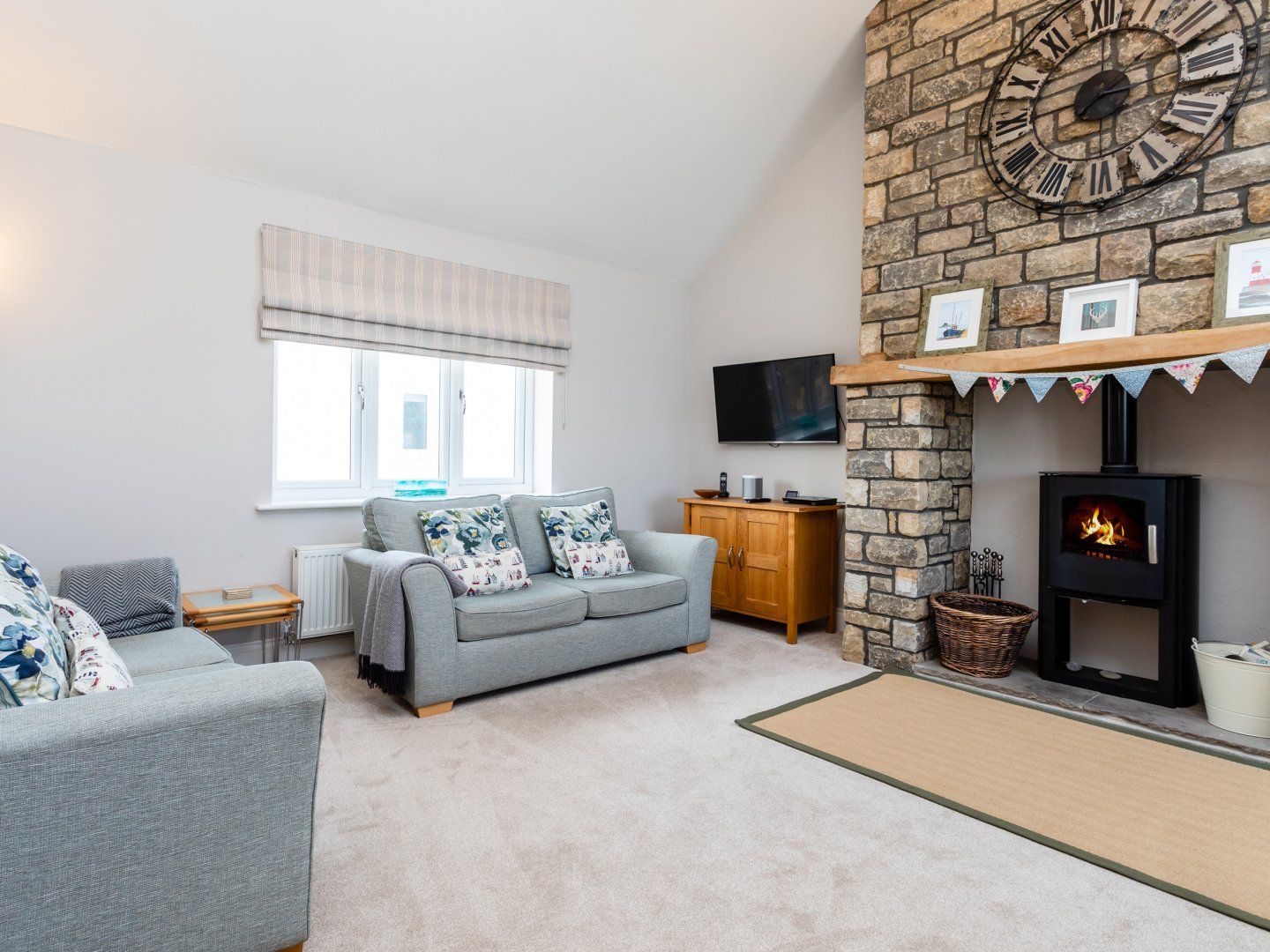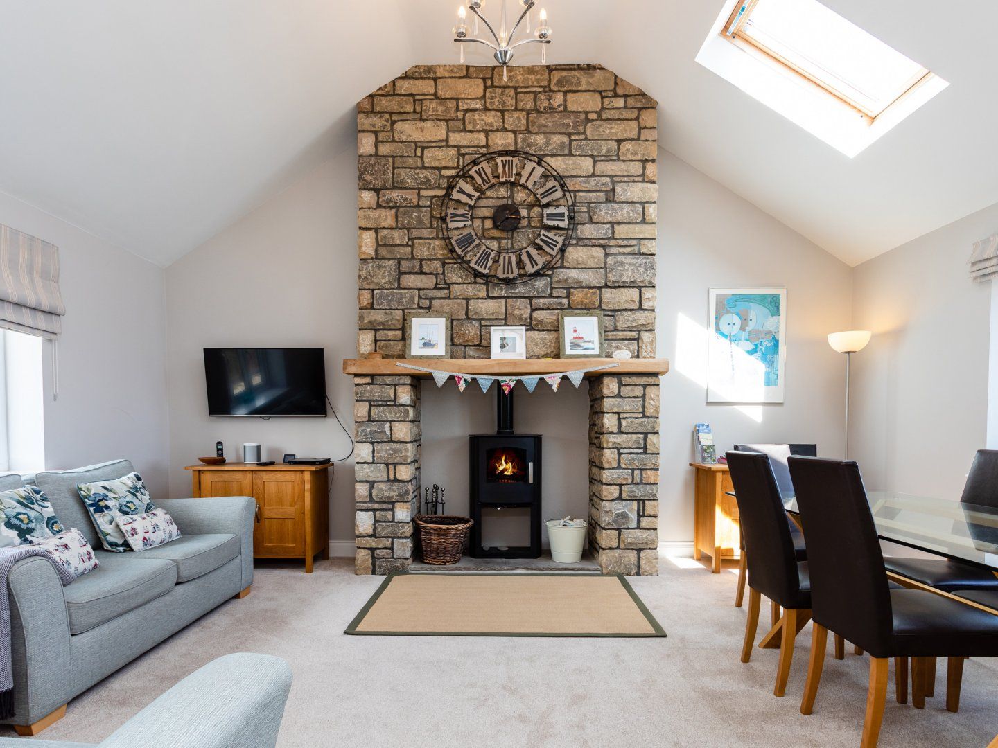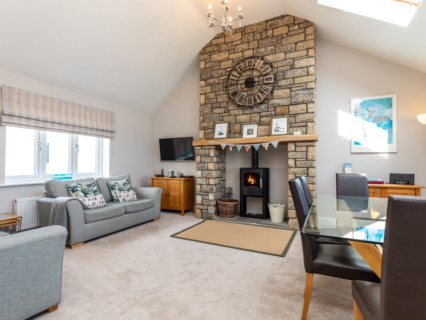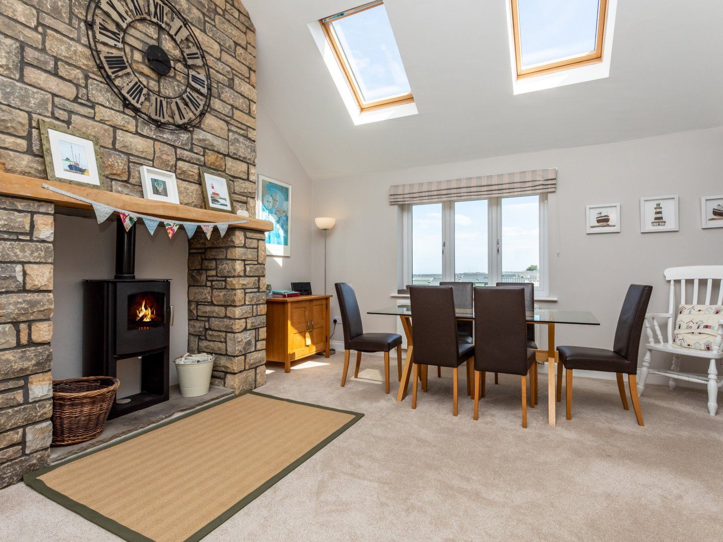 Lounge with comfy seating, feature fireplace with log burning stove, large Smart TV, DVD player, iPod dock and music streamer. Views of the coastline.