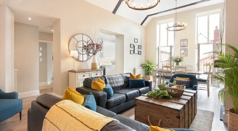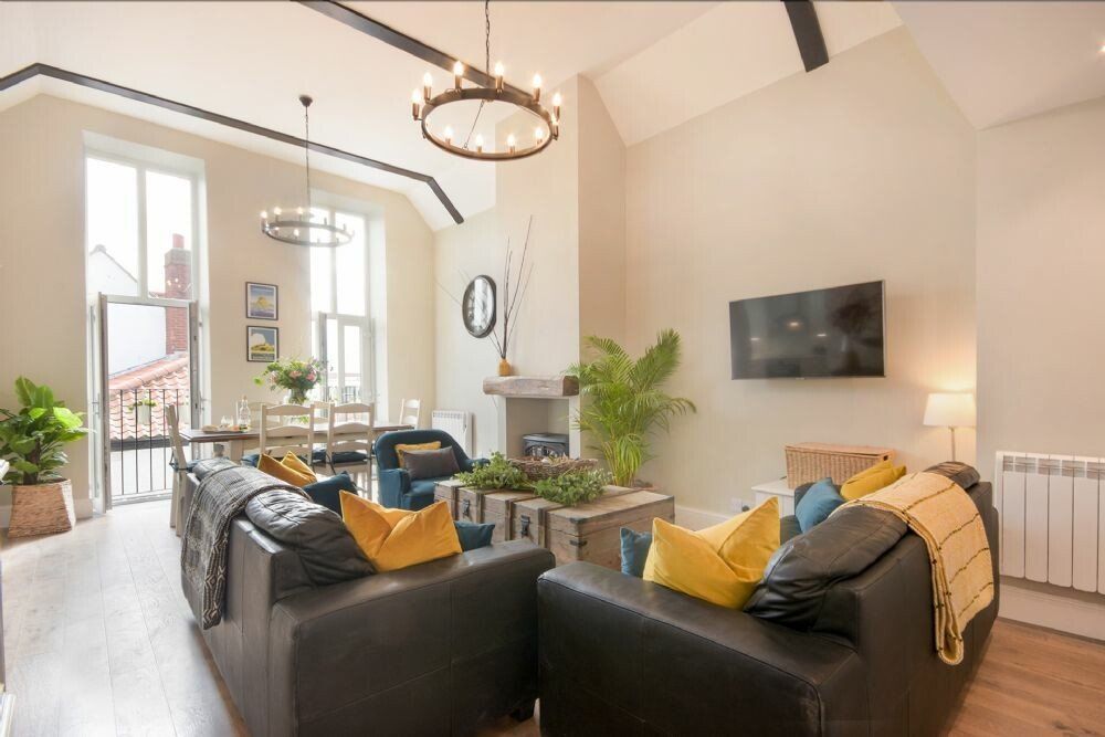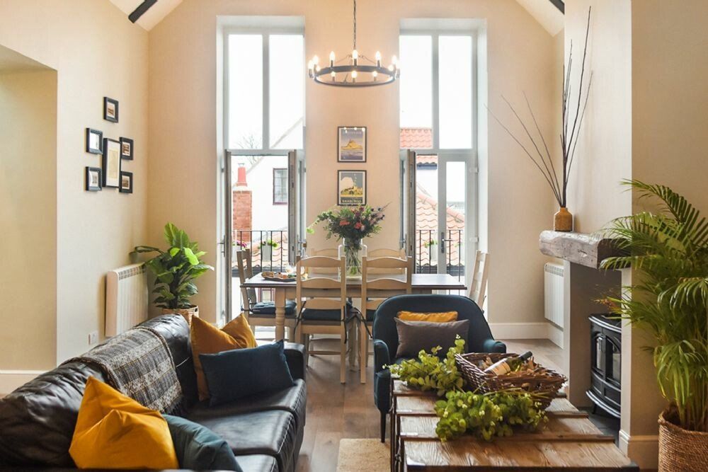 Lounge/diner with floor to ceiling windows/doors with Juliet balconies, electric Optimist fire, comfy sofas and chairs, smart TV, table and 6 chairs.