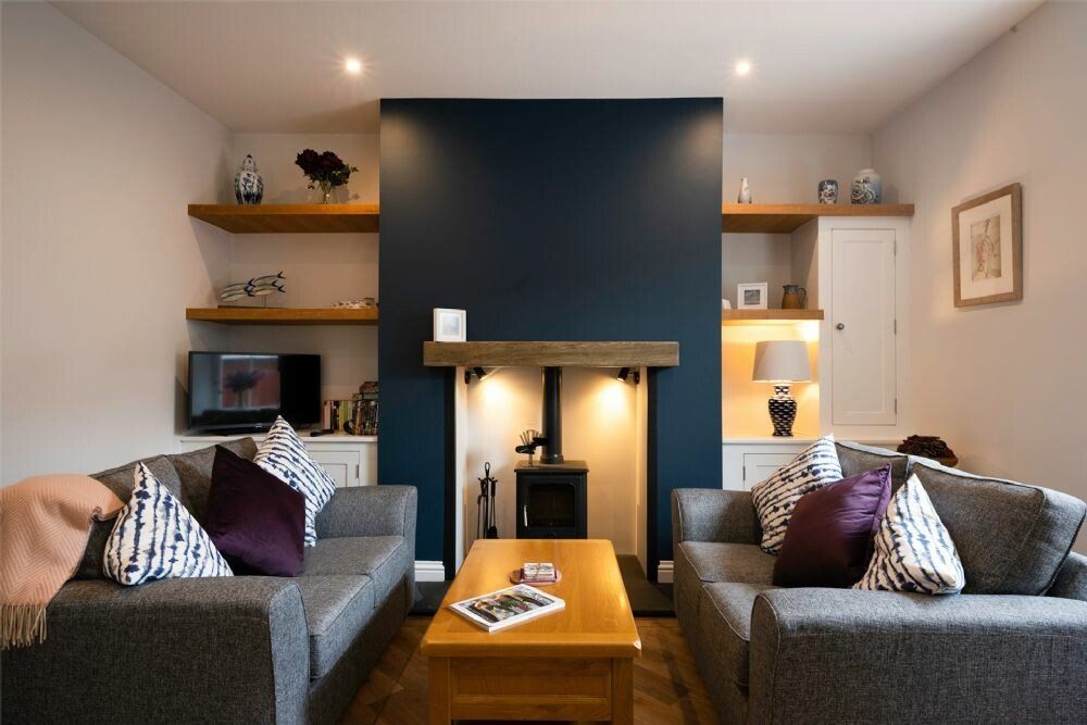 Living area with 2 comfy sofas, smart TV with DVD player and new log burner.