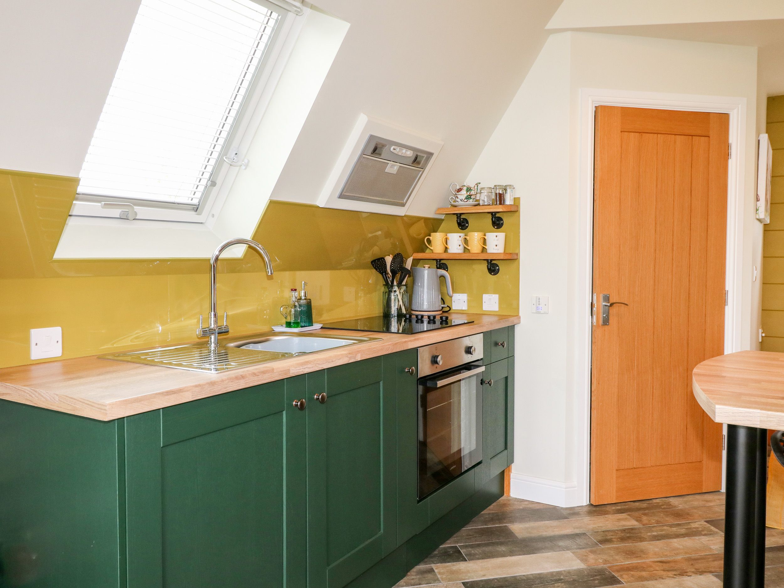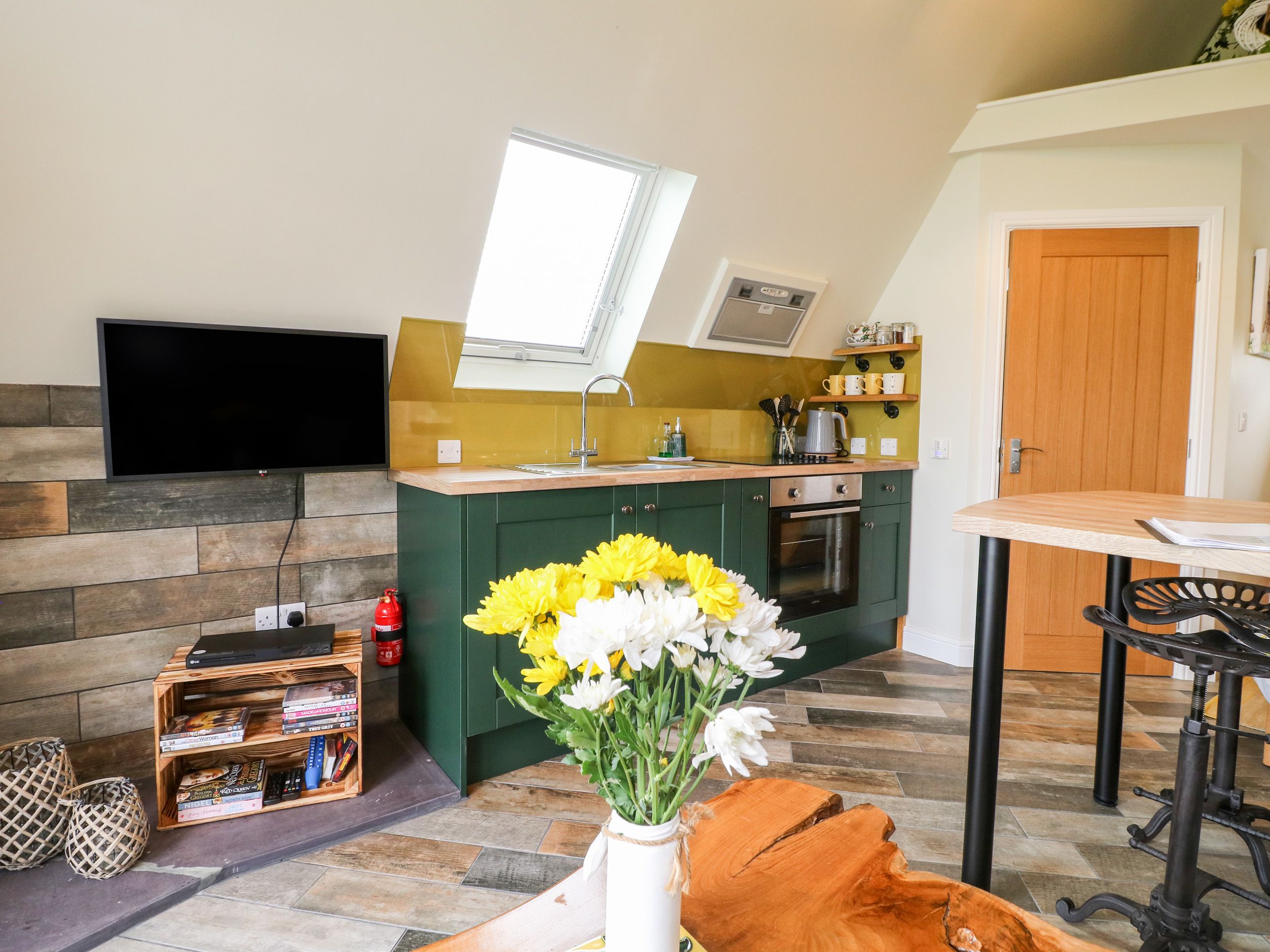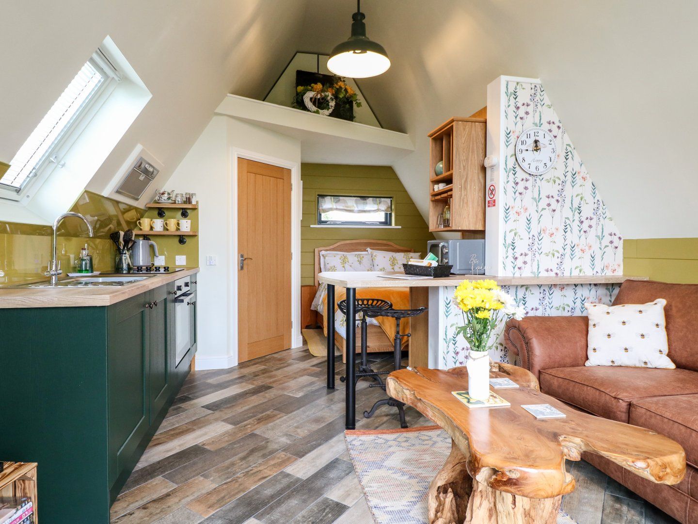 Studio-style layout with double bed, kitchen, dining area and sitting area. Shower room with walk-in shower, basin, heated towel rail and WC.