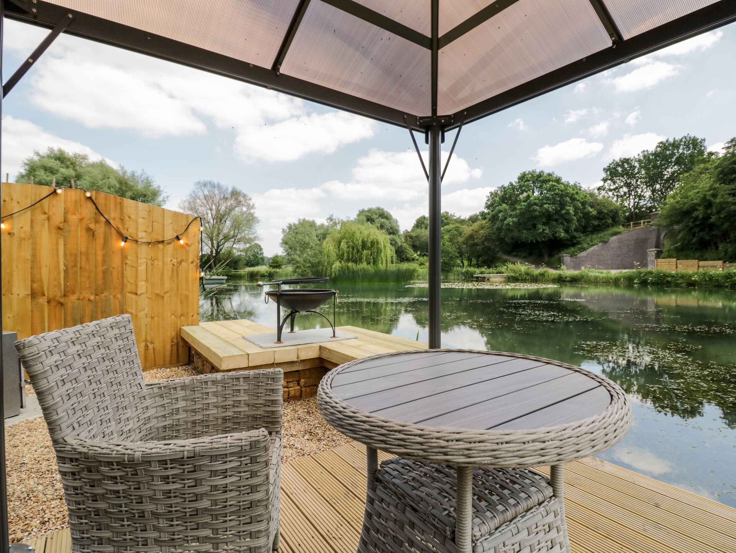 Accomodation Details Sykes Gem Awards 2024 Bronze winner for Best Glamping Property. Nestled within the serene countryside surrounding Banbury, and with its private pontoon as a focal point, guests can enjoy picturesque views, serene walks, and a peaceful atmosphere, whether casting a line or simply unwinding by the water's edge. Contemporary all-ground-floor accommodation featuring a studio-style layout with one double bed and en-suite walk-in shower, basin, and WC. Open-plan living space seamlessly integrating a kitchen, dining area, and sitting area for comfortable living