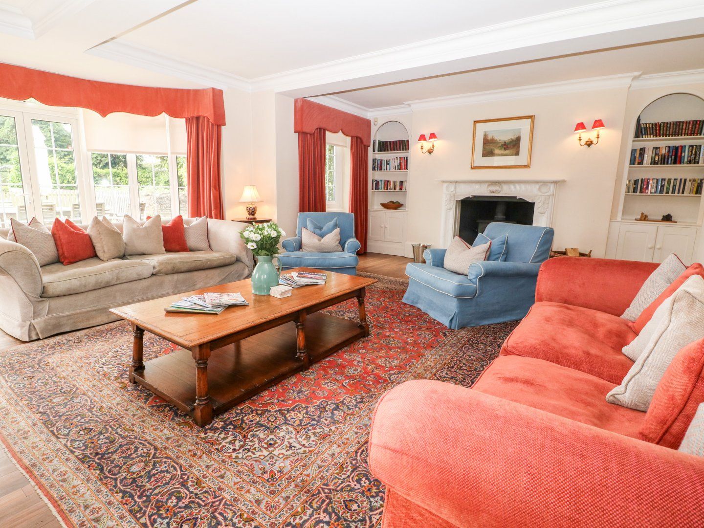 Eight bedrooms: 1 x twin with basin and fixed cot, 1 x king-size with basin, 1 x twin, 1 x king-size with basin and ensuite with shower over bath, basin, WC, 2 x twin bedroom with basin, 1 x king-size with fixed cot, having Jack-and-Jill access to bathroom with walk-in shower, basin, and WC, 1 x twin with Jack-and-Jill access to the same bathroom. Bathroom with bath, walk in shower, basin, and WC. Bathroom with walk-in shower, basin and WC. 1 x separate toilet. 2 x ground floor cloakroom. Prep kitchen. Kitchen with dining area. Dining room. Conservatory. Utility. Sitting room with piano. Main sitting room with wood burning stove. Playroom with sofa, TV, football table, books, and, DVD's. 2 x WCs downstairs.