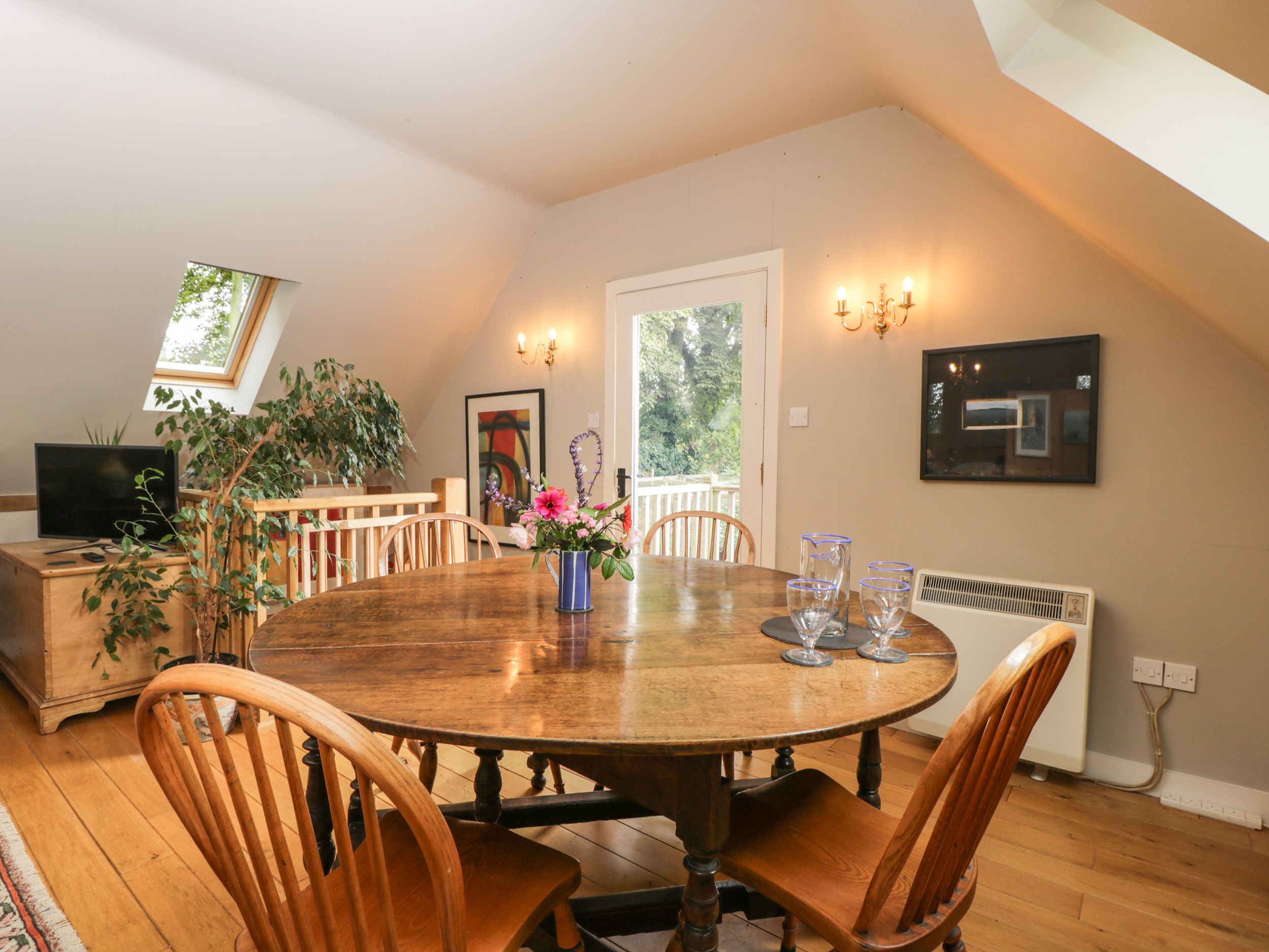 Studio-style, first-floor living/dining room with double bed with woodburning stove and balcony. Ground-floor shower room with walk-in shower, basin, and WC. Kitchen