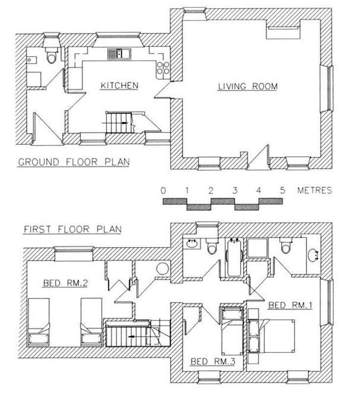 On the first floor there are three bedrooms; a double with a four-poster bed and an en suite shower room, a twin and a single with a faux bamboo four-poster bed sharing a bathroom with a power shower over the bath.