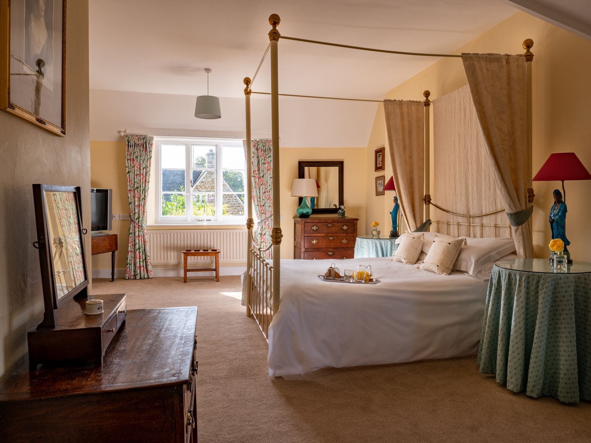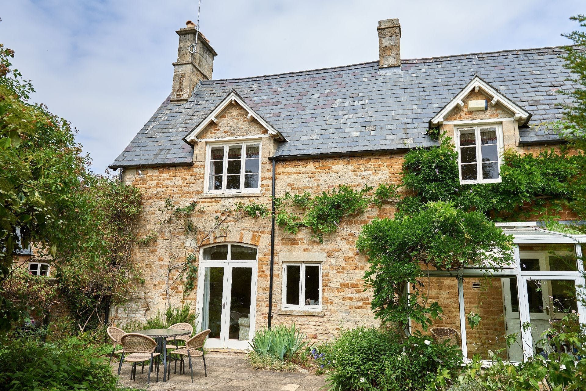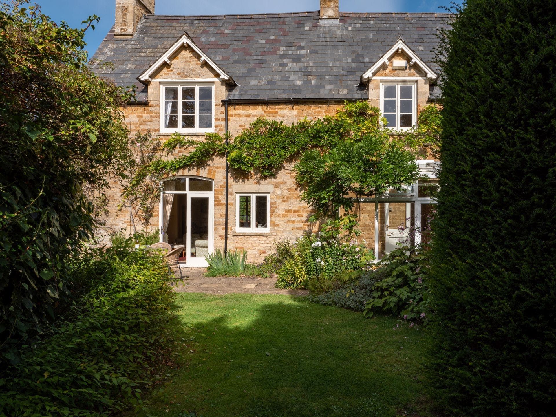 Take the most quintessential English cottage you ever did see, set amidst the rolling Cotswold countryside. Add to your doorstep five acres of sprawling shared gardens (think topiaries and a Moorish-inspired pavilion) complete with a shared indoor heated pool, Turkish hammam, and a hard tennis court. All tied up in the neat little bow that is Kingham, one of the Cotswold’s prettiest villages just moments away. And you’ve got yourself the perfect countryside retreat. Inside this eighteenth-century cottage, you’ll find a crackling fire for cosying up on colder nights. A light-filled living space with French doors opening out onto a south-facing private garden for summer evening barbecues. A suntrap conservatory overlooking the garden, that’s the perfect spot for your breakfast. And elegant, spacious bedrooms upstairs (a four-poster bed to boot) with picture-perfect window views. When you do decide to venture further afield from this quiet countryside idyll, you’re just a five-minute walk to the village centre with its award-winning gastropubs for an evening meal. Or head to Daylesford Spa and Farm Shop, just a five-minute drive away or twenty minutes on foot, where you’ll find the best organic food around and plenty of dining options. It’s all for the taking here.