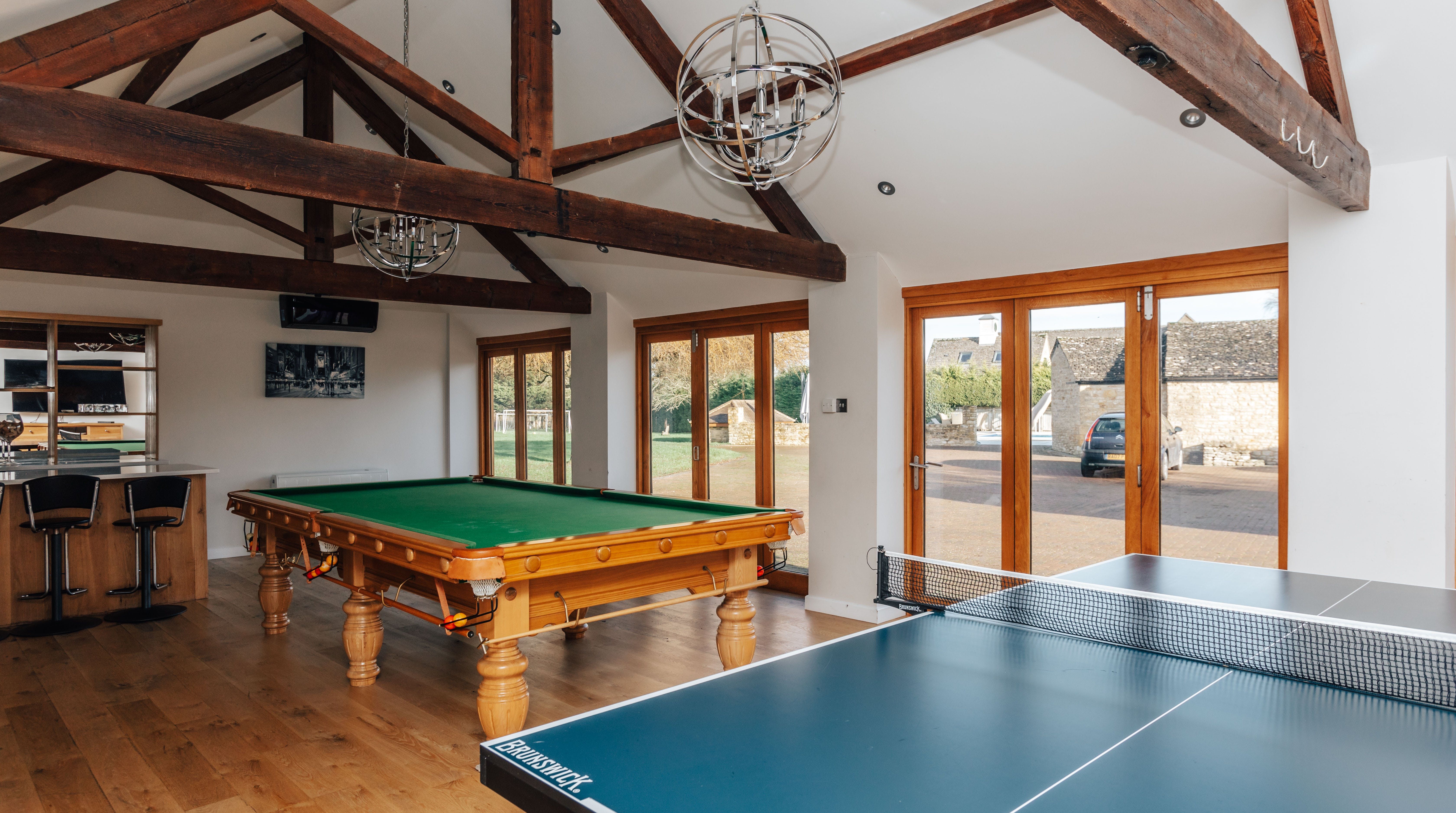 There are parts of this expansive Grade-II listed home in the village of Long Hanborough that date back 900 years. There are others, however, that are more recent additions, especially in the two acres of grounds and various outbuildings that surround it. The large outdoor heated swimming pool is one of those, as is the adjacent hot tub and spa complex that includes a sauna and a steam room. The same can be said of the gym and games room, home to tables for ping pong and snooker. Elsewhere in the house, you'll find a record player and board games to try next to the warmth of the log burner, as well as a huge kitchen with an equally large skylight above it bathing the space in natural light. The Cotswolds AONB starts mere metres away, so there's no shortage of walking routes with which to fill warm afternoons. There are historic attractions aplenty nearby too, including Blenheim Palace eleven minutes' drive away.