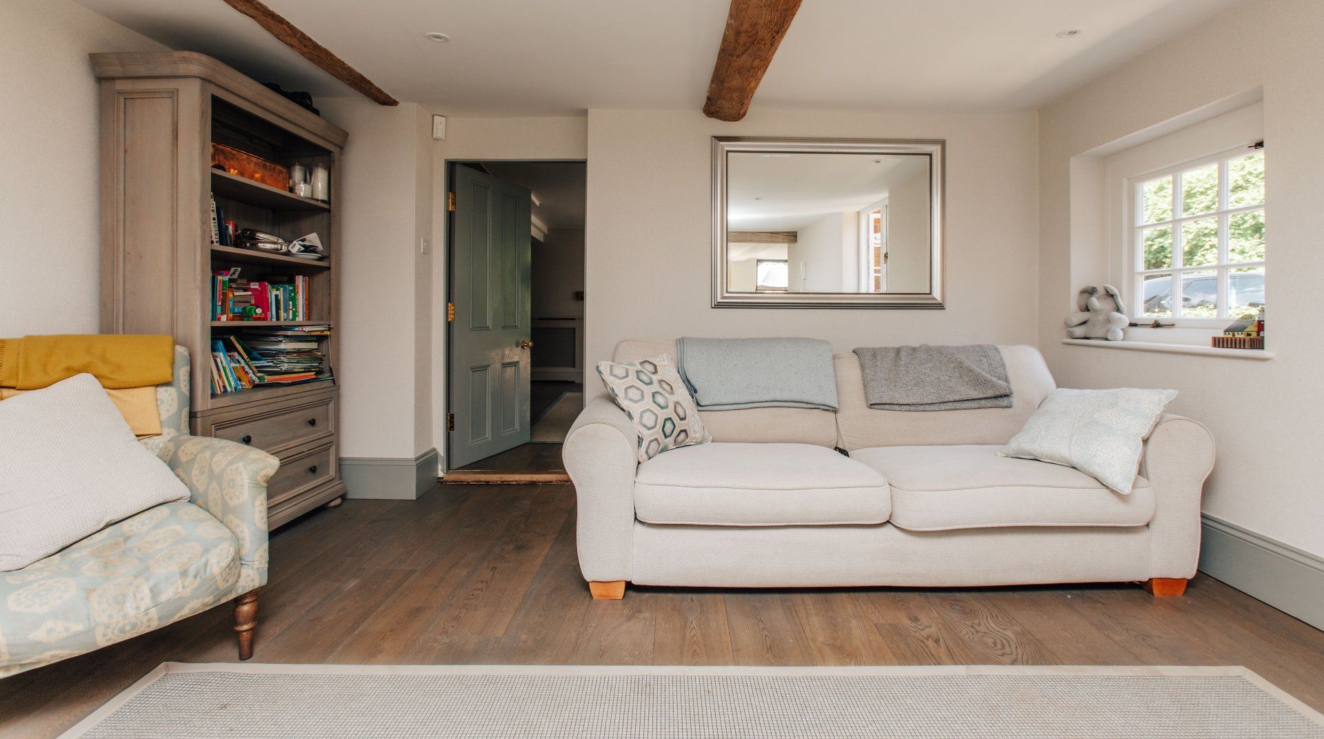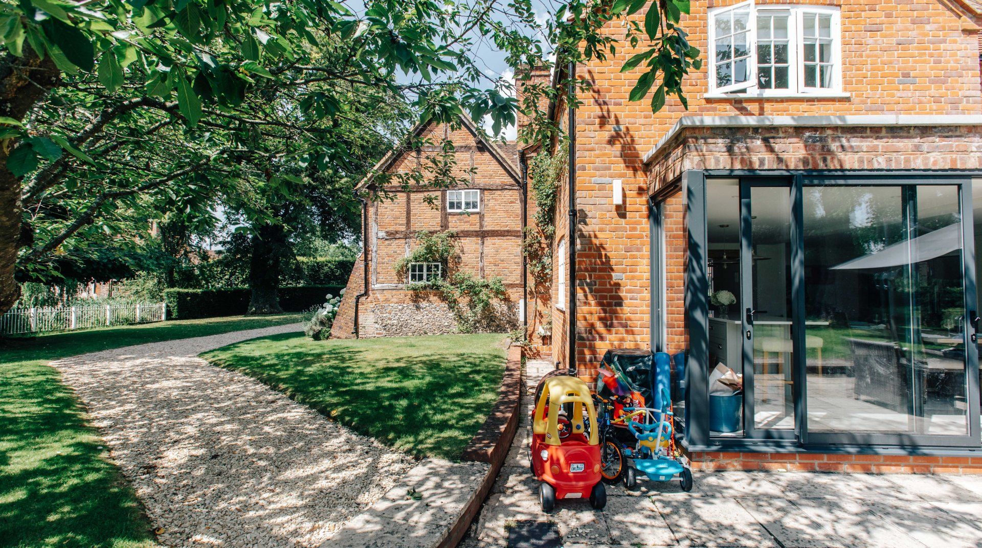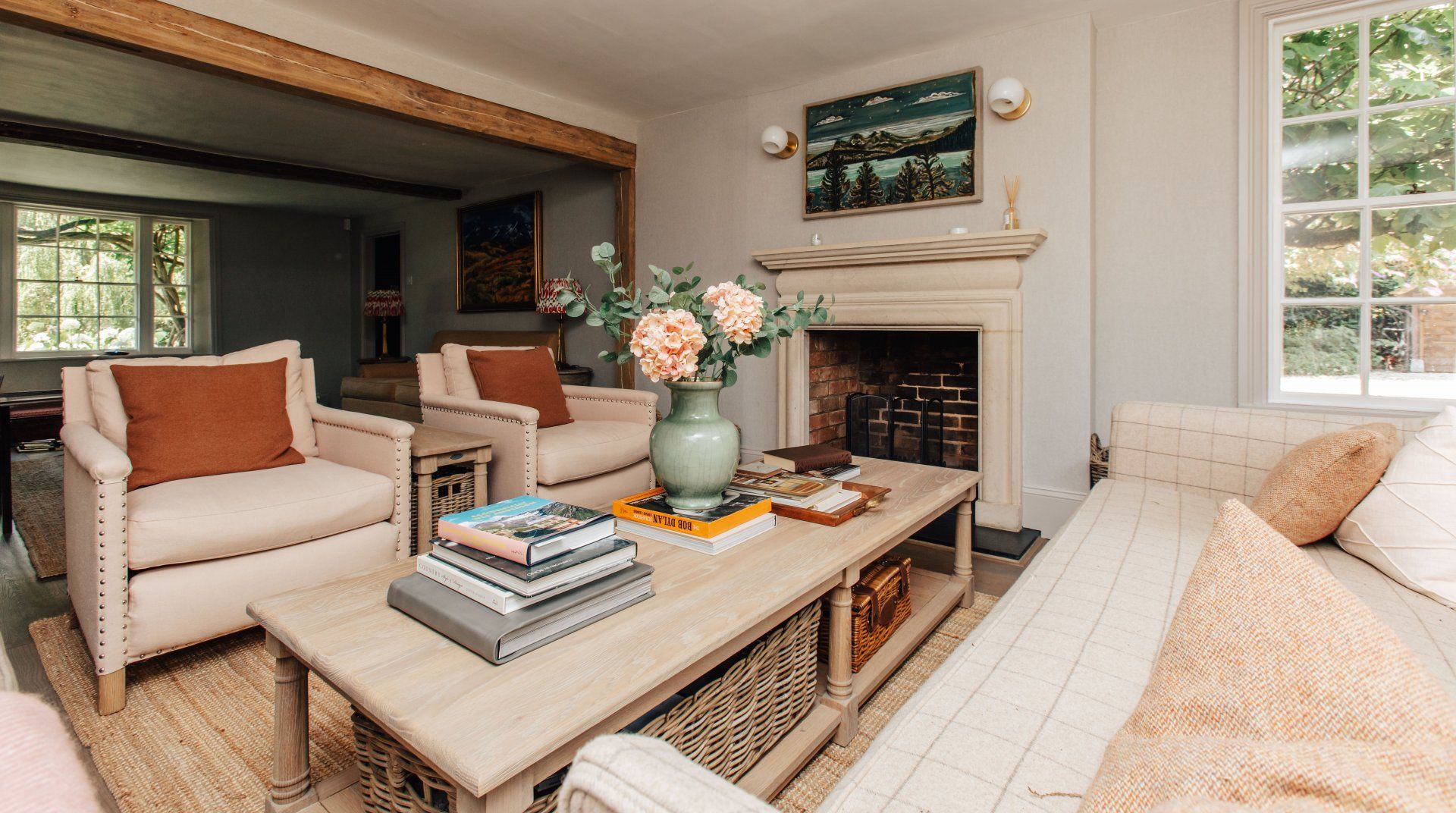 Picture a quiet village in the Chiltern Hills, with a gorgeous redbrick house, clematis scaling its exterior and a bloom of white hydrangea to greet you upon entry. Fortunately, it’s not too good to be true, you’ll find this idyllic escape on the cusp of Sonning Common. Inside, it’s a sophisticated blend of modern touches and traditional country style, with carefully restored original timber beams for added charm. A light, bright kitchen gives way to the acre of gardens—the real star of the show. While the little ones are enthralled by the play area and the big kids are practicing their swings at the golf net, start up the wood-fired pizza oven or go apple picking in the fruit orchard. On balmy Thursday evenings during the summer, there’s a tractor trailer pub crawl but if you fancy staying closer to home, you’ll find a cosy inn just across the road.