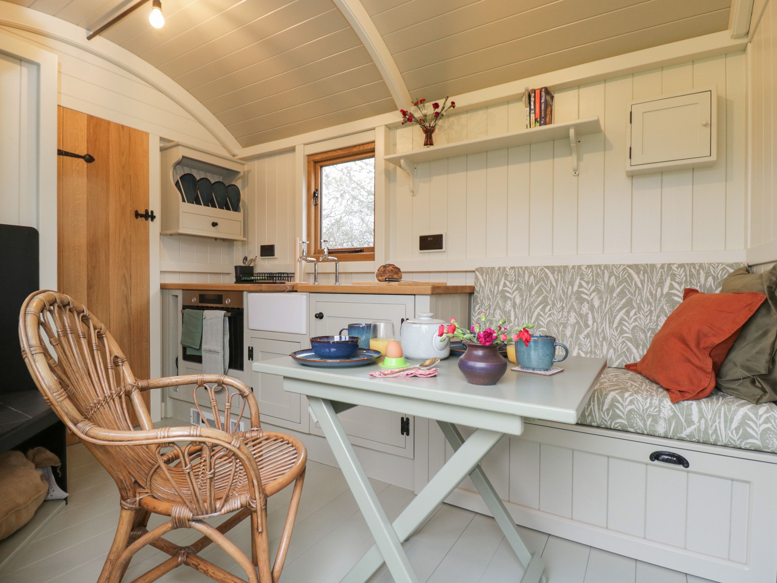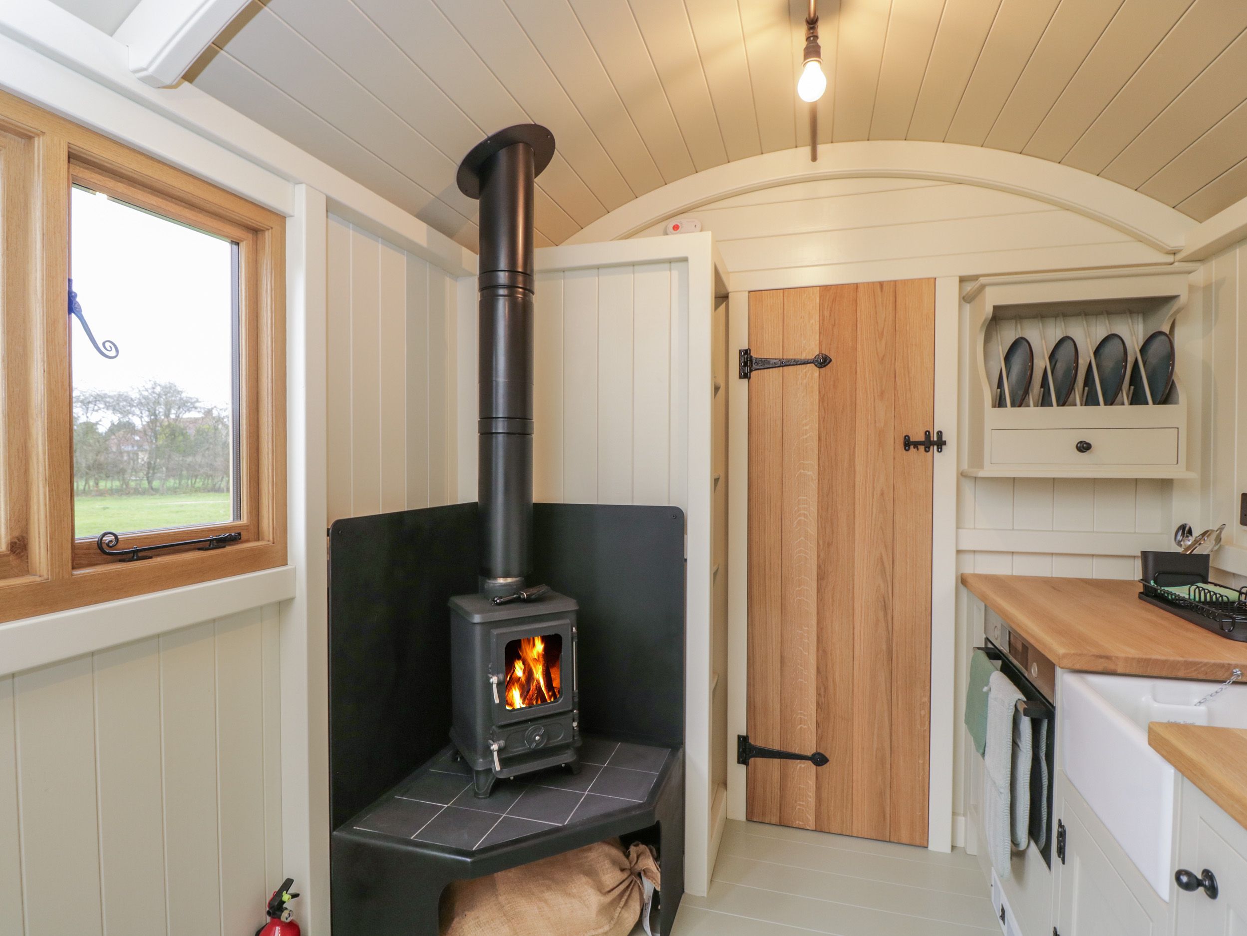 Amenities Electric heating. Combi oven/microwave, 2-ring plug-in hob, fridge, kettle, toaster. WiFi. Fuel, power, and starter pack for woodburning stove inc. in rent. Bed linen and towels inc. in rent. Off-road parking available. EV charging available. Front private gravel with furniture. Communal lawn. Secure bike storage. Sorry, no pets and no smoking. Shop 2.5 miles, pub 0.4 miles. Note: Although this a single-storey property, there are a few steps up to entrance, please take care. Note: There is no TV at this property. Note: This property has a Good Housekeeping Bond of £200. Note: Additional charge for EV charging to be paid to owner. Note: This property can only sleep 2 Adults and 2 Children. Note: Guests can use natural swim pond - times need to be coordinated with owner, and children to be supervised at all times