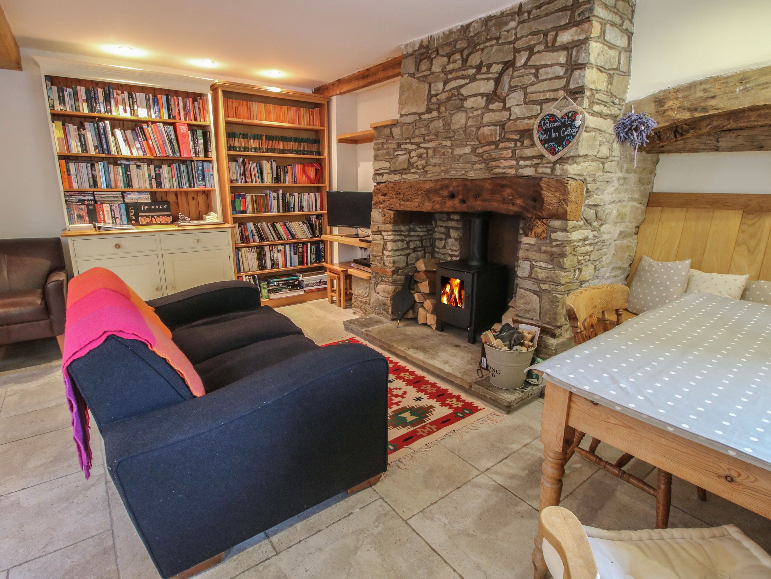 Holiday home New Inn Cottage consists of an open-plan living space with a Smart TV, DVD player, radio, selection of books, woodburning stove, dining seating for two, and a kitchen with an electric AGA, hob, fridge, dishwasher, kettle, toaster, coffee maker. The bedroom is king-size, with an en-suite walk-in shower, basin, and WC. Outside, there is a non-enclosed side garden with lawn, furniture, and off-road parking for one car. One well-behaved pet is welcome. Sorry, no smoking. WiFi, fuel, power, starter pack for woodburning stove, bed linen and towels are included. Shop 3.6 miles, pub 0.1 miles. Enjoy a memorable escape to Shropshire at New Inn Cottage. Note: The property is attached to the owner's home. Note: From the kitchen, there are four steps to the rear door, please take care. Note: In keeping with its character, the cottage does have some low beams and steep stairs. Note: No children due to the stairs. Note: The bedroom has some low beams.