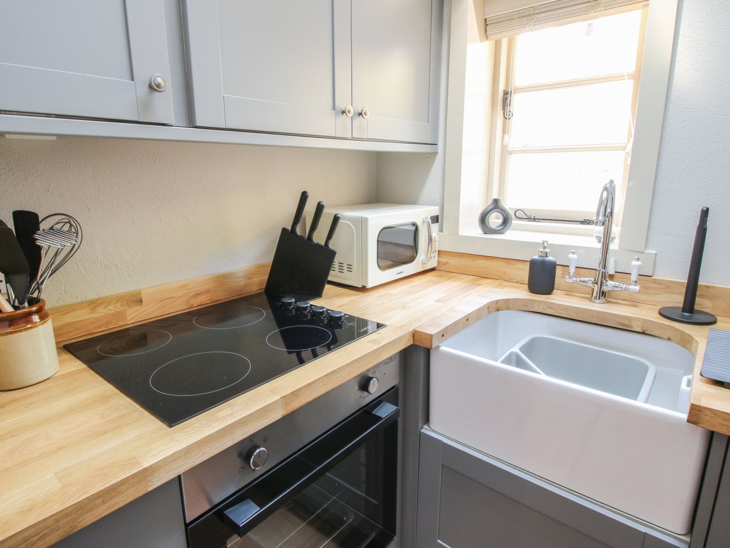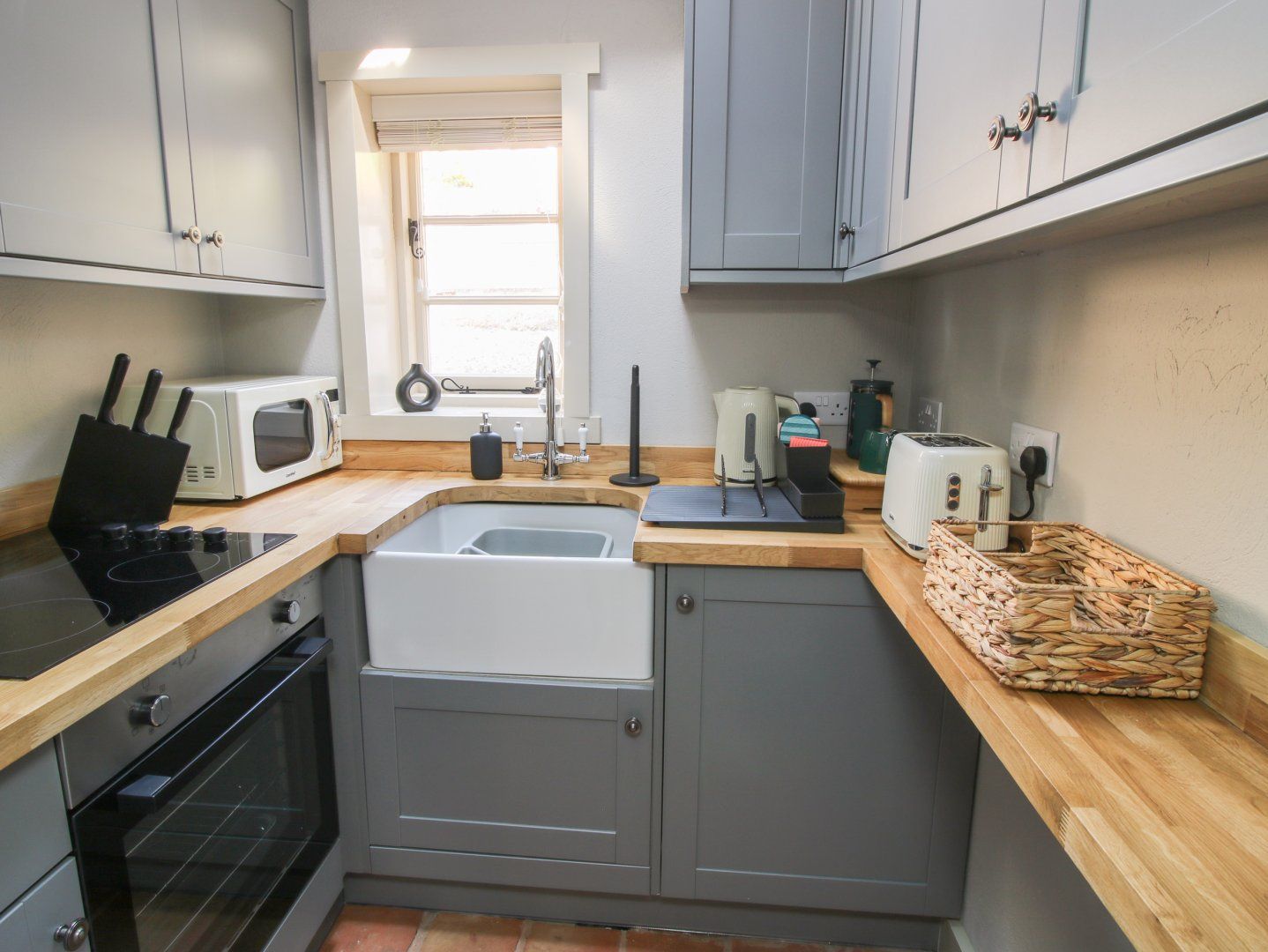 Amenities Electric central heating. Electric oven and hob, microwave, fridge, espresso machine. 2 x Smart TV, WiFi, Amazon Alexa. Fuel, power inc. in rent. Bed linen and towels inc. in rent. Highchair and stairgate available on request. Allocated parking for 1 car across the road. Front patio with furniture and water feature. One well-behaved pet welcome. Sorry, no smoking. Shop 0.8 miles, pub 0.1 mile. Note: Due to the age of the property, there are some low ceilings and steps throughout.
