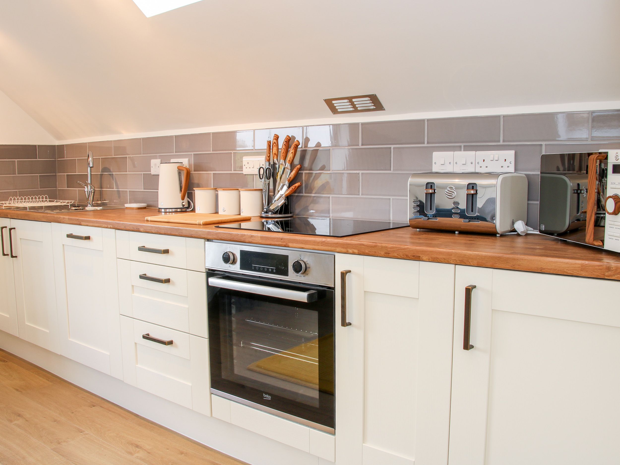 First-floor annex. Studio-style layout with super-king-size bed, kitchen, dining area and sitting area with electric fire. Shower room with walk-in shower, basin and WC. Ground-floor utility. Garage is available to store bicycles, walking boots and wet clothes.