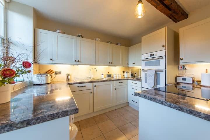 This grade II listed Georgian House in Ludlow is everything we look for in a quiet village getaway. Rebuilt and lived in by former glove makers from the late 1600s, this home is steeped in history, dating back to the Civil War – and doesn't it show. There are heaps of original features to these cosy digs. We especially love the handmade oak doors, wood beam ceilings and intricate fireplace that have been professionally restored by master craftsmen. While these period features add interest, the comfy living room is our favourite spot, with its realistic optimyst stove and large L-shaped sofa. Toast up those toes in front of the fire with a good book and a glass of wine in hand – you'll feel all warm and homely in no time at all. Step outside of this 17th-century building and explore one of the loveliest market towns in England that's positively brimming with listed buildings, medieval castles and striking churches. Take a short twelve-minute walk up Corve Street to the town centre and explore this historic place for yourself.