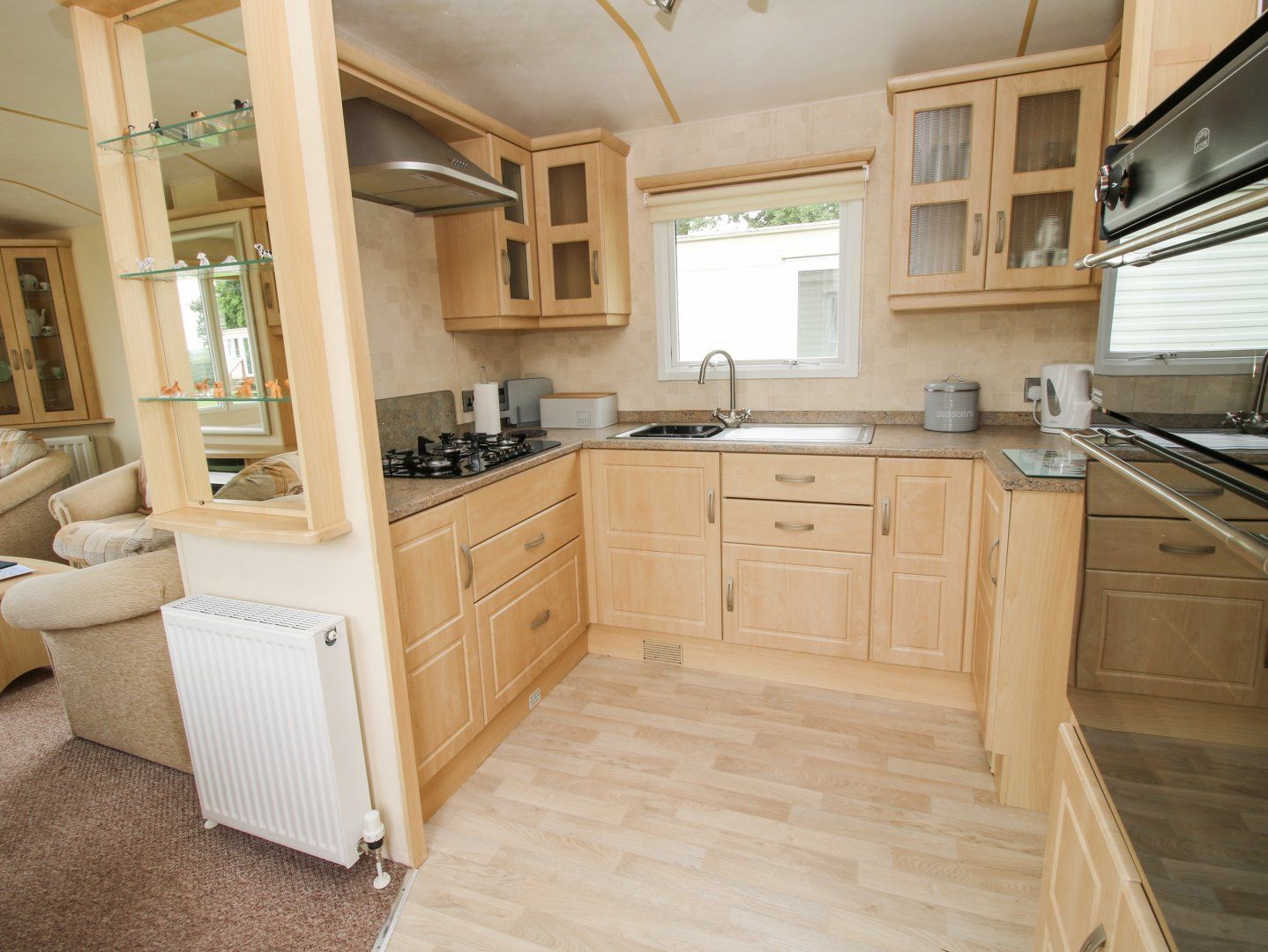 Single-storey. Two bedrooms: 1 x double with TV and en-suite basin and WC, 1 x twin (zip/link, can be double on request). Shower room with walk-in shower, basin and WC. Open-plan living space with kitchen, dining area and sitting area with gas fire
