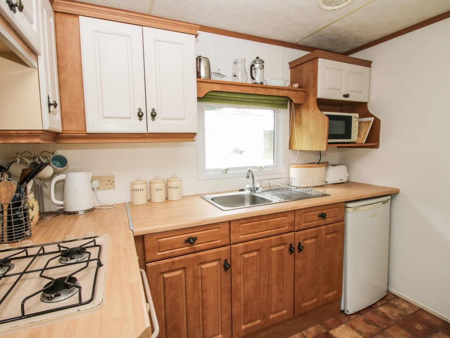 Holiday home The living areas in this single-storey caravan consist of an open-plan living space with kitchen equipped with gas oven and hob, microwave and fridge with ice-box, a dining area for four and a sitting area with TV and gas fire. The bedrooms consist of a double and a twin serviced by a shower room. Outside there is off-road parking for 2 cars and a communal garden with lawn, trampolines, swings and slides. On-site there is a shop and there is a pub in 1.3 miles. One well-behaved dog welcome, but sorry, no smoking. Highchair available on request. WiFi, fuel, power, bed linen and towels are all included in the price. Head to countryside with your family at 5 Old Orchard. Note: There is an on-suite laundry room available at a local charge. Note: There is an on-site freezer, as the property only has an ice-box.