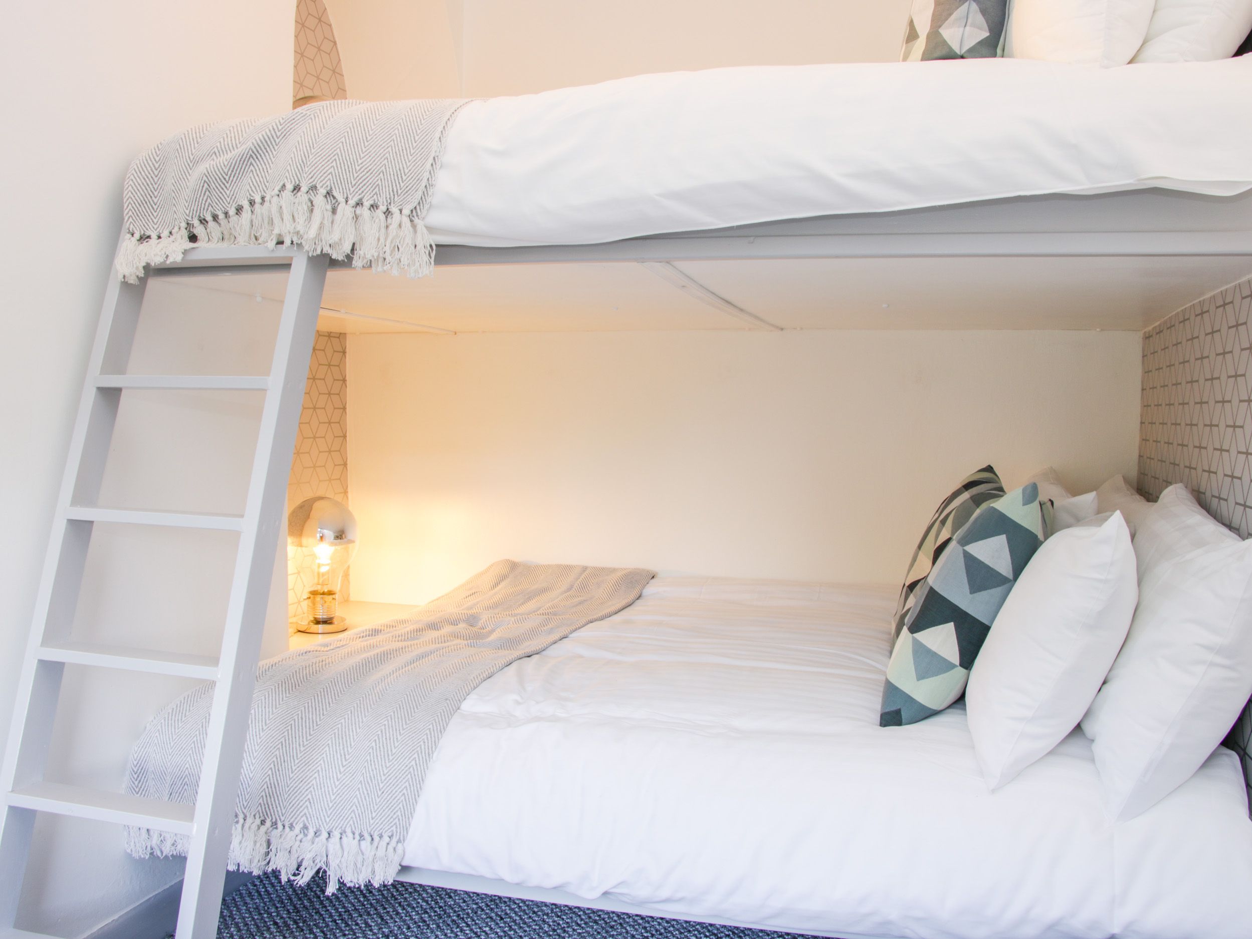 Accomodation Details Over three floors. Four bedrooms: 1 x first-floor super-king-size, 1 x second-floor super-king-size, 1 x first-floor double, 1 x second-floor double adult bunks. Bathroom with bath, separate shower, basin, and WC. Ground-floor shower room with shower, basin, and WC. Open-plan living space with kitchen, dining, and living area with woodburning stove.