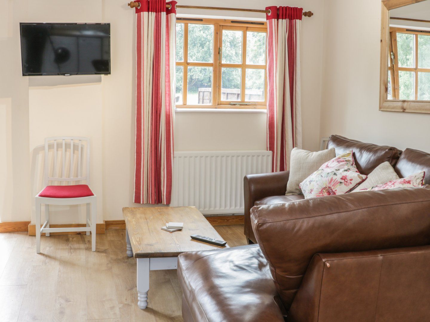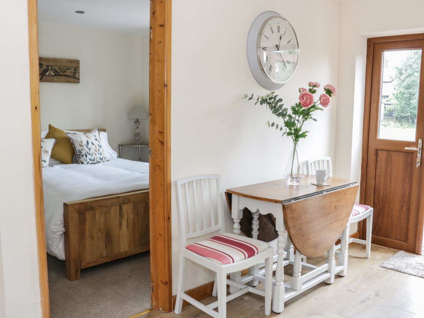 All ground floor. Two bedrooms: 1 x king-size double, 1 x twin. Bathroom with bath, shower over, basin and WC. Open-plan living room with kitchen, dining area and sitting area.