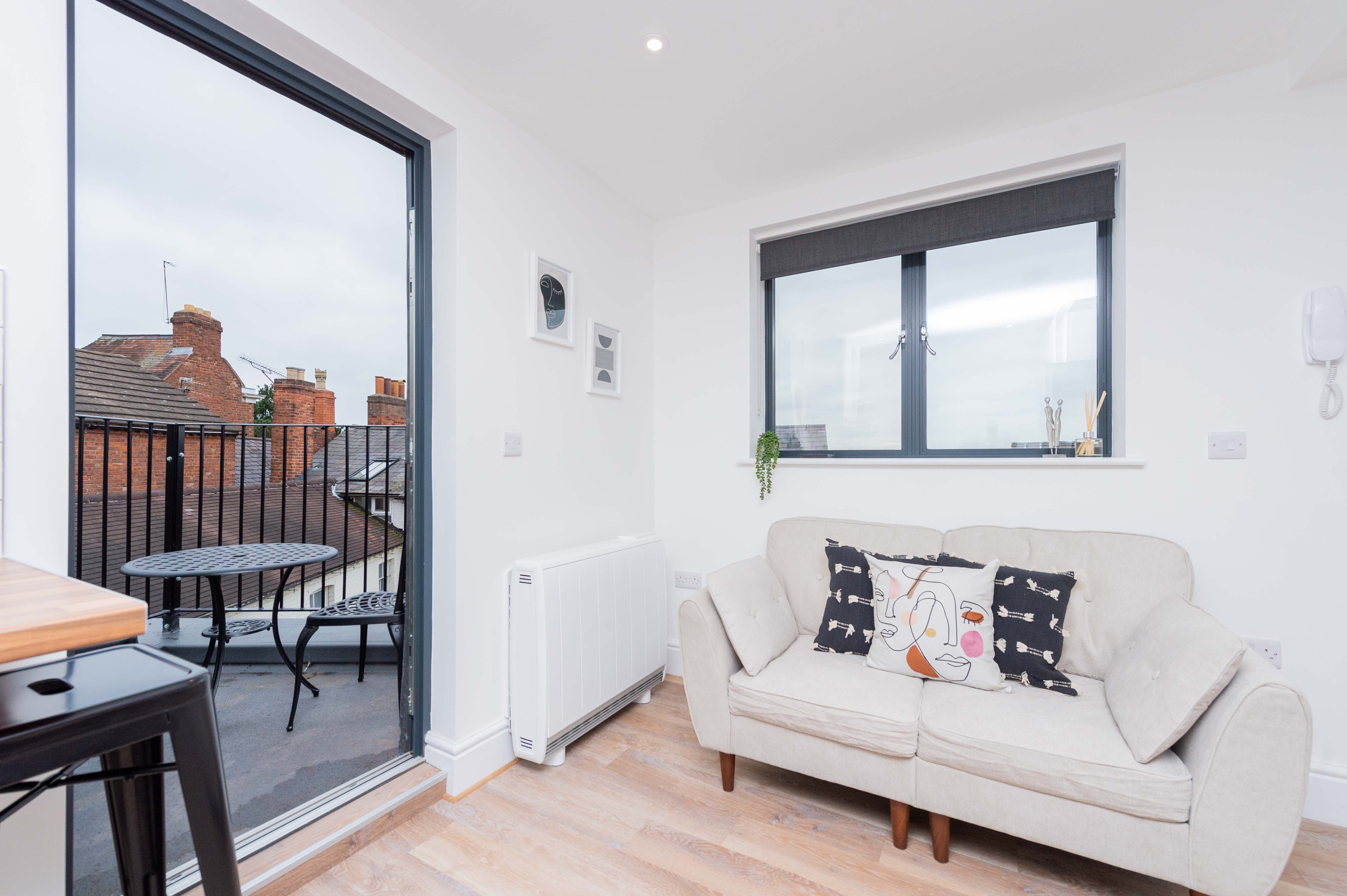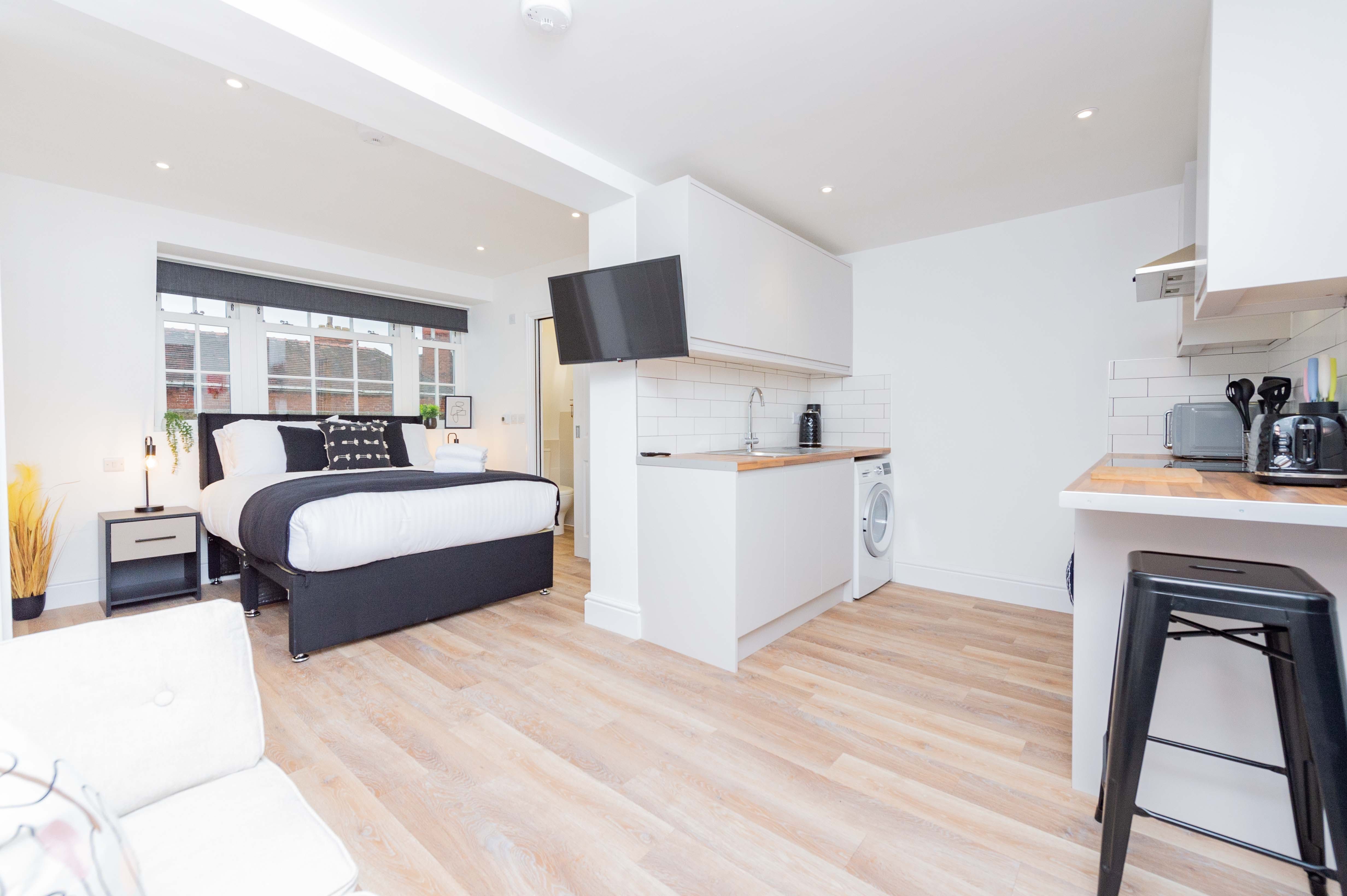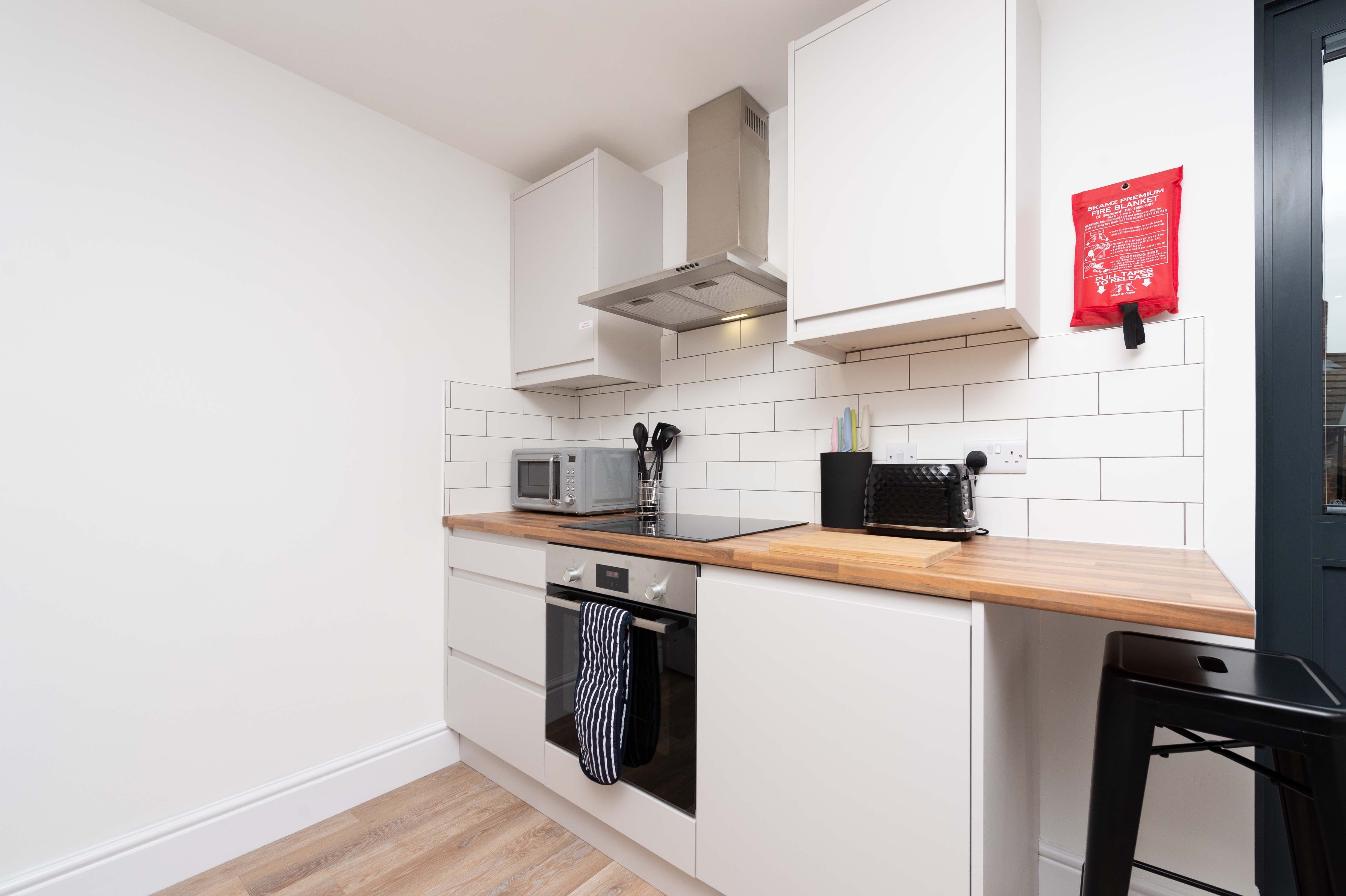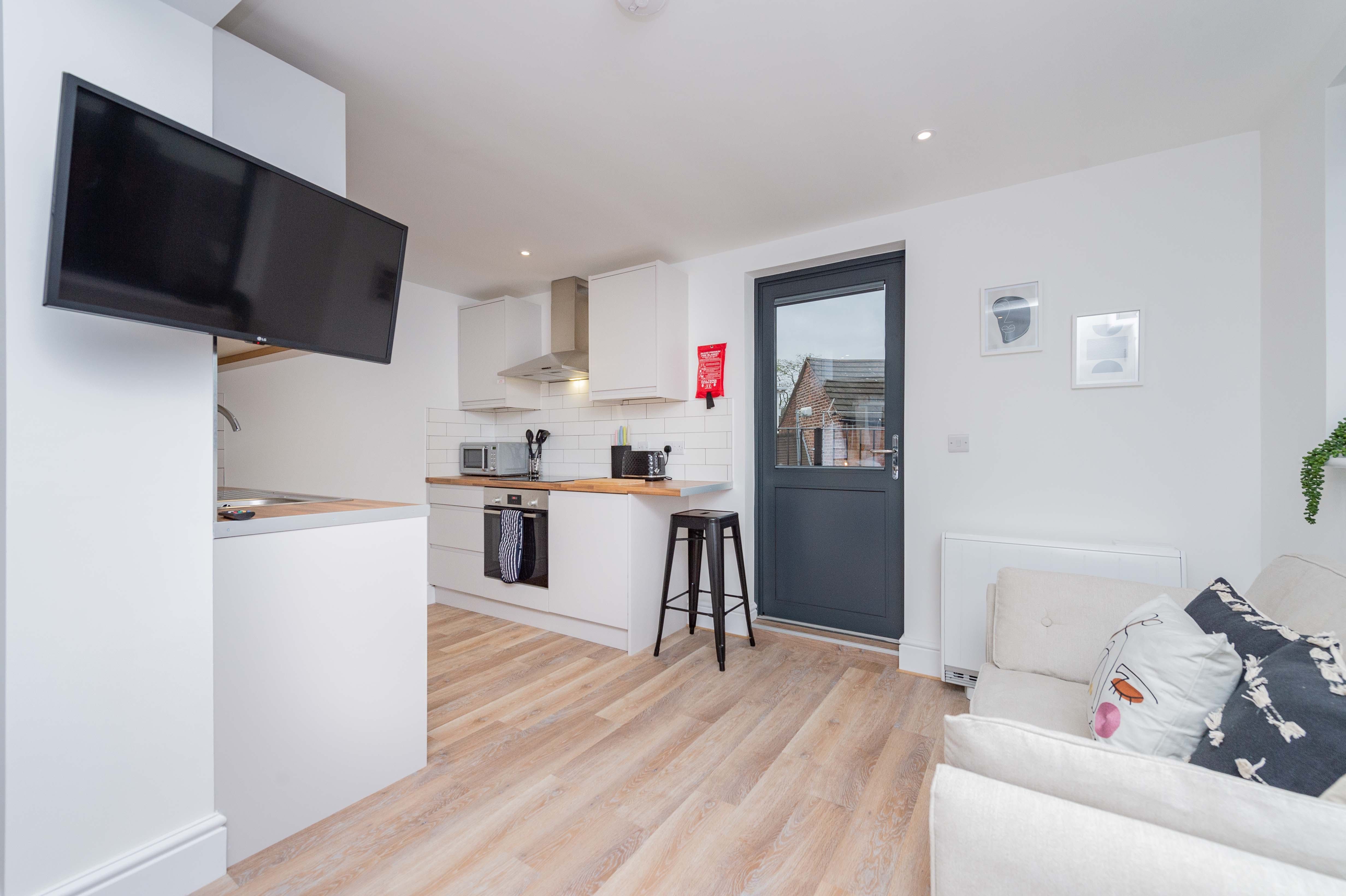The open-plan kitchen, living and sleeping space is bright and minimal, with light pouring in from the windows on either end. Though this home is on the smaller side, you'll find it's fitted with everything you'll need for a getaway in the pretty market town – whether you're a comfort-seeking solo traveller or a couple seeking a cosy escape.