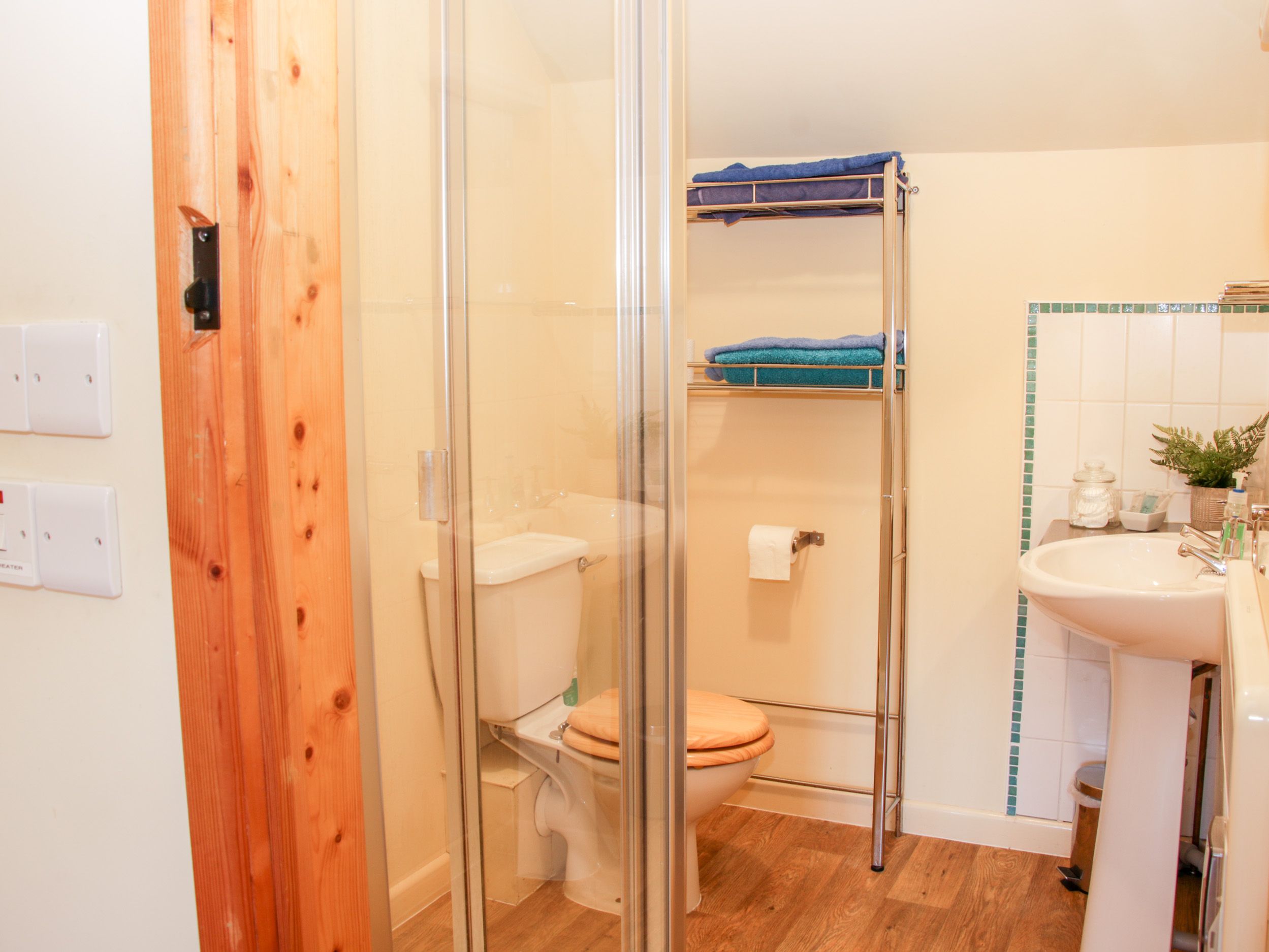 All on the first floor. One king-size bed (zip/link, can be twin upon request) with sitting area. Shower room with walk-in shower, basin and WC. Kitchen/diner