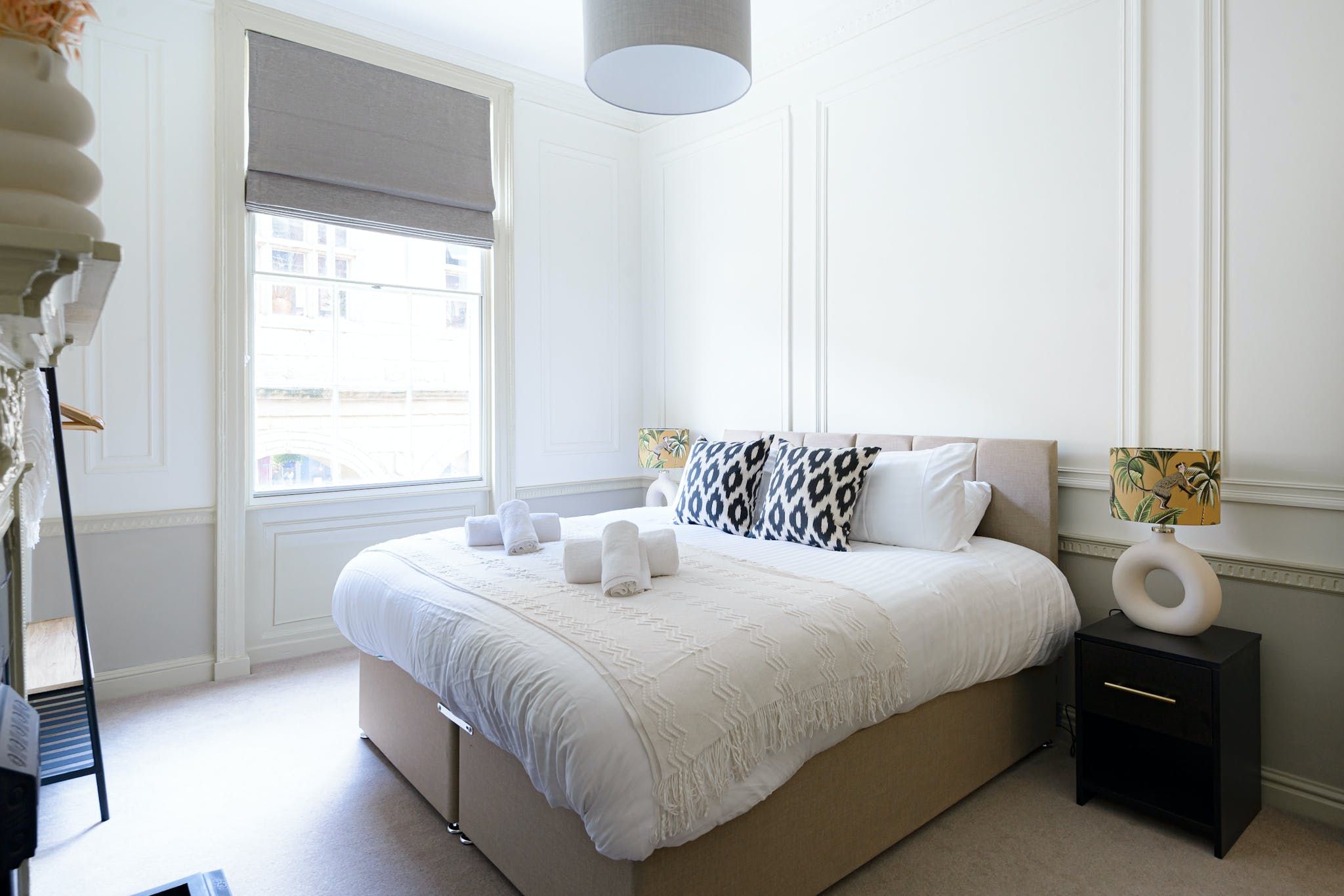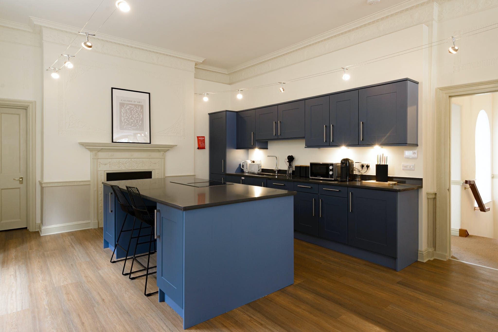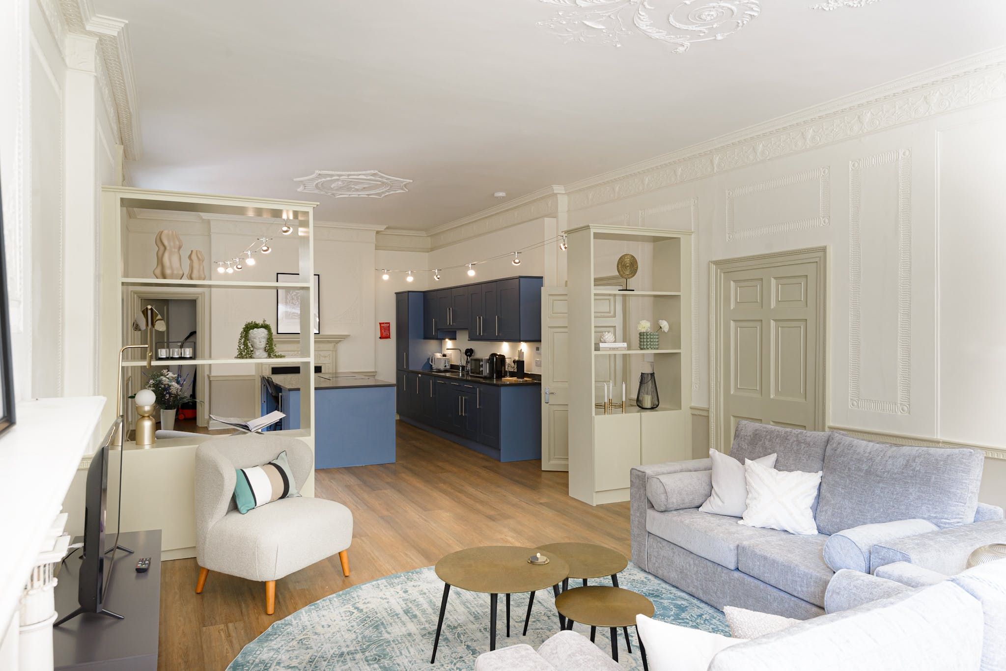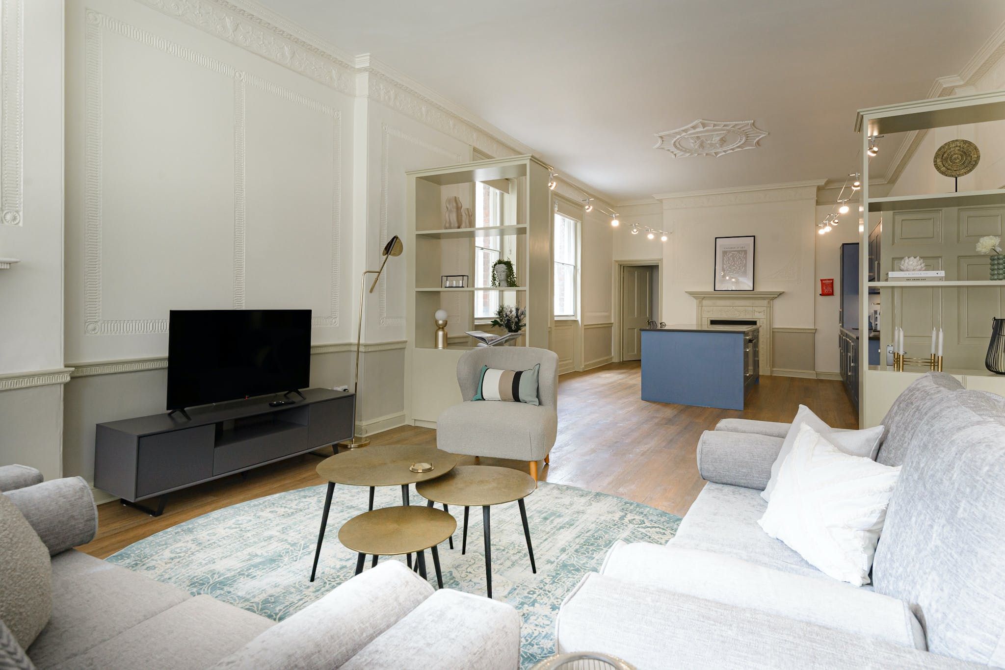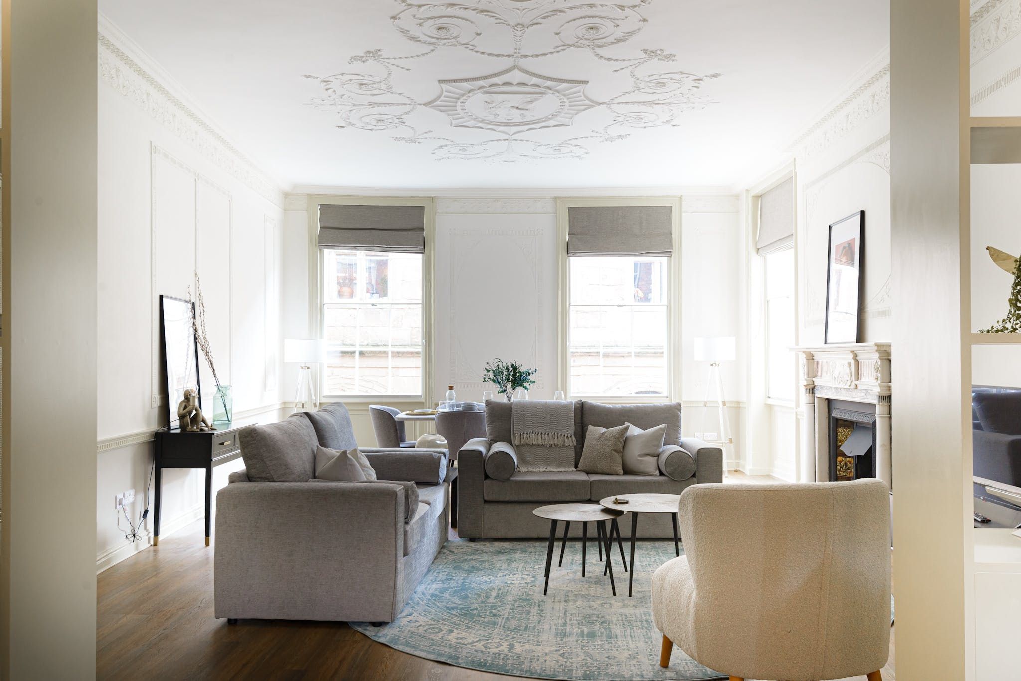 The design throughout is fresh and contemporary, with discernible mid-century influences visible in the furnishings. That being said, a few period features have been retained in the interior's modernisation, including embellishments on the ceiling, large sash windows and opulent fireplaces — sadly only ornamental, but still pretty nonetheless.