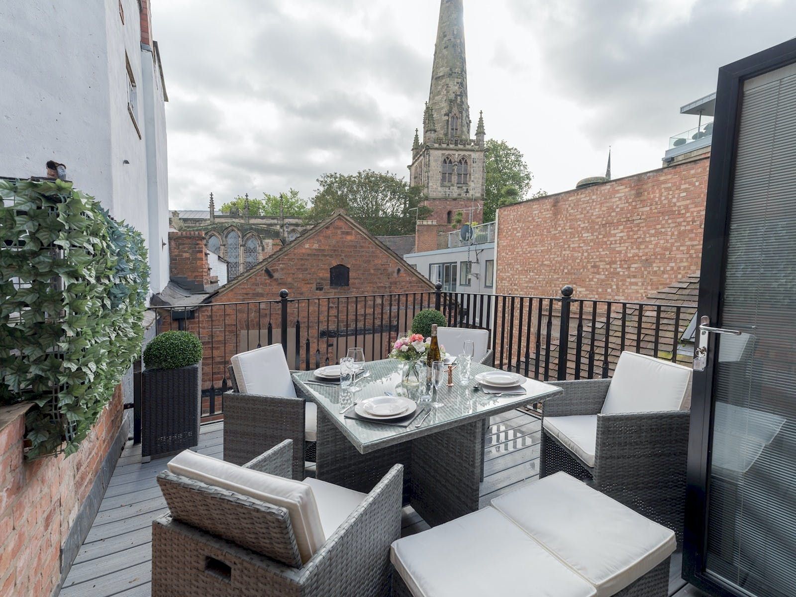 Amidst the historic streets of Shrewsbury, this apartment offers a contemporary sanctuary. There’s a terrace with outdoor seating for warm weather drinks. Inside, you’ll find light, space and all the essentials you could need for a relaxing stay. It’s worth noting you can hear some street noise inside the apartment, but we think the location more than makes up for it. Outside it’s just a short stroll to restaurants, bars, cafes and local sights. Plus, it you’re travelling by car, your host can arrange parking nearby for a small additional fee.