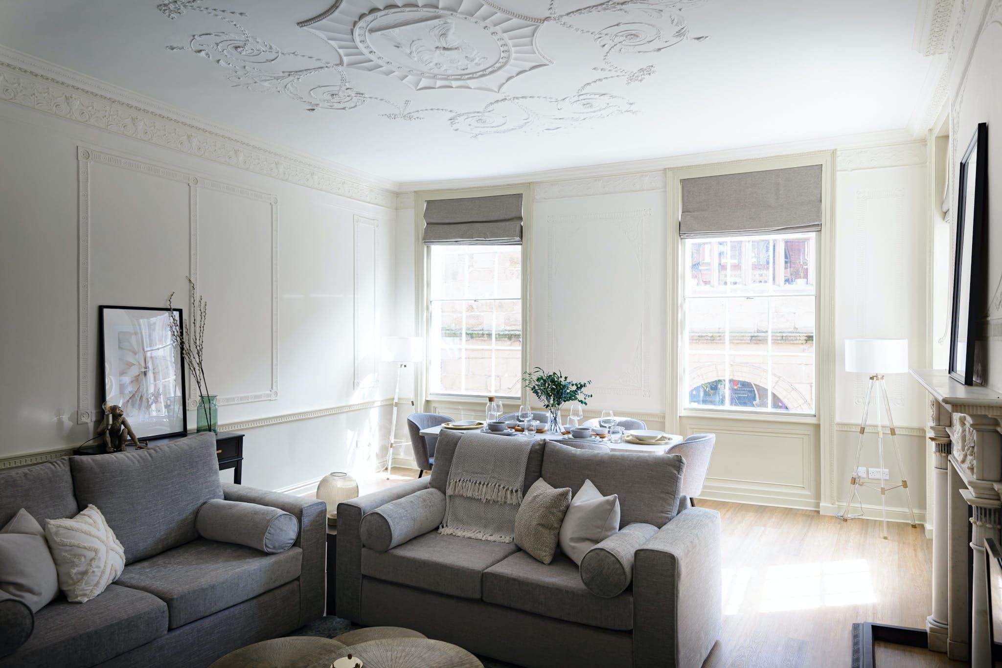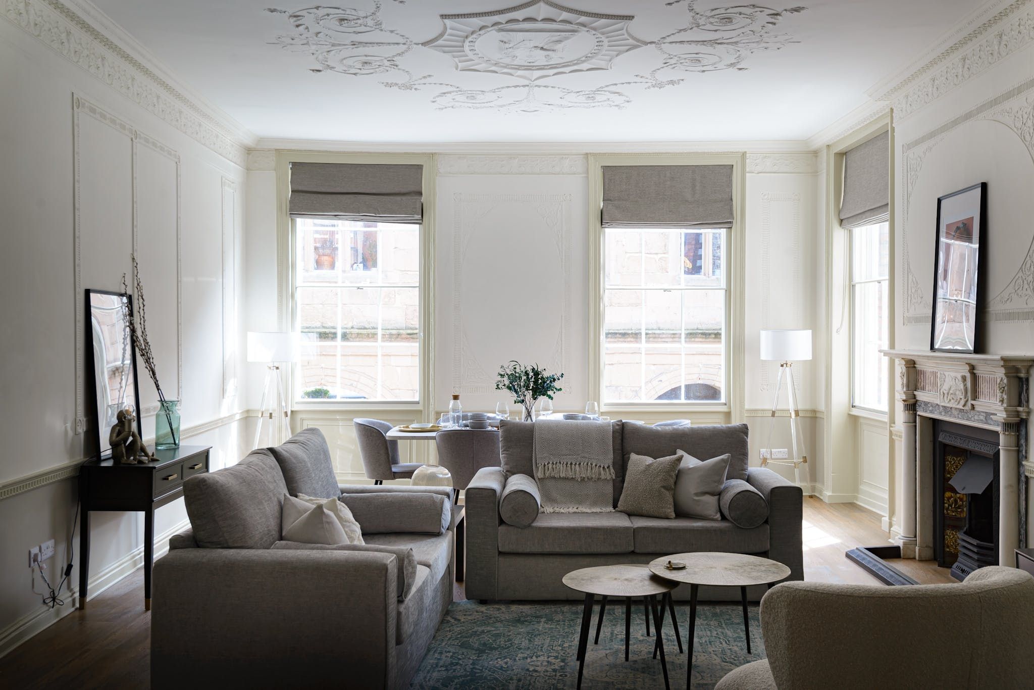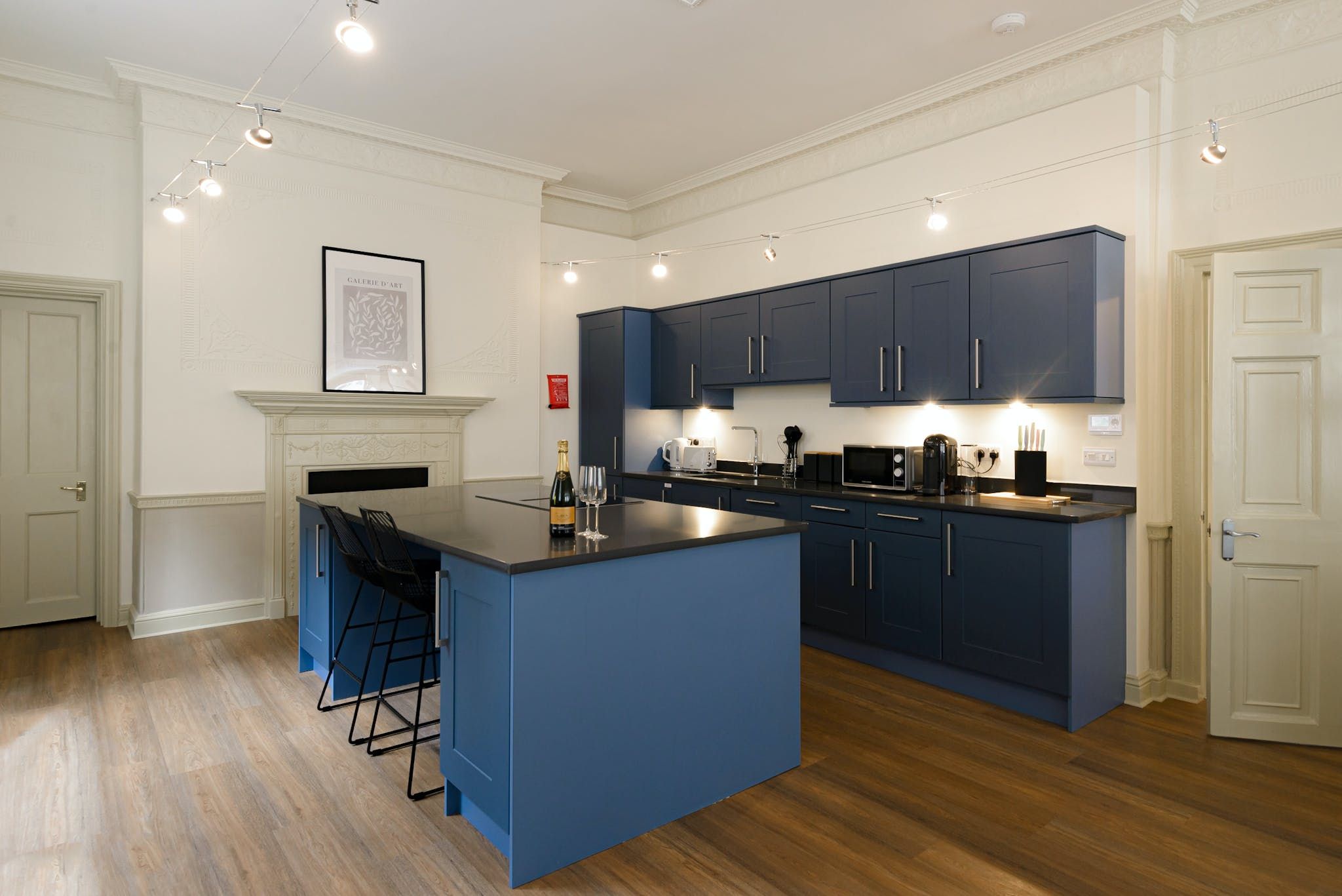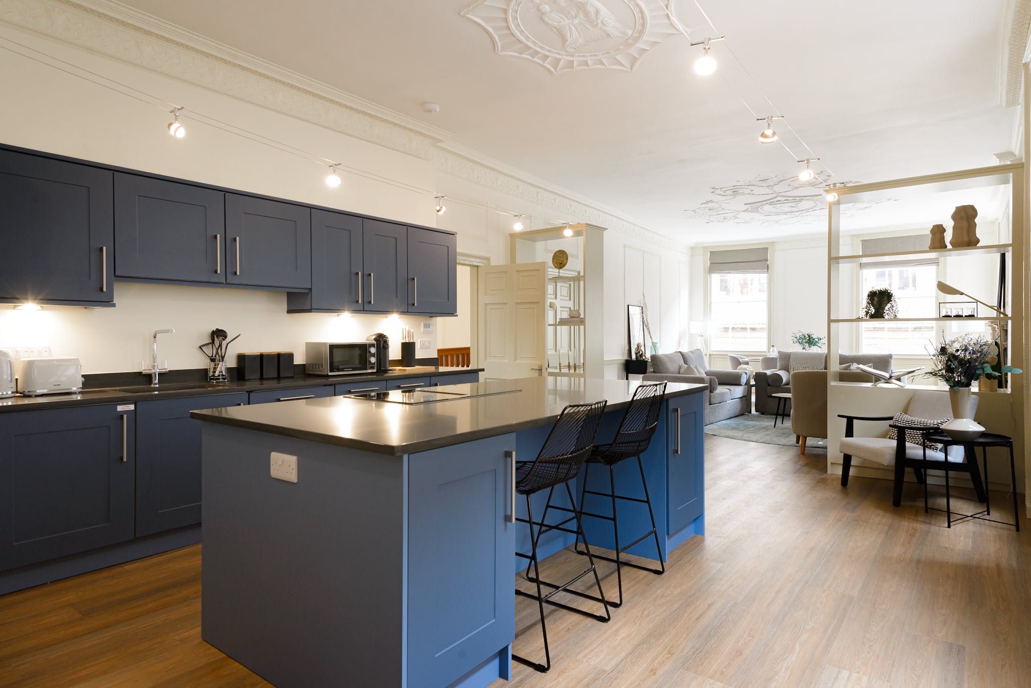 Enter to be immediately captivated by the bright and stylish interior – the open-plan living room and kitchen offer plenty of space for organising communal meals and quiet evenings of wine and movies on the plush sofa. The elegant dining table nestled by the large window will inspire you to rustle up delicious meals in the well-equipped kitchen and share them with your loved ones. We love the unique period details, including the fireplace and the opulent plaster artwork on the ceiling.