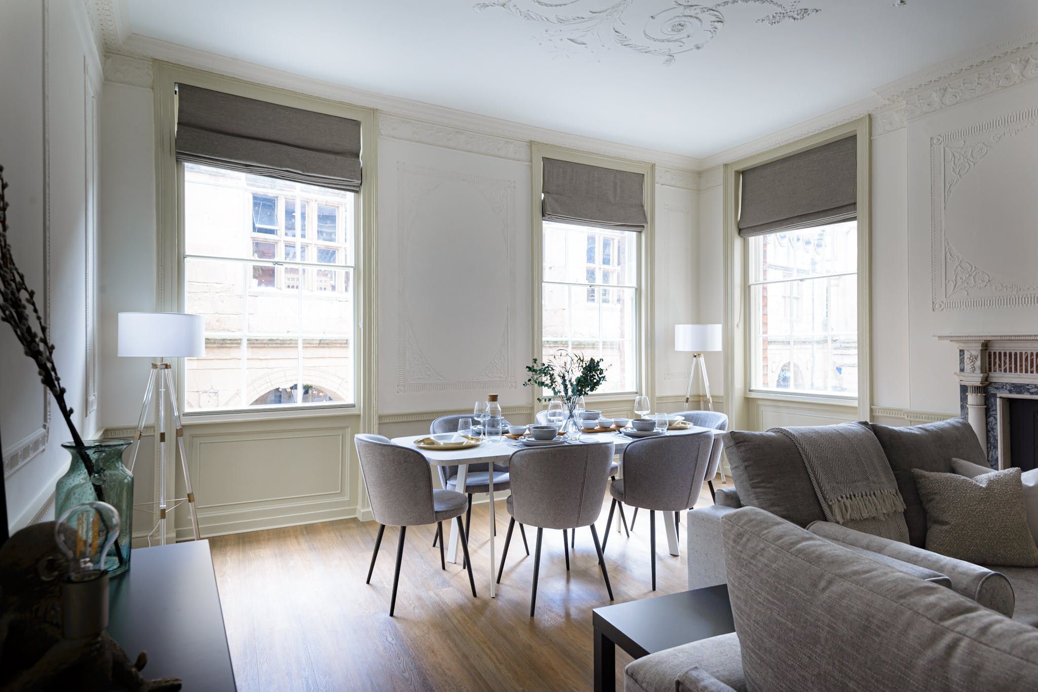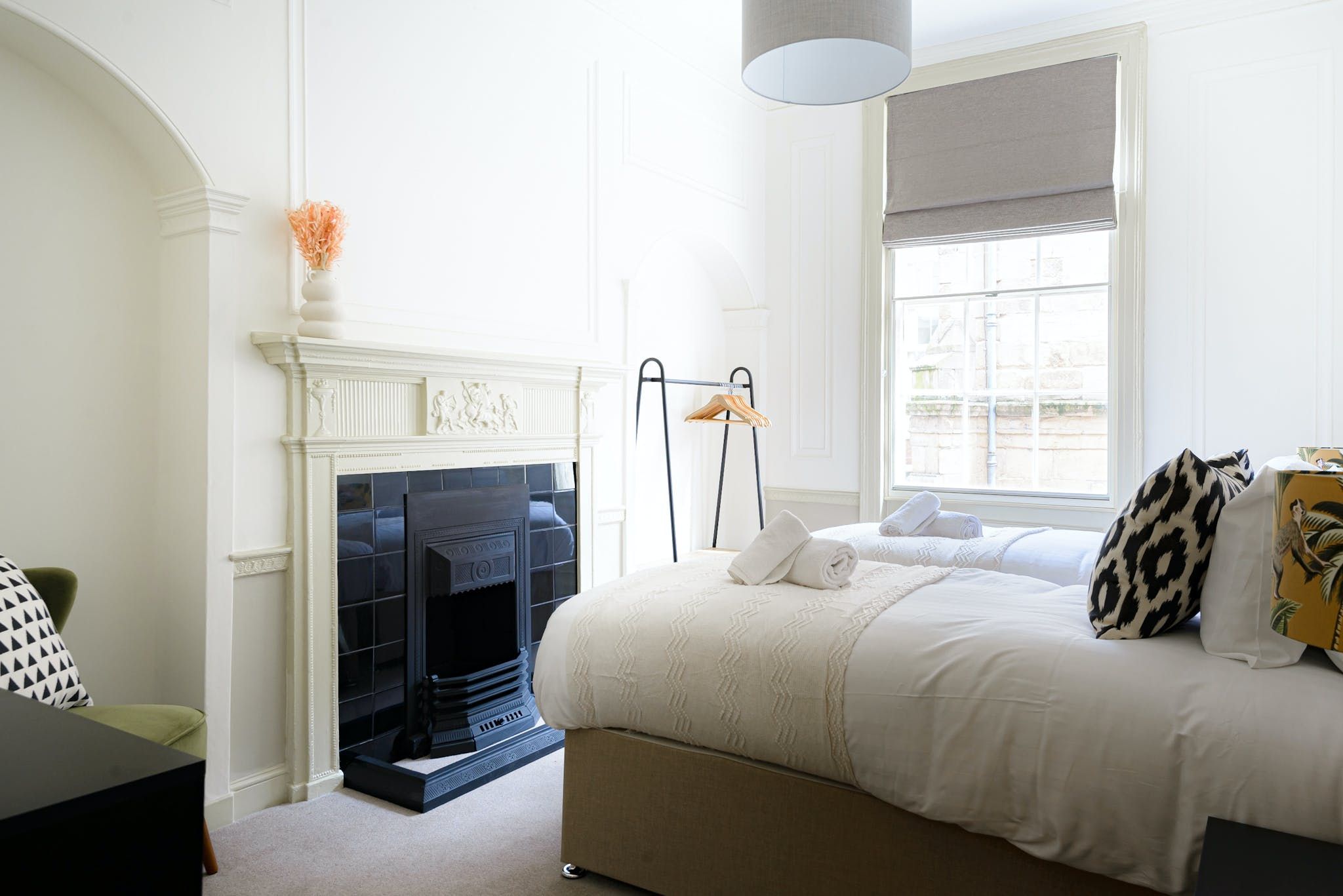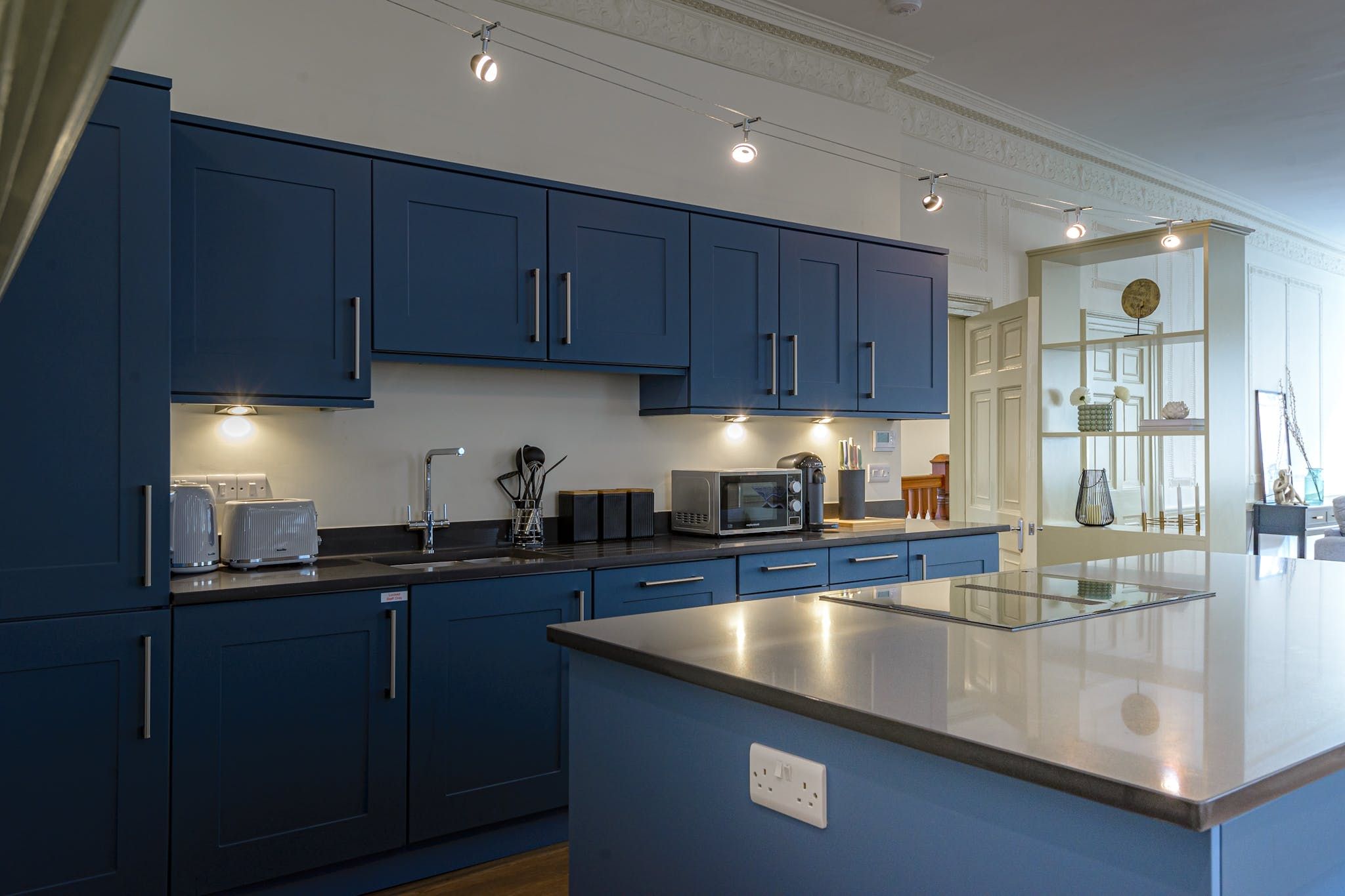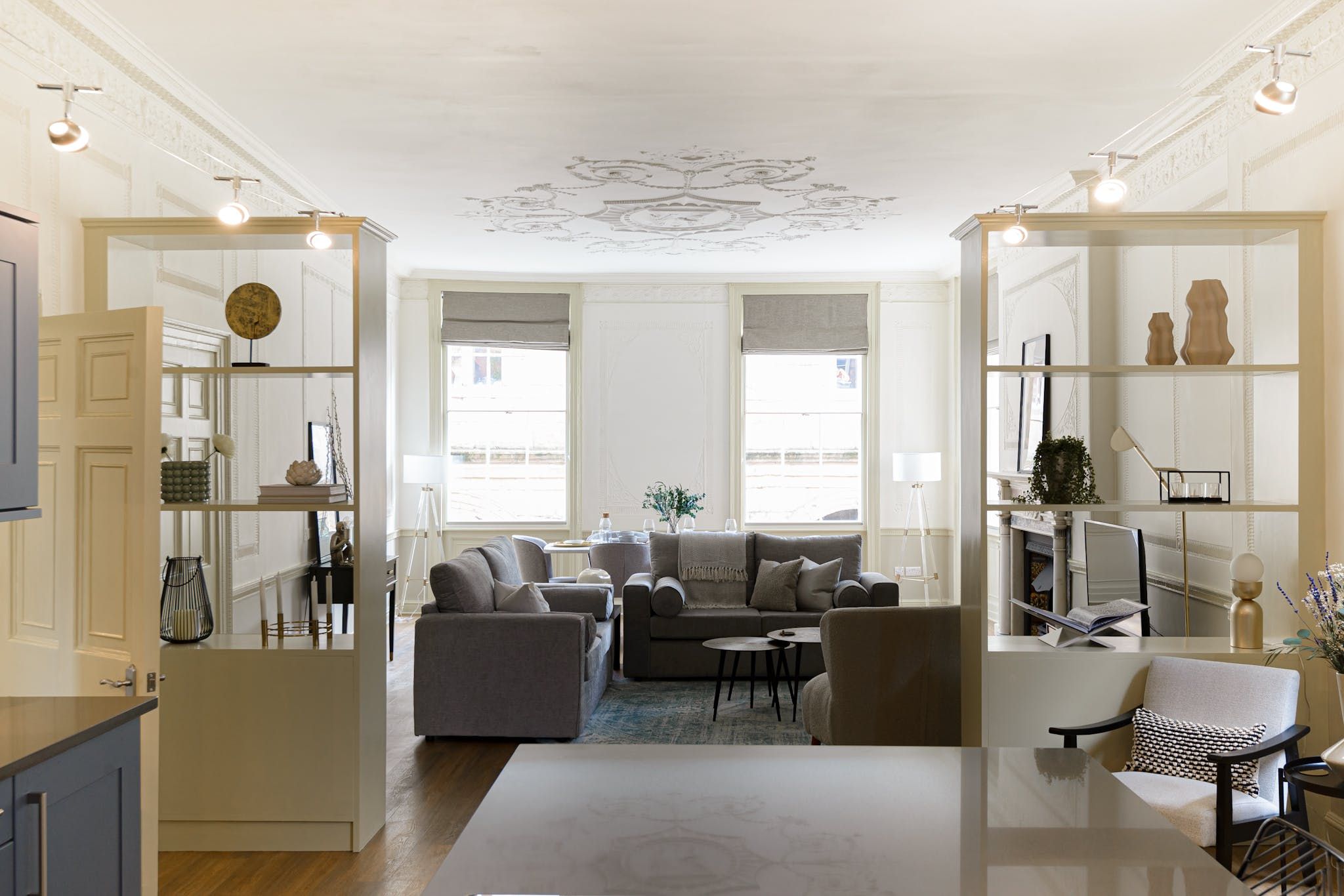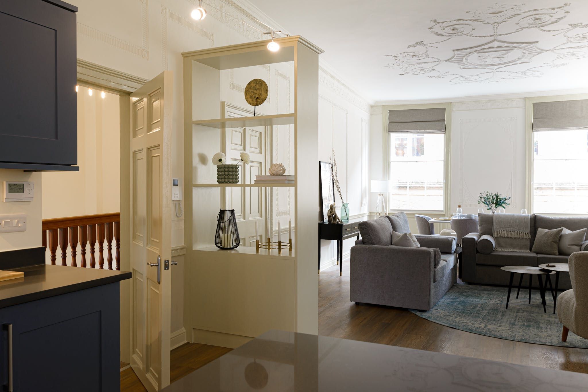 Enter to be immediately captivated by the bright and stylish interior – the open-plan living room and kitchen offer plenty of space for organising communal meals and quiet evenings of wine and movies on the plush sofa. The elegant dining table nestled by the large window will inspire you to rustle up delicious meals in the well-equipped kitchen and share them with your loved ones. We love the unique period details, including the fireplace and the opulent plaster artwork on the ceiling.