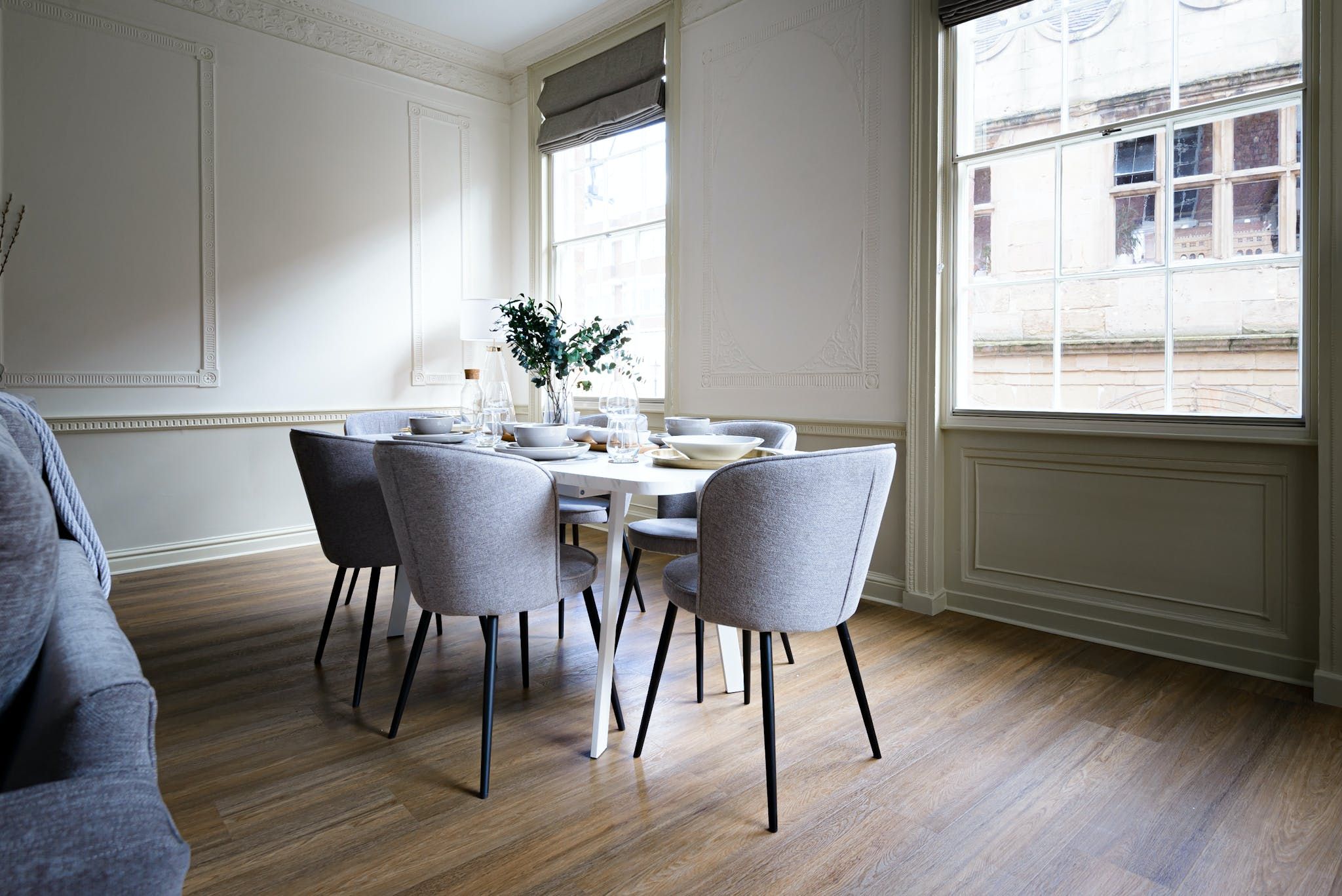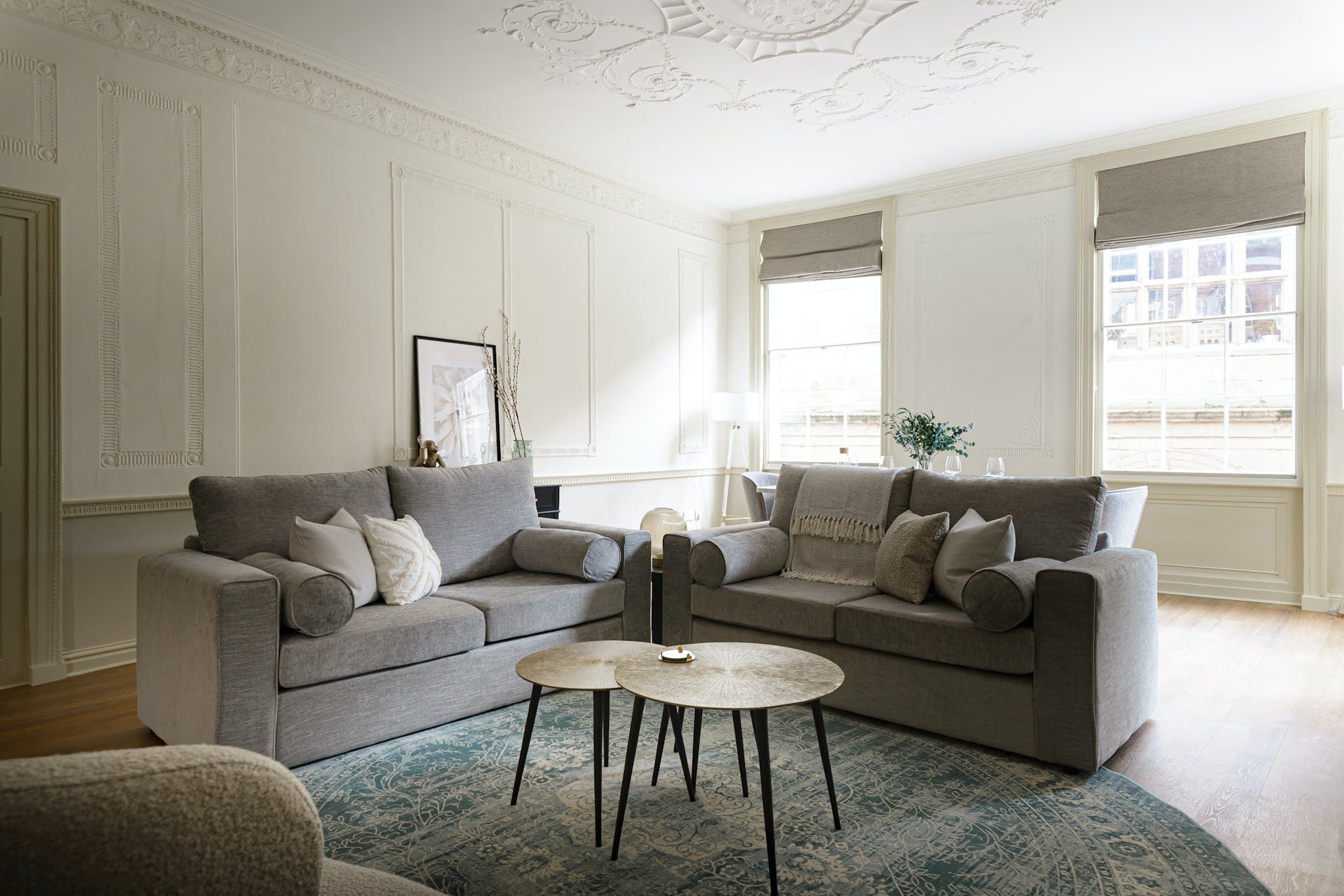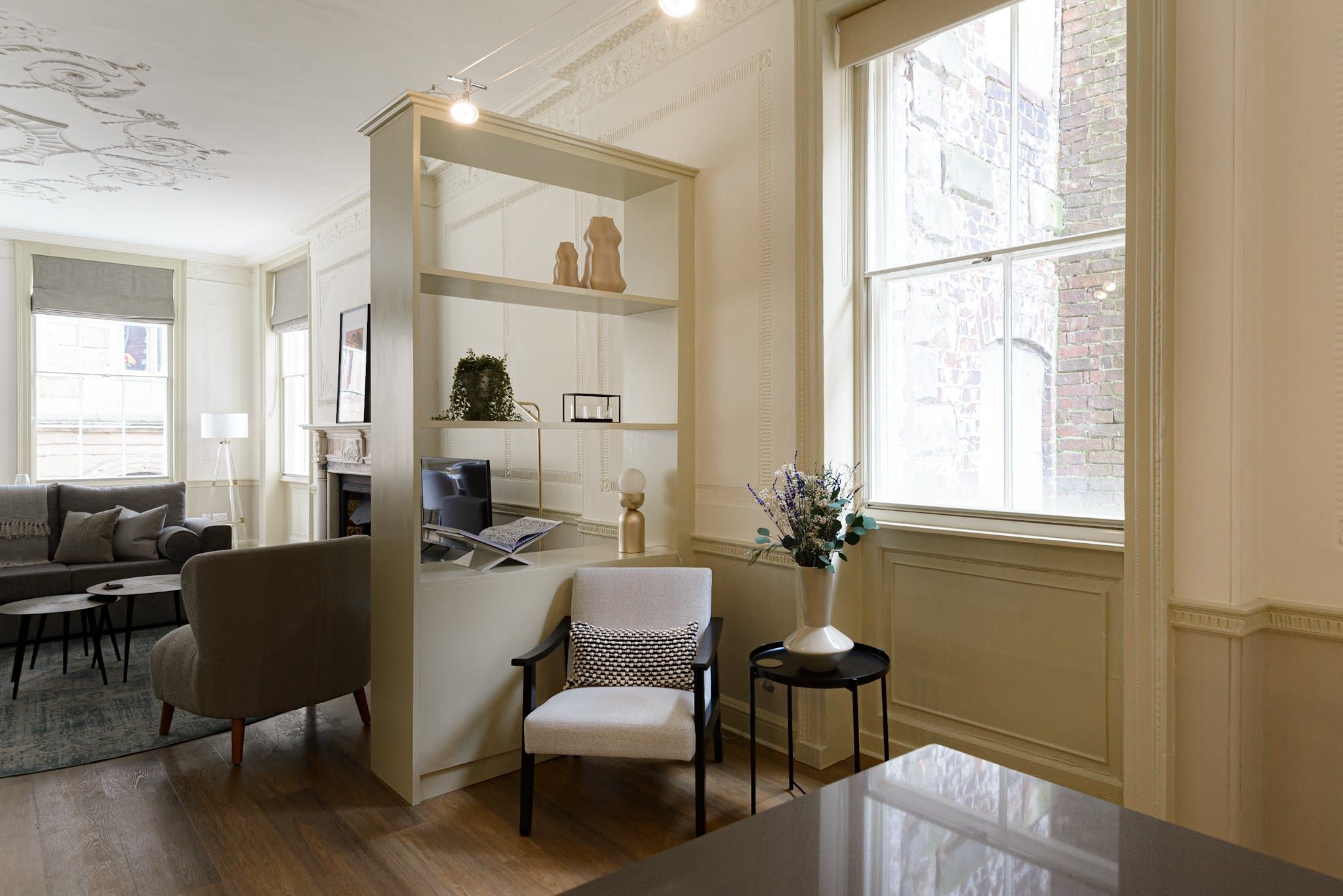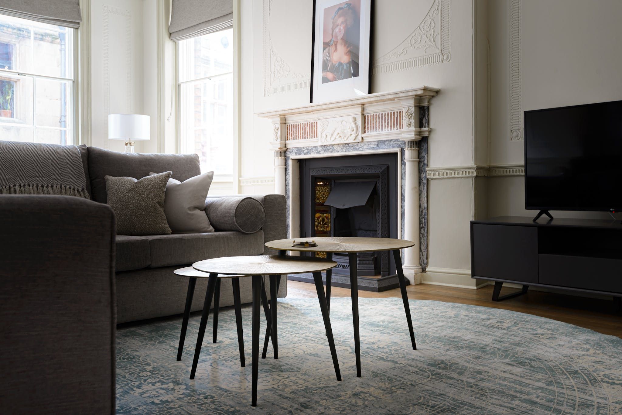 Enter to be immediately captivated by the bright and stylish interior – the open-plan living room and kitchen offer plenty of space for organising communal meals and quiet evenings of wine and movies on the plush sofa. The elegant dining table nestled by the large window will inspire you to rustle up delicious meals in the well-equipped kitchen and share them with your loved ones. We love the unique period details, including the fireplace and the opulent plaster artwork on the ceiling.