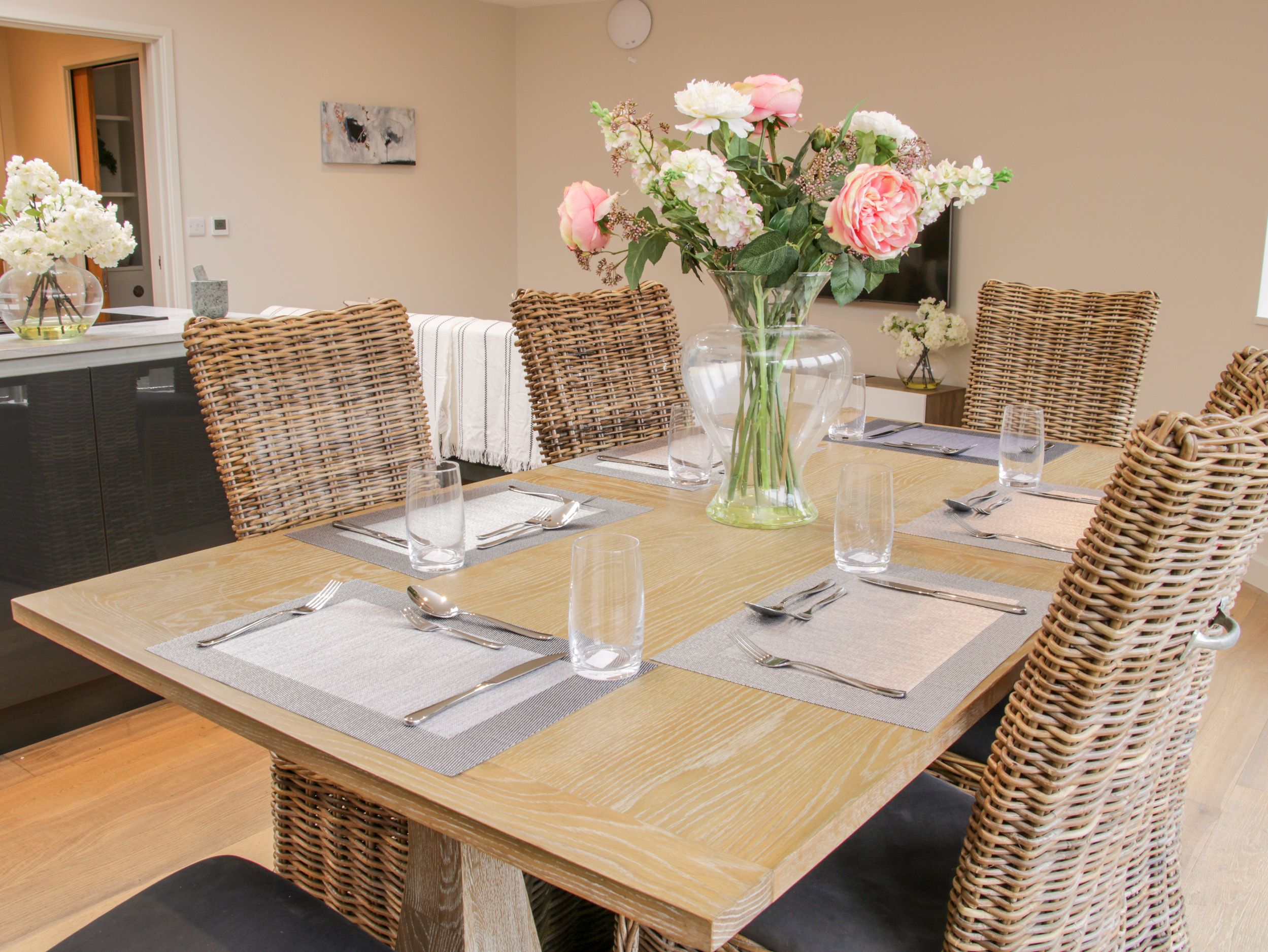 Accomodation Details Reverse-level-accommodation. Four bedrooms with TVs: 2 x king-size with en-suite shower, basin, heated towel rail and WC, 2 x twin (zip/link, can be king-size on request). Ground-floor bathroom with bath, handheld shower, basin, heated towel rail and WC. First-floor cloakroom with basin and WC. First-floor open-plan living space with kitchen, dining area ( dining table has 8 chairs) and sitting area. Utility. Sitting room