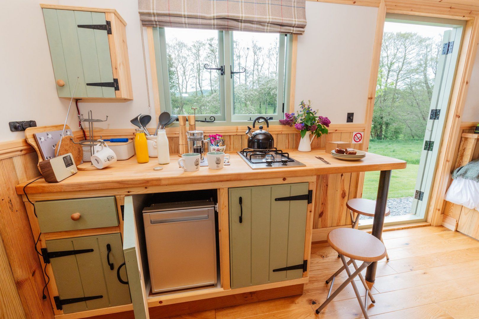 Facilities The Bramley Hut is compact, yet perfectly formed! The double bed is comfortable and bed linen is provided. The kitchenette area inside the hut comprises a gas hob for basic cooking and cooking equipment, cutlery, crockery and glasses are provided. The fridge and lights are solar powered. The wood-burner heats the hut up really well, to keep you warm on cooler nights (logs included). There is no running water in the hut, but mains tap (drinking) water is available in the nearby facilities building with shared washing up area. The toilet and hot shower is located outside the hut, in the facilities building, approx 30 metres away. Bramley Hut has a private and lockable toilet/shower room for your sole use. Towels and toiletries are included. Each unit has it's own allocated toilet/shower room.
