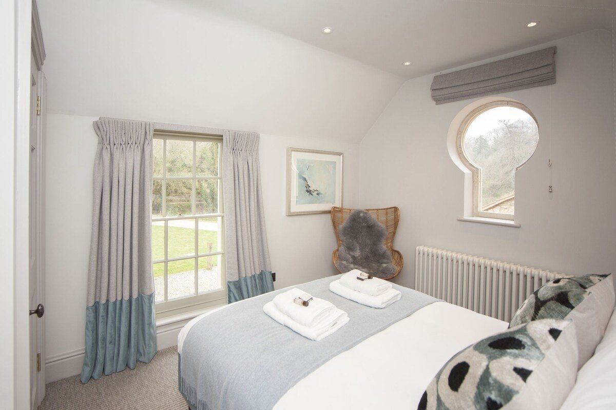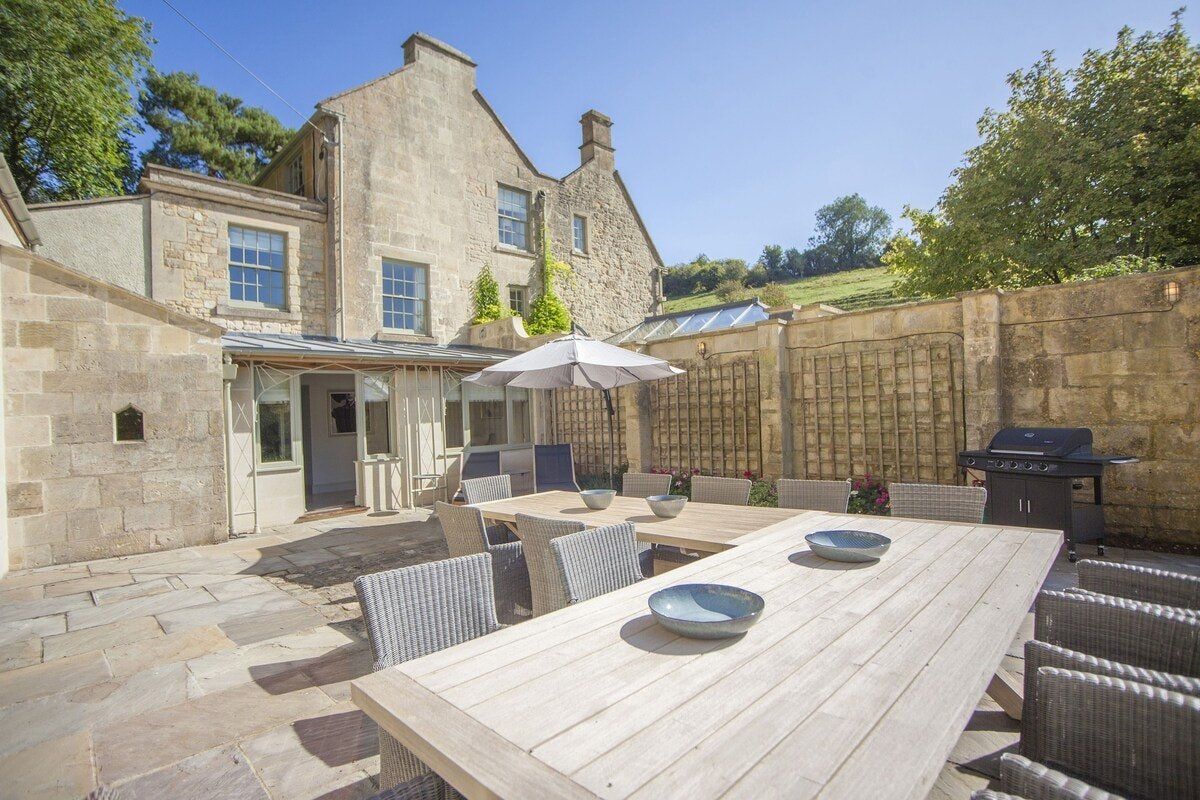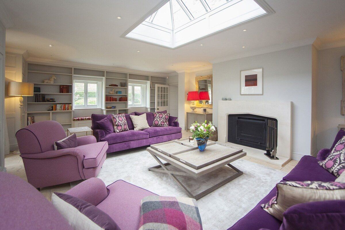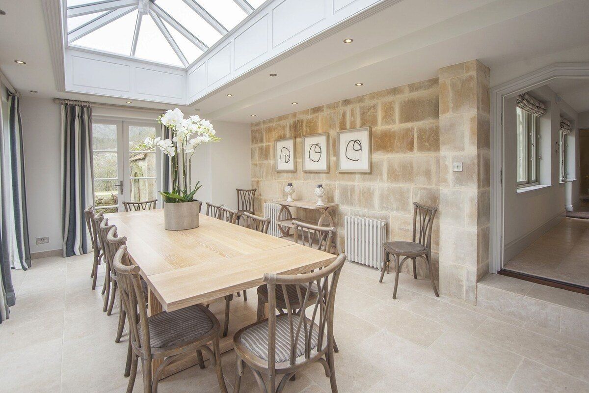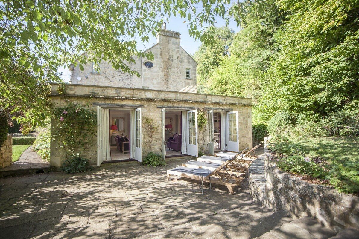 Tucked in a quiet valley outside of Bath is this luxurious, Grade II-listed Georgian manor house. Built in 1742, this honey-coloured home has been beautifully maintained and restored to its former glory - with a few modern updates, of course. There is an abundance of natural light flowing throughout the home, which the owner's have made the most of thanks to stylish decor choices. White walls only add to the calming feel, beautiful mirrors create an airy feel, and skylights/expansive windows create an indoor/outdoor feel. But there are plenty of splashes of colour here to add a punch of personality - we love the purple furniture in one of the living rooms, and the bright blue walls in the luxurious bar. If the weather is fine, we think you'll be outside enjoying this home's immaculate country garden. There's a barbecue, large table for entertaining, sun loungers for snoozing and private seated nooks overlooking the apple orchard for when you need some time to yourself. And if you're looking for art, culture and gourmet excitement away from the home, the splendid city of Bath is only a fifteen-minute drive away.