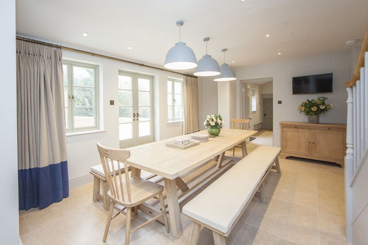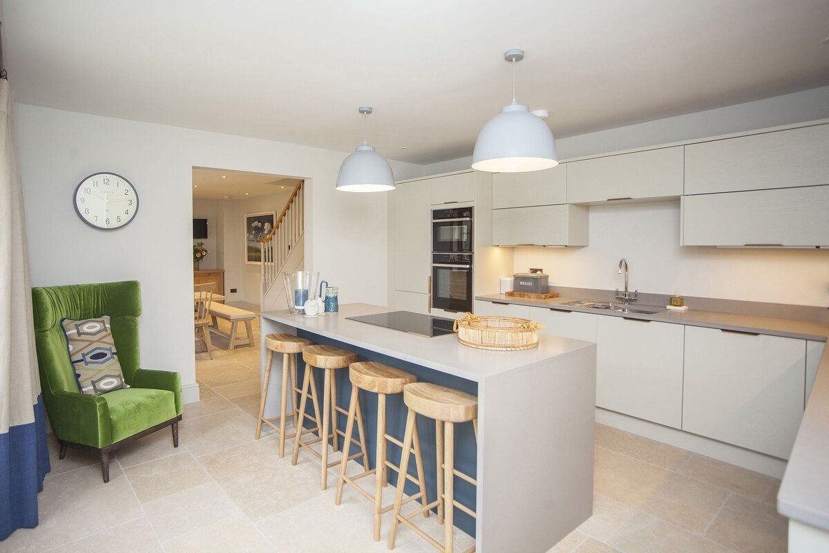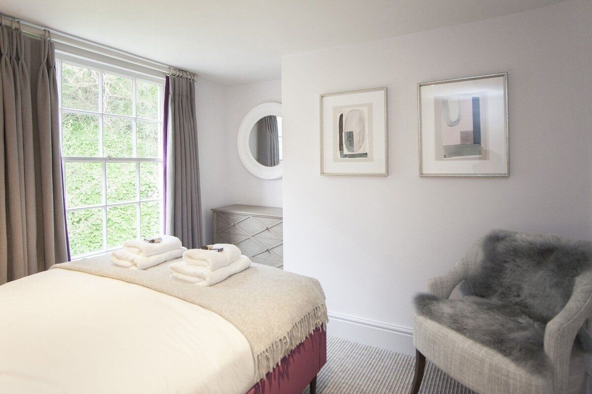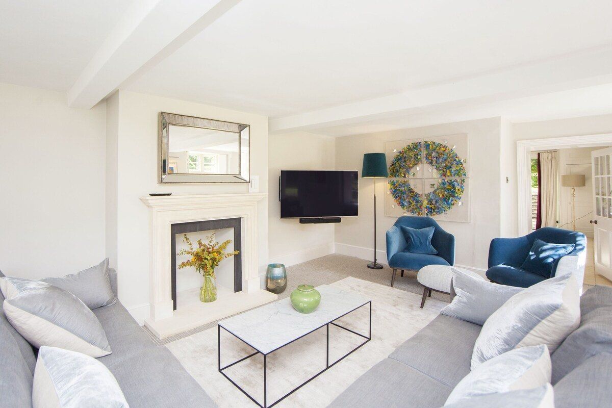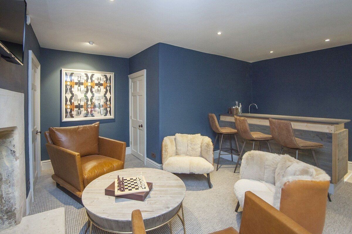 Tucked in a quiet valley outside of Bath is this luxurious, Grade II-listed Georgian manor house. Built in 1742, this honey-coloured home has been beautifully maintained and restored to its former glory - with a few modern updates, of course. There is an abundance of natural light flowing throughout the home, which the owner's have made the most of thanks to stylish decor choices. White walls only add to the calming feel, beautiful mirrors create an airy feel, and skylights/expansive windows create an indoor/outdoor feel. But there are plenty of splashes of colour here to add a punch of personality - we love the purple furniture in one of the living rooms, and the bright blue walls in the luxurious bar. If the weather is fine, we think you'll be outside enjoying this home's immaculate country garden. There's a barbecue, large table for entertaining, sun loungers for snoozing and private seated nooks overlooking the apple orchard for when you need some time to yourself. And if you're looking for art, culture and gourmet excitement away from the home, the splendid city of Bath is only a fifteen-minute drive away.