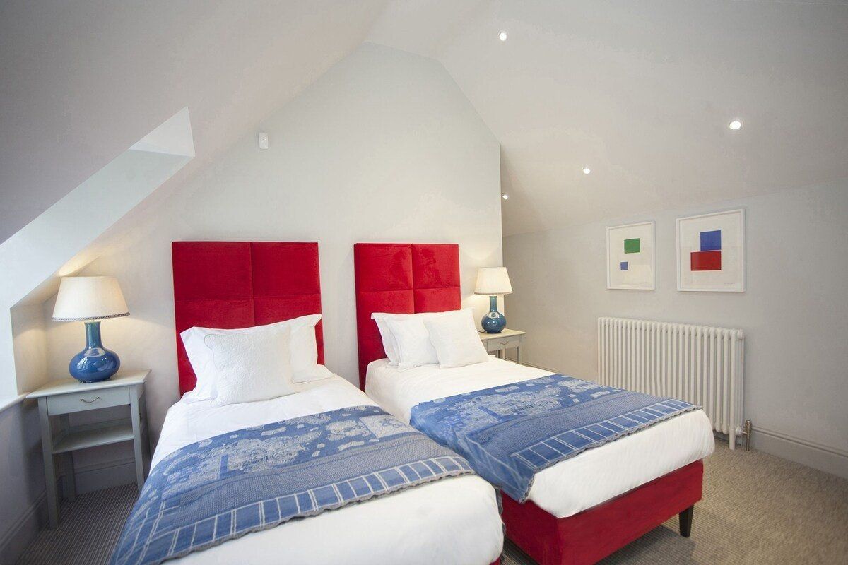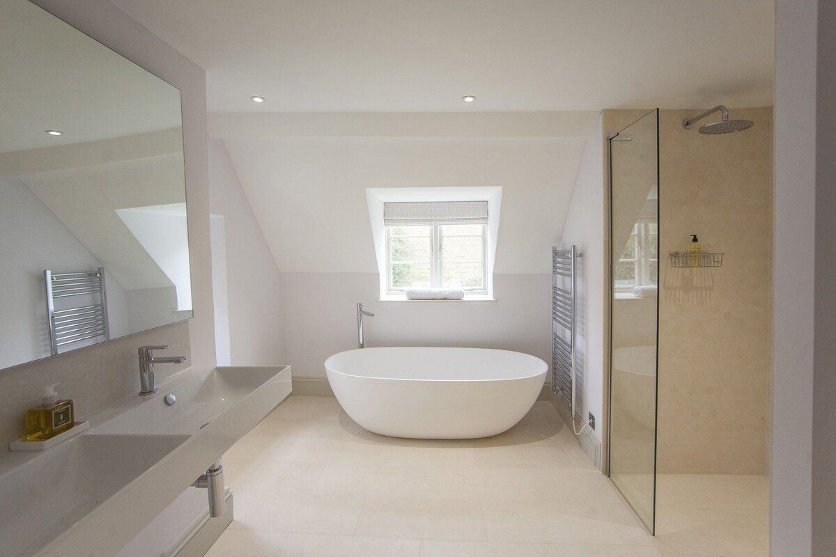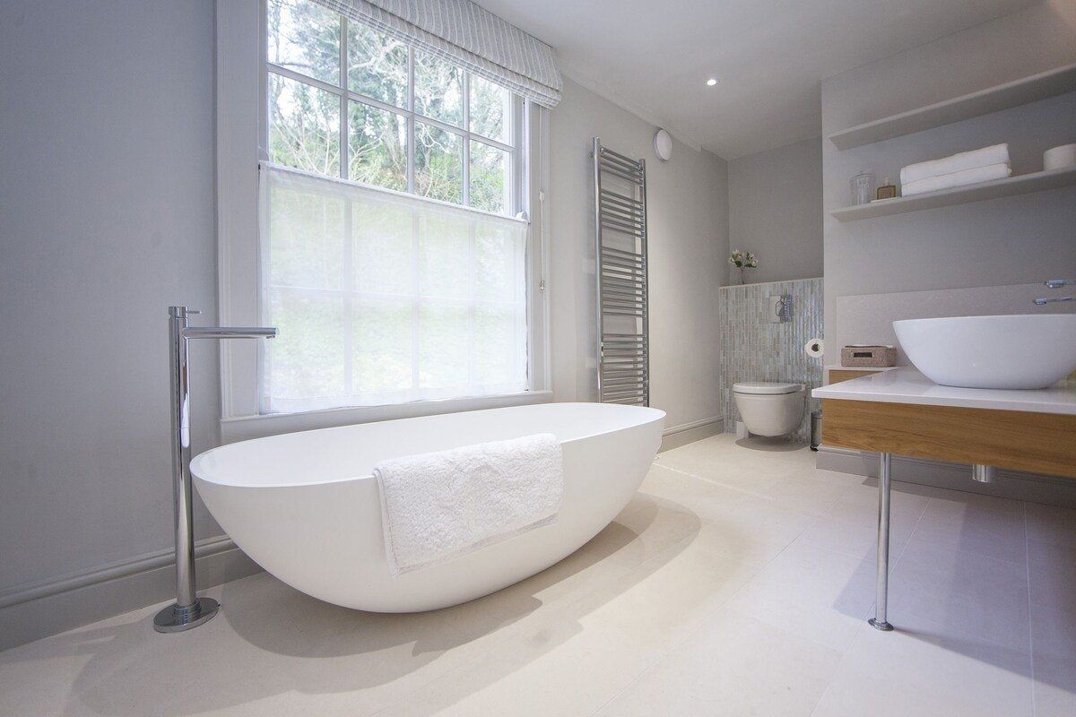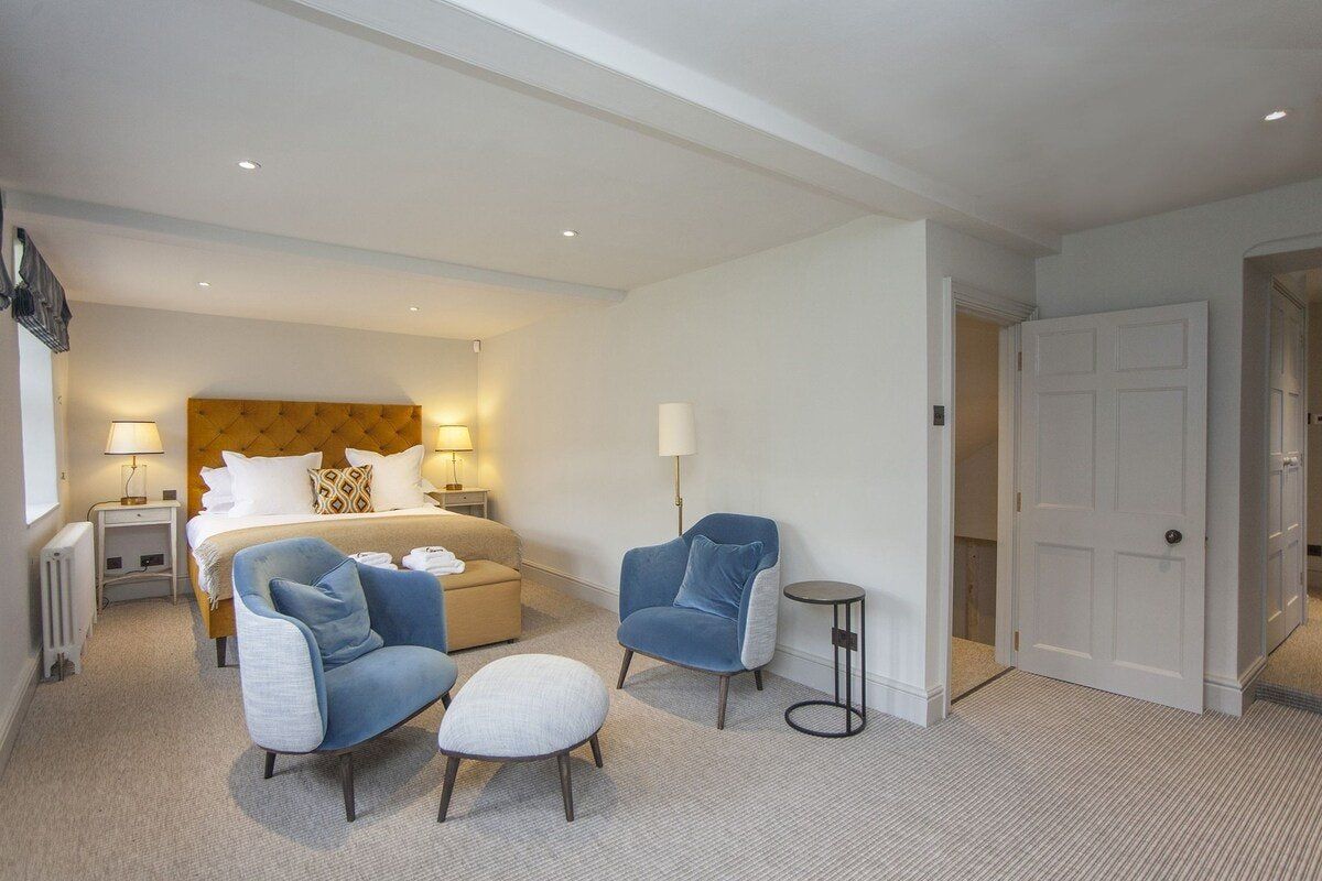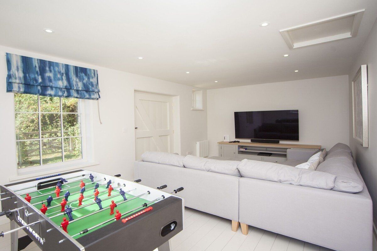 Tucked in a quiet valley outside of Bath is this luxurious, Grade II-listed Georgian manor house. Built in 1742, this honey-coloured home has been beautifully maintained and restored to its former glory - with a few modern updates, of course. There is an abundance of natural light flowing throughout the home, which the owner's have made the most of thanks to stylish decor choices. White walls only add to the calming feel, beautiful mirrors create an airy feel, and skylights/expansive windows create an indoor/outdoor feel. But there are plenty of splashes of colour here to add a punch of personality - we love the purple furniture in one of the living rooms, and the bright blue walls in the luxurious bar. If the weather is fine, we think you'll be outside enjoying this home's immaculate country garden. There's a barbecue, large table for entertaining, sun loungers for snoozing and private seated nooks overlooking the apple orchard for when you need some time to yourself. And if you're looking for art, culture and gourmet excitement away from the home, the splendid city of Bath is only a fifteen-minute drive away.