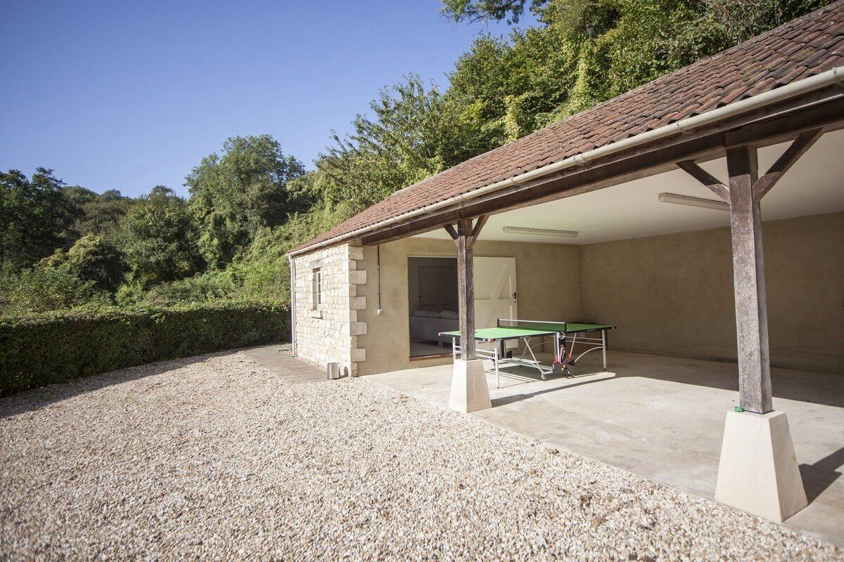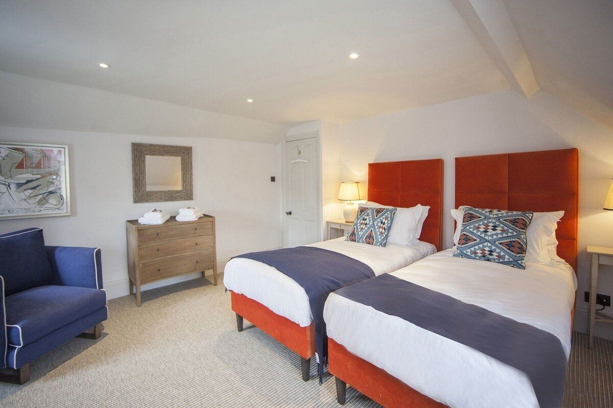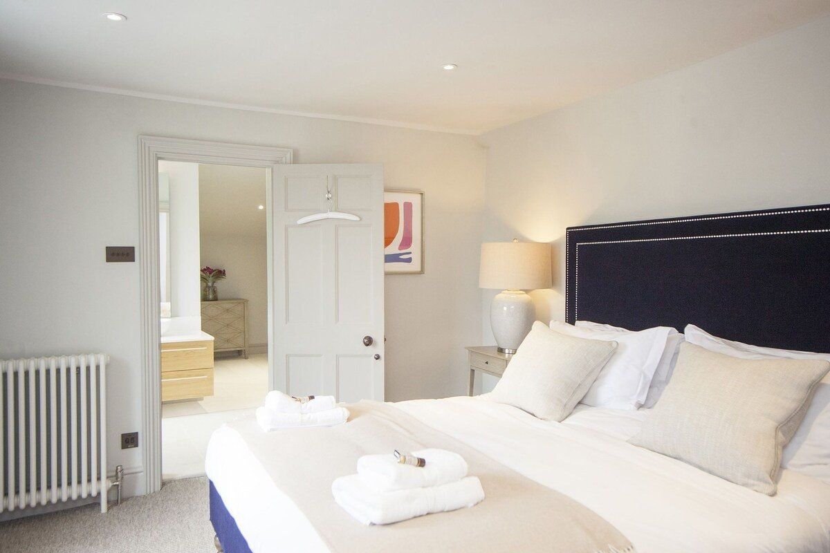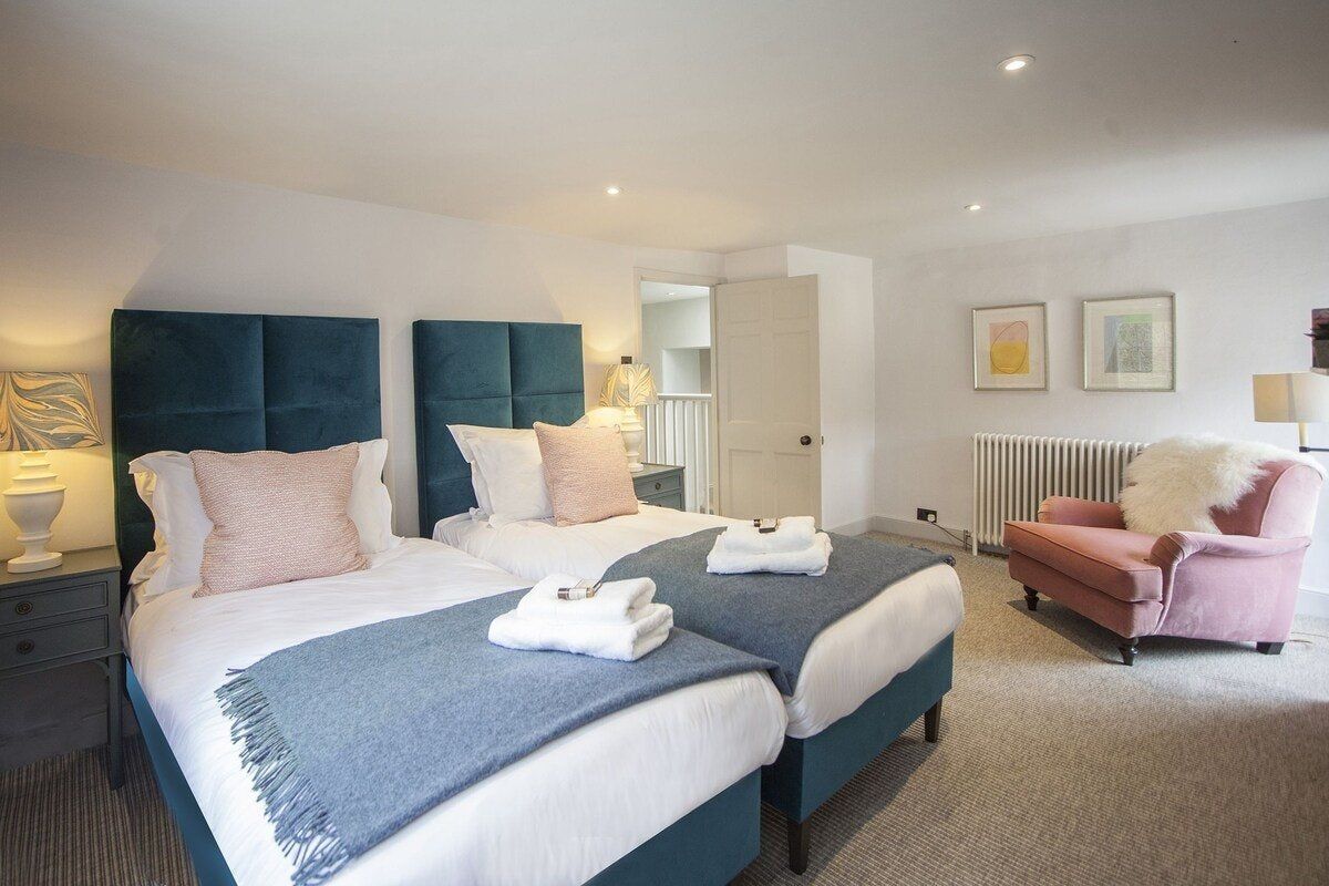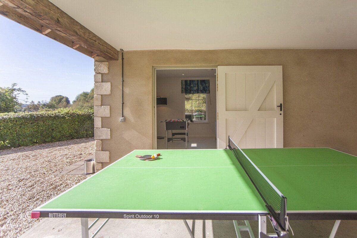 Tucked in a quiet valley outside of Bath is this luxurious, Grade II-listed Georgian manor house. Built in 1742, this honey-coloured home has been beautifully maintained and restored to its former glory - with a few modern updates, of course. There is an abundance of natural light flowing throughout the home, which the owner's have made the most of thanks to stylish decor choices. White walls only add to the calming feel, beautiful mirrors create an airy feel, and skylights/expansive windows create an indoor/outdoor feel. But there are plenty of splashes of colour here to add a punch of personality - we love the purple furniture in one of the living rooms, and the bright blue walls in the luxurious bar. If the weather is fine, we think you'll be outside enjoying this home's immaculate country garden. There's a barbecue, large table for entertaining, sun loungers for snoozing and private seated nooks overlooking the apple orchard for when you need some time to yourself. And if you're looking for art, culture and gourmet excitement away from the home, the splendid city of Bath is only a fifteen-minute drive away.