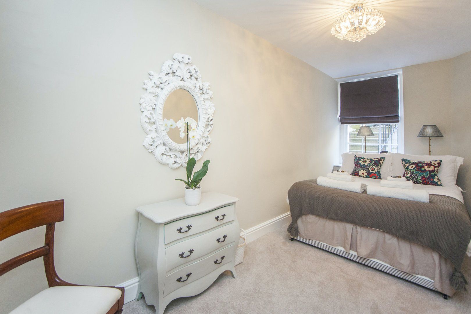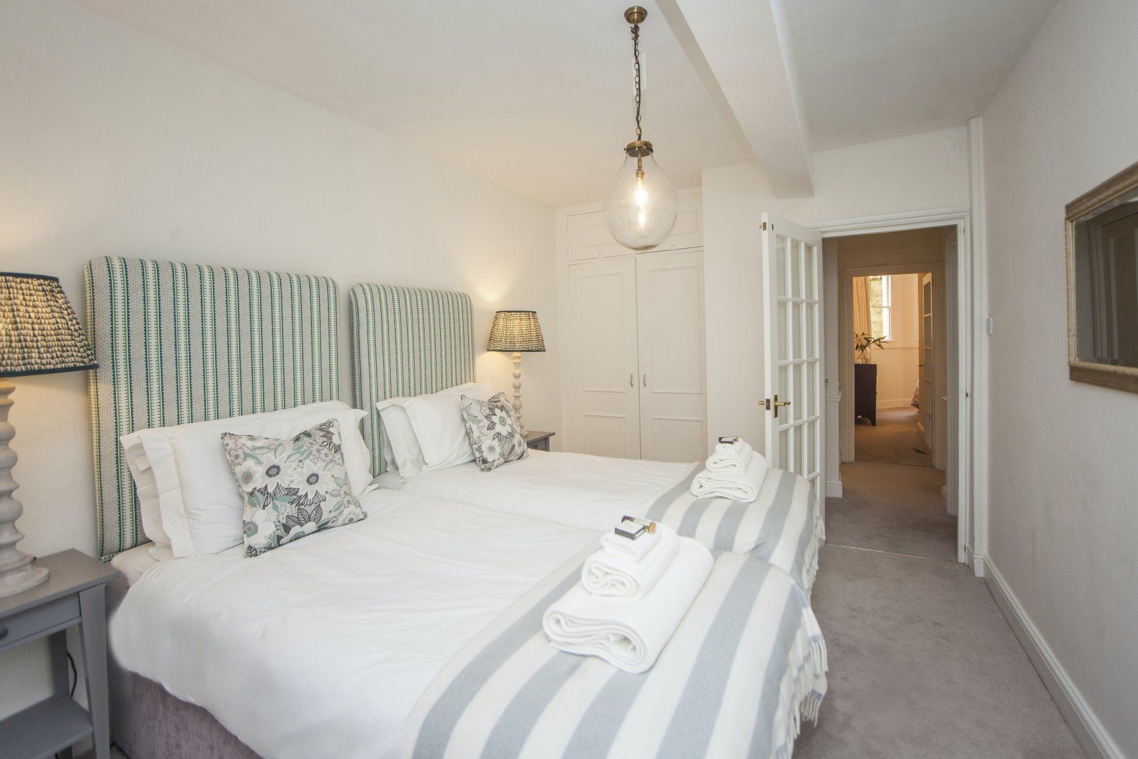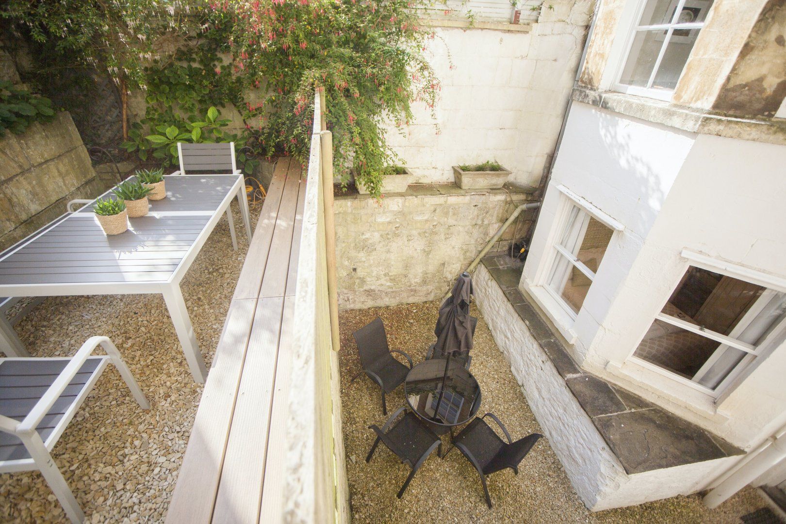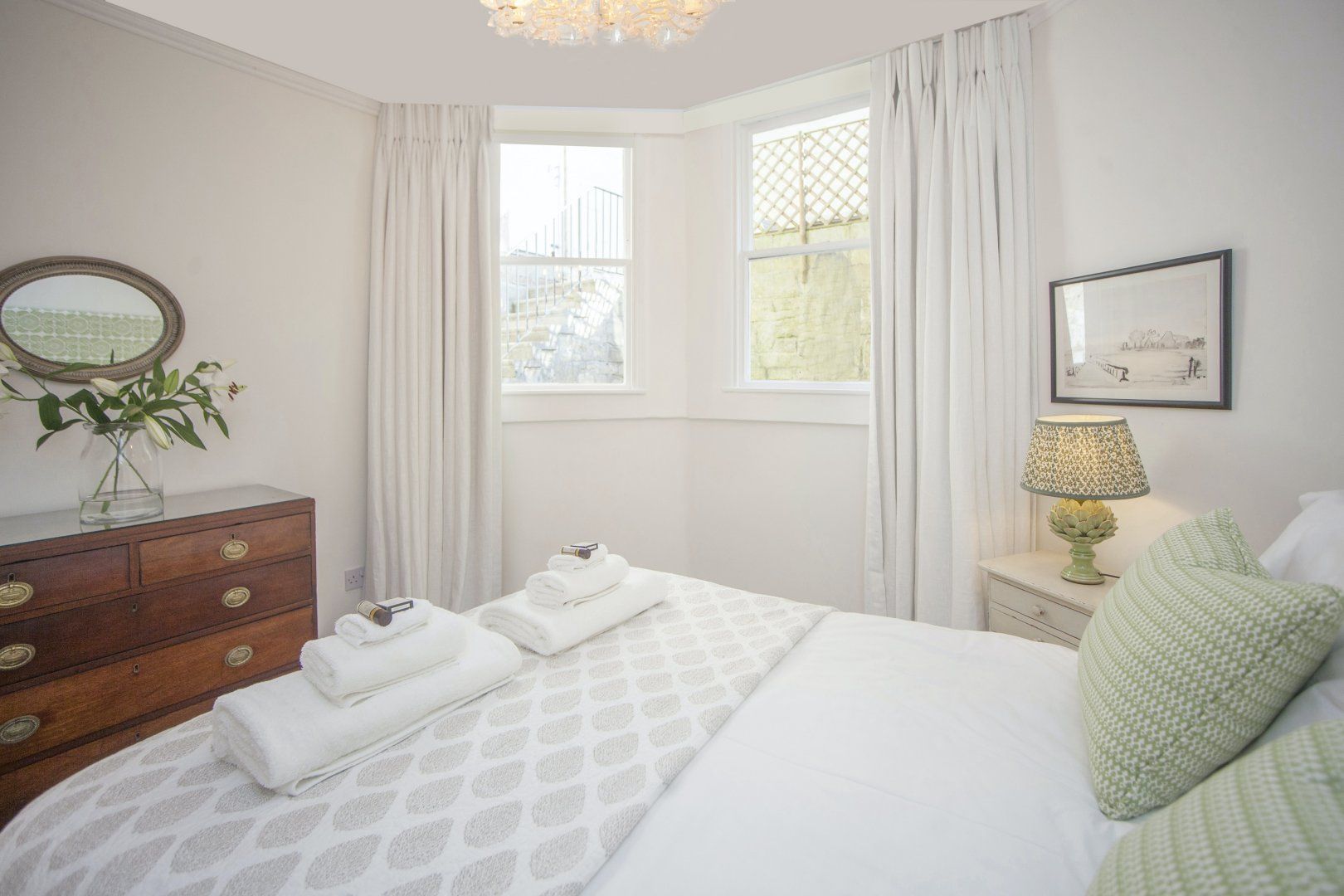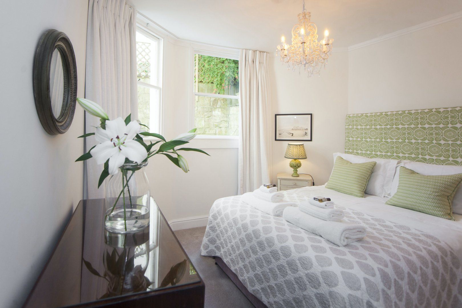 With its light-soaked cream sofas, white framed walls, and two-tiered courtyard garden, this palatial home is for relaxing in style. It's a Georgian house situated in one of Bath's most desirable neighbourhoods – perfect for wandering the cobbled streets, browsing boutiques, and visiting the Royal Crescent – an easy fifteen-minute walk away. Exuding understated elegance, you'll swoon over the traditional touches, such as the floor-to-ceiling sash windows, marble fireplace, and high ceilings. After a day exploring Bath’s cultural attractions, relax in the grand sitting room, or socialise around the dining table. With a calming palette of graceful greens and soft blues, the bedrooms are charming, cosy spaces that will make you feel well-rested. Come evening, whip up a delicious meal in the sleek kitchen benefitting from playful checkered tile flooring, while catching up with friends. Enjoy alfresco dining on the balcony, or bookmark a delightful day with sundown drinks in the stone courtyard below.