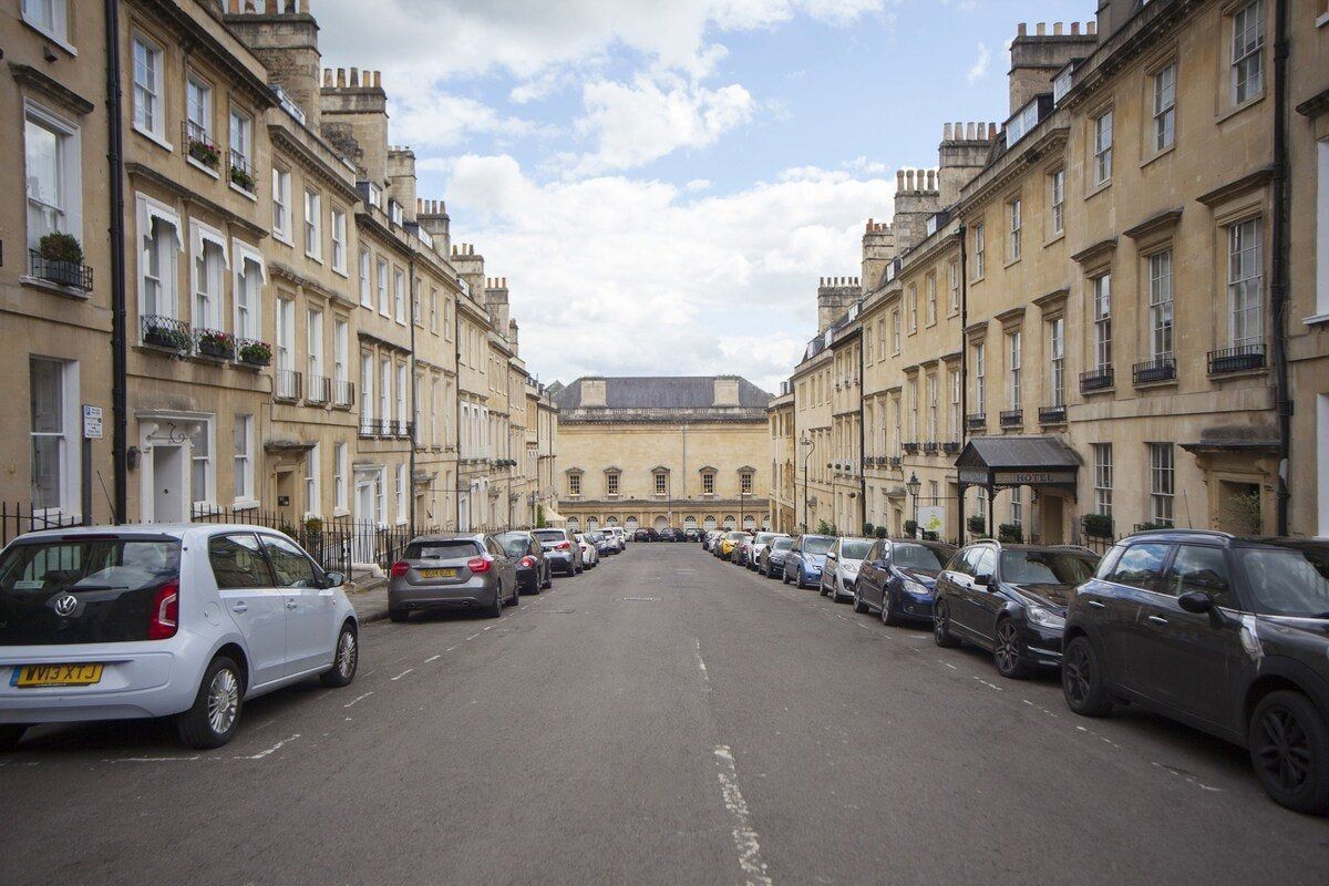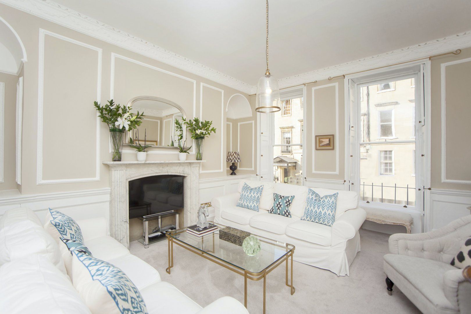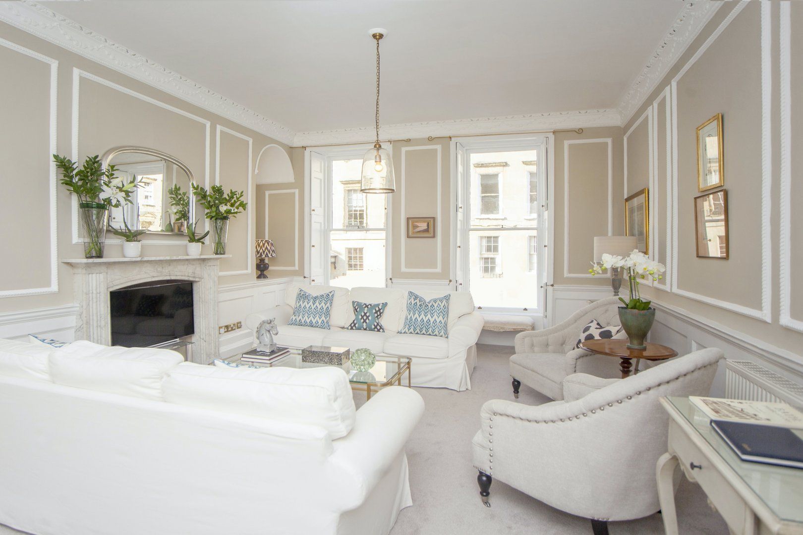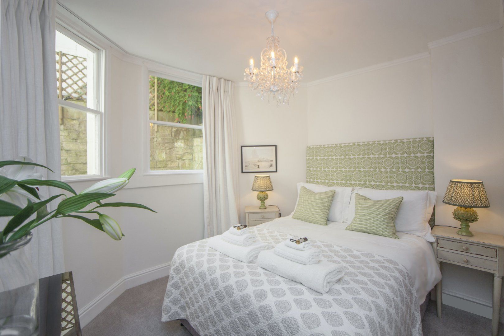 With its light-soaked cream sofas, white framed walls, and two-tiered courtyard garden, this palatial home is for relaxing in style. It's a Georgian house situated in one of Bath's most desirable neighbourhoods – perfect for wandering the cobbled streets, browsing boutiques, and visiting the Royal Crescent – an easy fifteen-minute walk away. Exuding understated elegance, you'll swoon over the traditional touches, such as the floor-to-ceiling sash windows, marble fireplace, and high ceilings. After a day exploring Bath’s cultural attractions, relax in the grand sitting room, or socialise around the dining table. With a calming palette of graceful greens and soft blues, the bedrooms are charming, cosy spaces that will make you feel well-rested. Come evening, whip up a delicious meal in the sleek kitchen benefitting from playful checkered tile flooring, while catching up with friends. Enjoy alfresco dining on the balcony, or bookmark a delightful day with sundown drinks in the stone courtyard below.