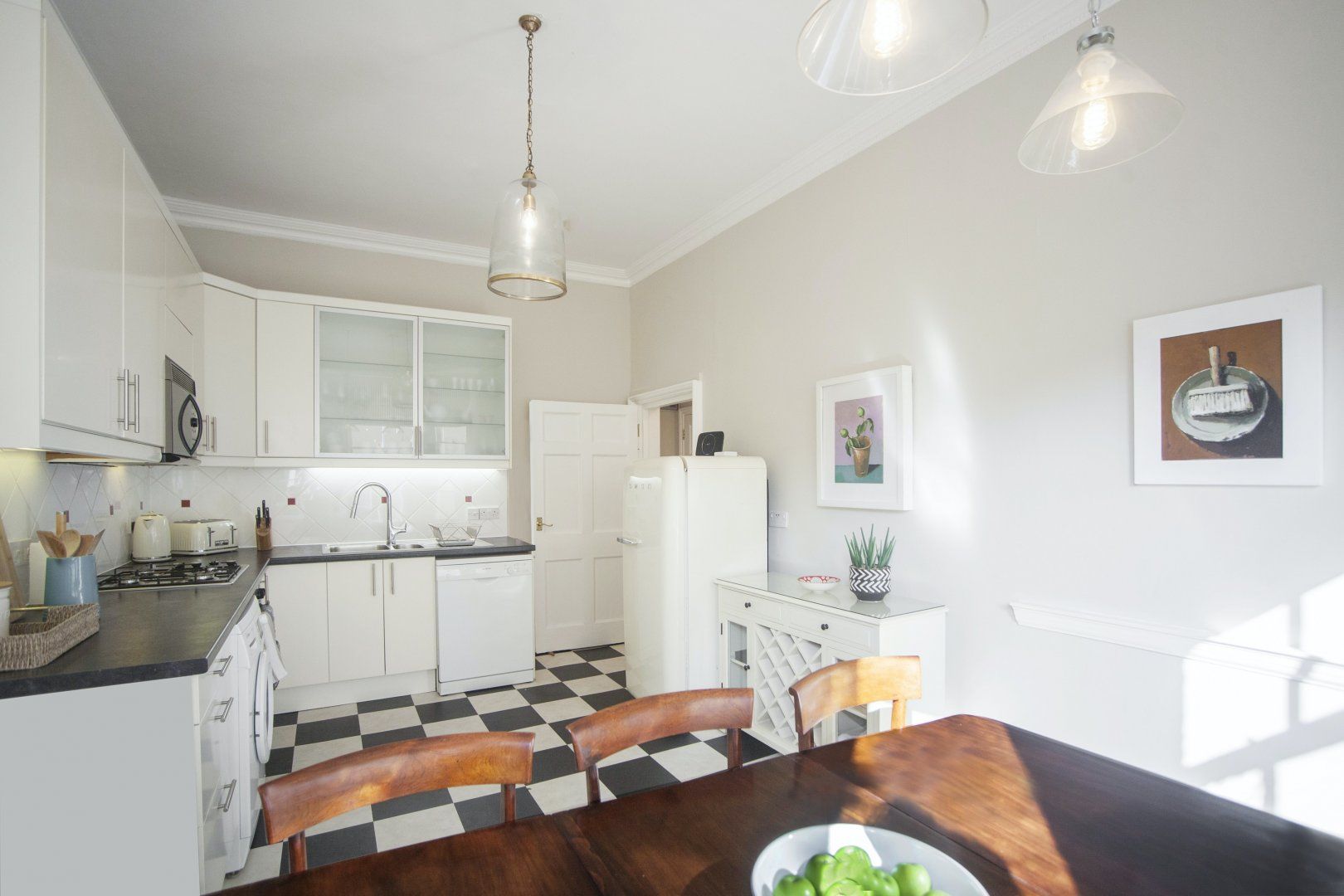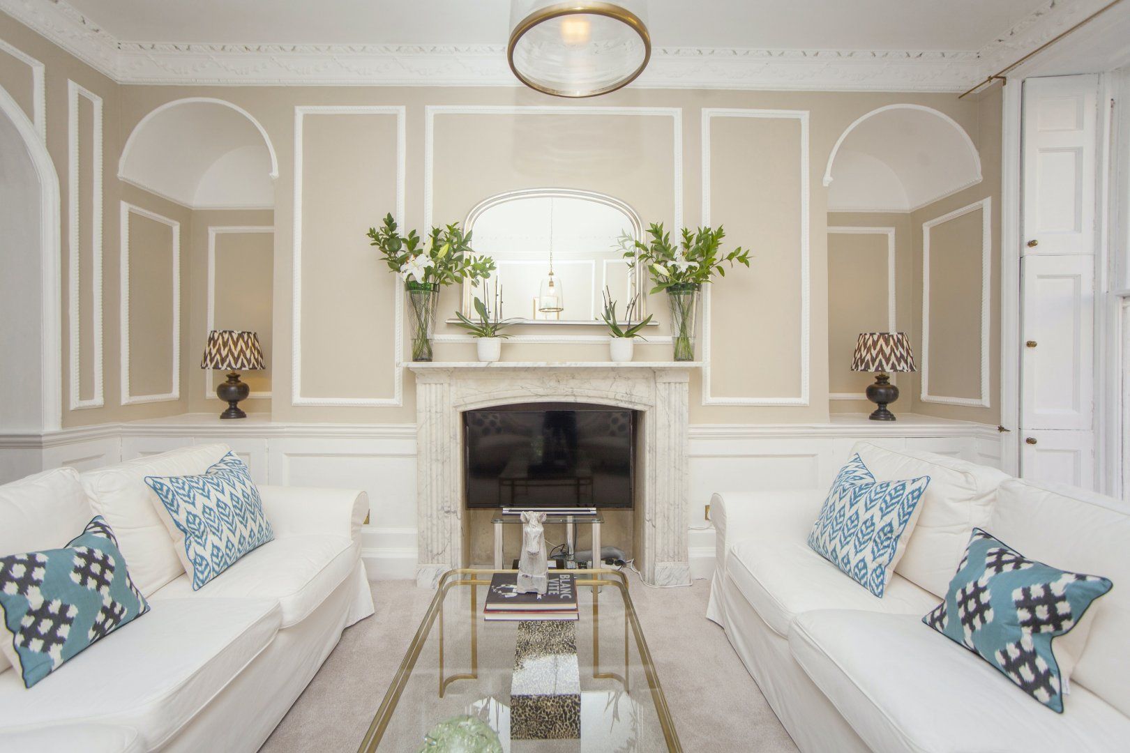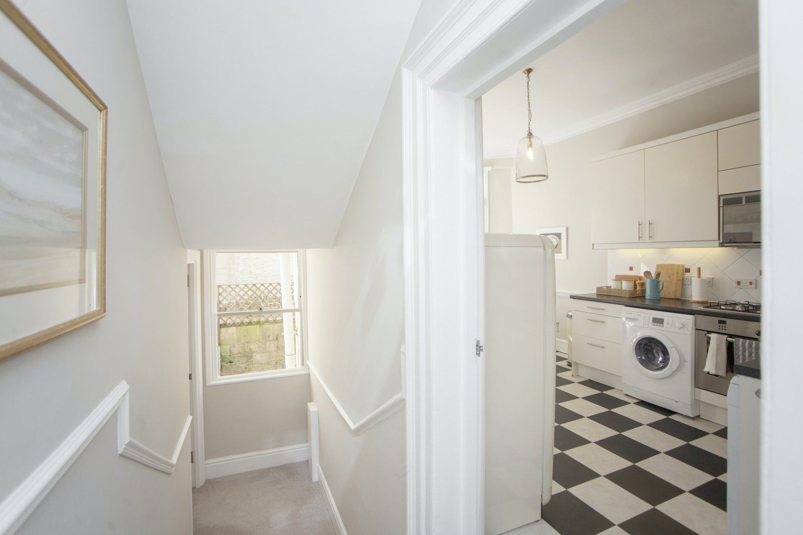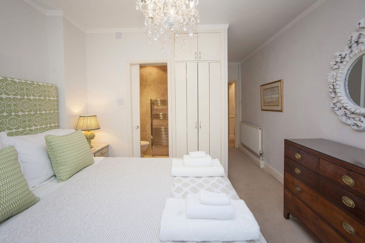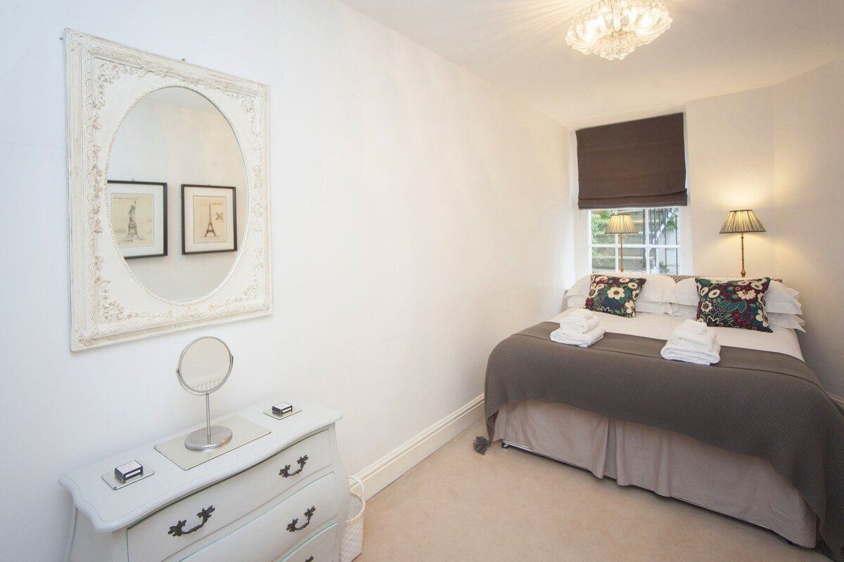With its light-soaked cream sofas, white framed walls, and two-tiered courtyard garden, this palatial home is for relaxing in style. It's a Georgian house situated in one of Bath's most desirable neighbourhoods – perfect for wandering the cobbled streets, browsing boutiques, and visiting the Royal Crescent – an easy fifteen-minute walk away. Exuding understated elegance, you'll swoon over the traditional touches, such as the floor-to-ceiling sash windows, marble fireplace, and high ceilings. After a day exploring Bath’s cultural attractions, relax in the grand sitting room, or socialise around the dining table. With a calming palette of graceful greens and soft blues, the bedrooms are charming, cosy spaces that will make you feel well-rested. Come evening, whip up a delicious meal in the sleek kitchen benefitting from playful checkered tile flooring, while catching up with friends. Enjoy alfresco dining on the balcony, or bookmark a delightful day with sundown drinks in the stone courtyard below.