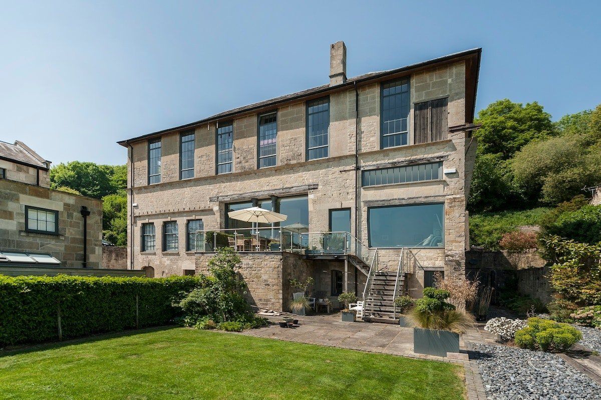 Secluded in the idyllic Somerset countryside on the outskirts of Bath, this luxurious garden apartment was once part of a working 19th-century watermill. It's a great mix of modern and industrial, with exposed timber beams under high ceilings and ladders as lampstands harking back to the building's watermill days. The kitchen and living room have been converted into an open space blessed with heaps of natural light thanks to floor-to-ceiling windows. We loved how cosy this place feels, with tons of books, a good selection of board games, a piano, and lots of personal touches that will instantly make any family feel at home. A classic Aga Stove provides warmth in the kitchen, and a picture-frame window shows off the rolling hills. There's plenty of prep space for cooking, so pour yourself a glass of wine, put a vinyl on the record player and let your culinary skills run wild. Outside, the sunny terrace and manicured garden are perfect for unwinding on sunnier days. Historic, vibrant Bath is a ten-minute drive away, so you're not far from restaurants, coffee shops and boutiques, but if you want to feel the oasis of a real countryside escape, rural walks and cycles through green fields, bluebell forests and single track cowslip strewn country have you covered.