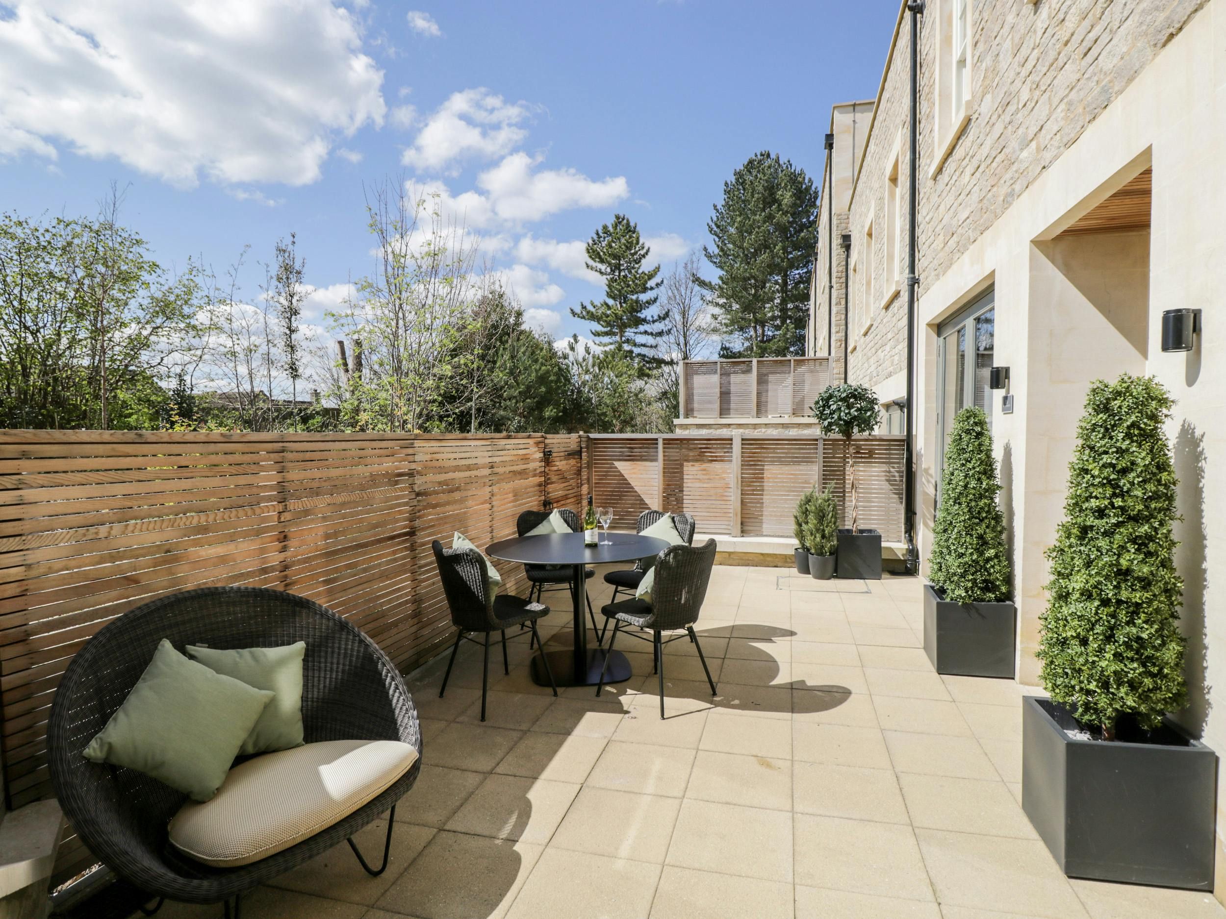 This attractive ground-floor apartment is based in a residential development in Bath. It’s surrounded by 6 acres of parkland – including communal tennis courts – so it's a tranquil base from which to explore the city. Despite its leafy surroundings, it’s only a few minutes on foot from sights including the Royal Crescent and the Roman Baths, as well as restaurants, cafes, and pubs. The apartment is chic and comfortable, equipped with everything you might need for a city break. There’s even a delightful patio garden where you can soak up the sun and unwind after busy days of sightseeing.