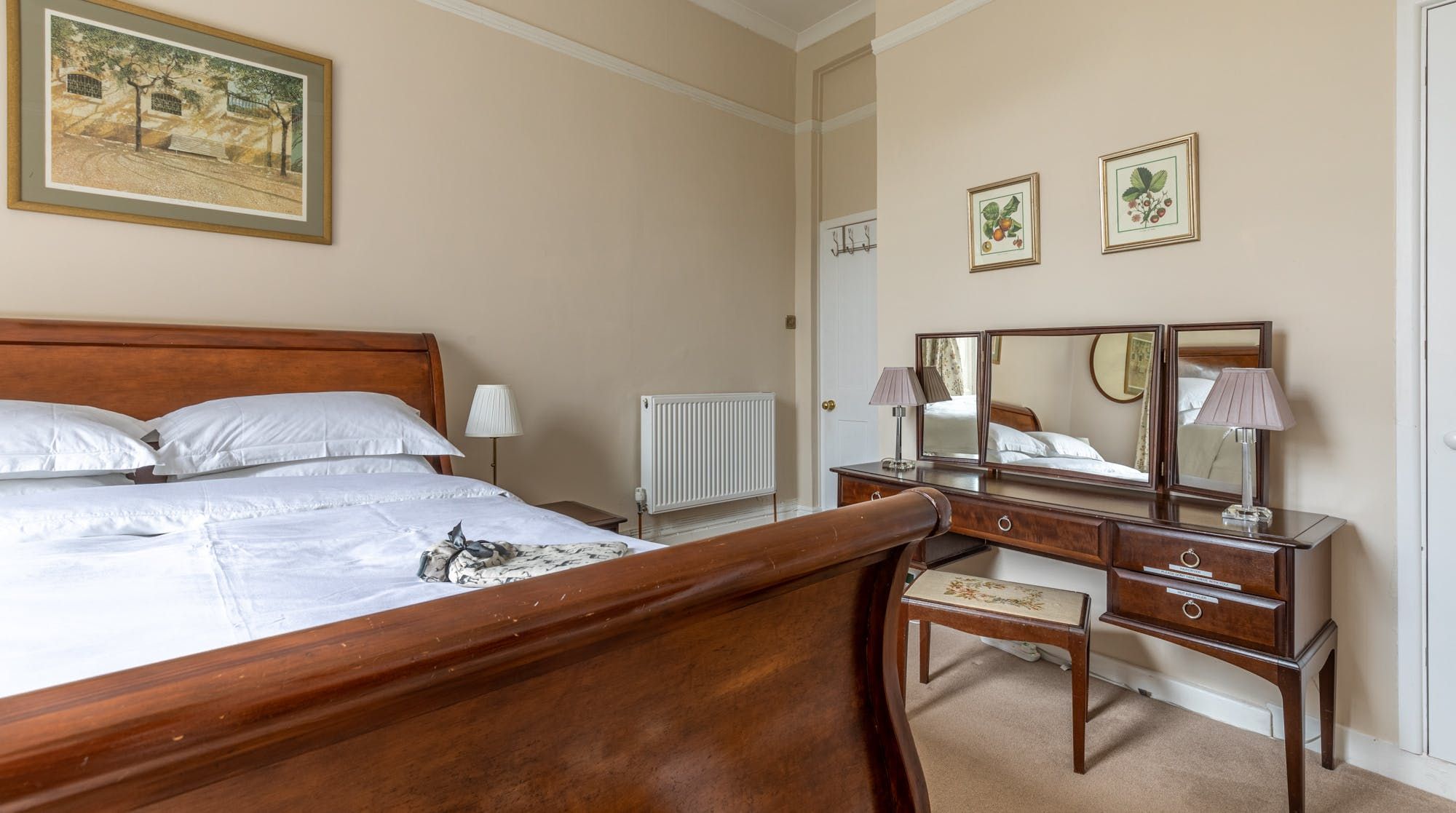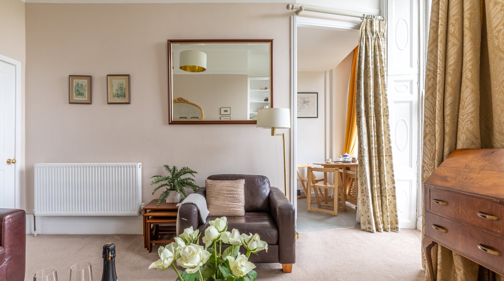 Take in sweeping views of the landmark crescent from the living room’s floor-to-ceiling sash windows, as you tuck into the provided breakfast at the sunny kitchen table. Period pieces in the main room and bedroom create a decadent impression fit for royalty – the elegant fireplace is a particular highlight.