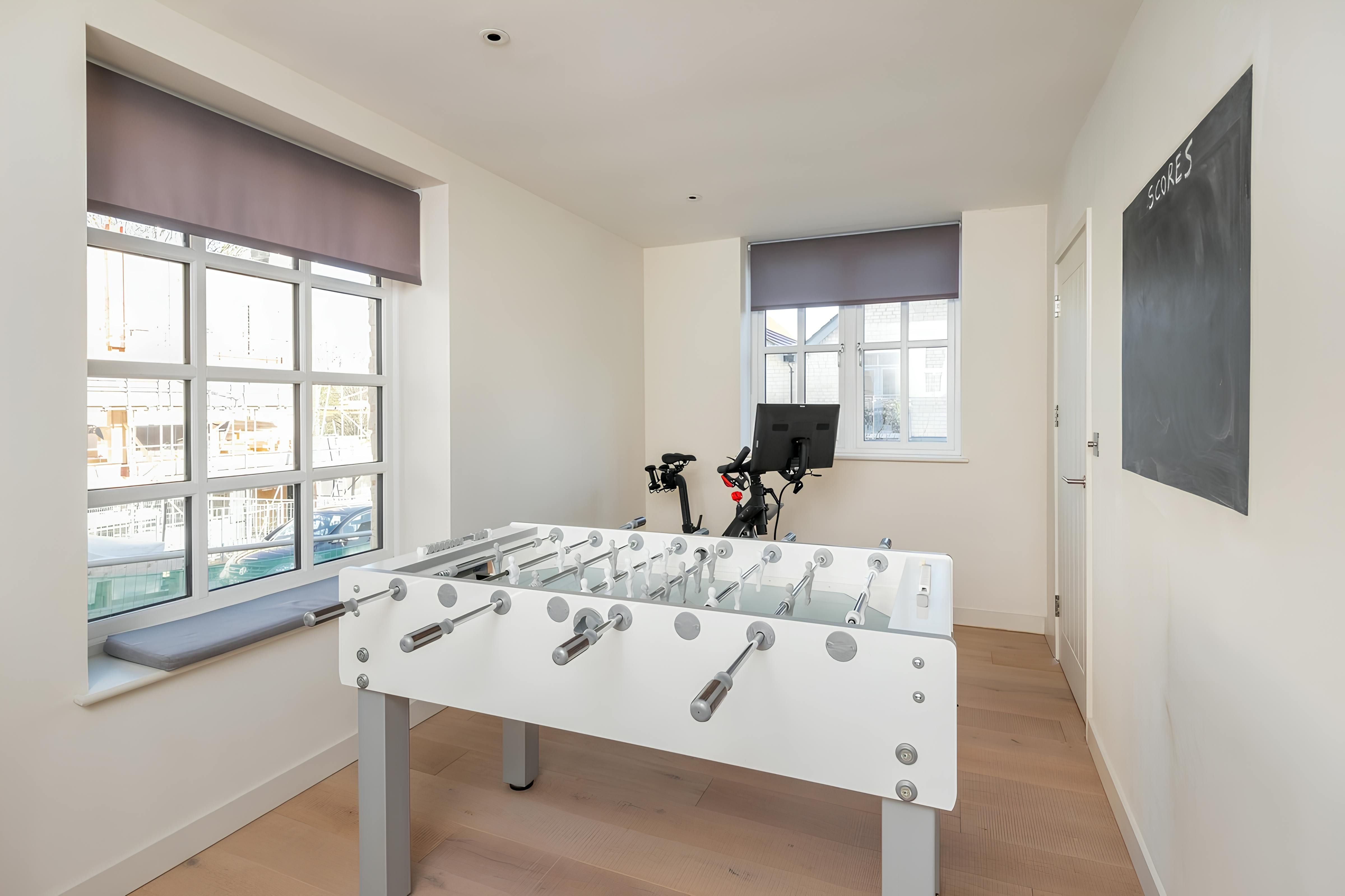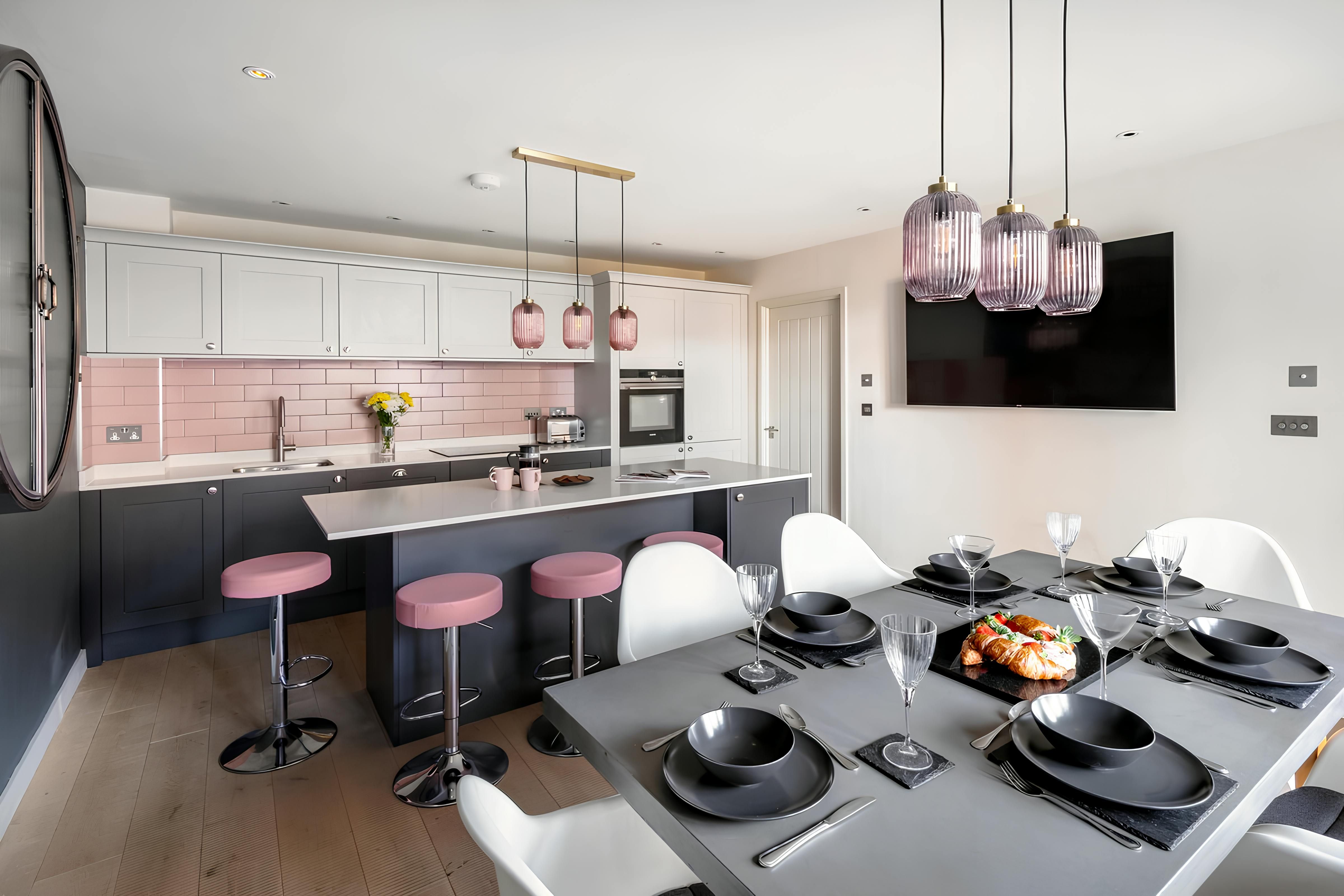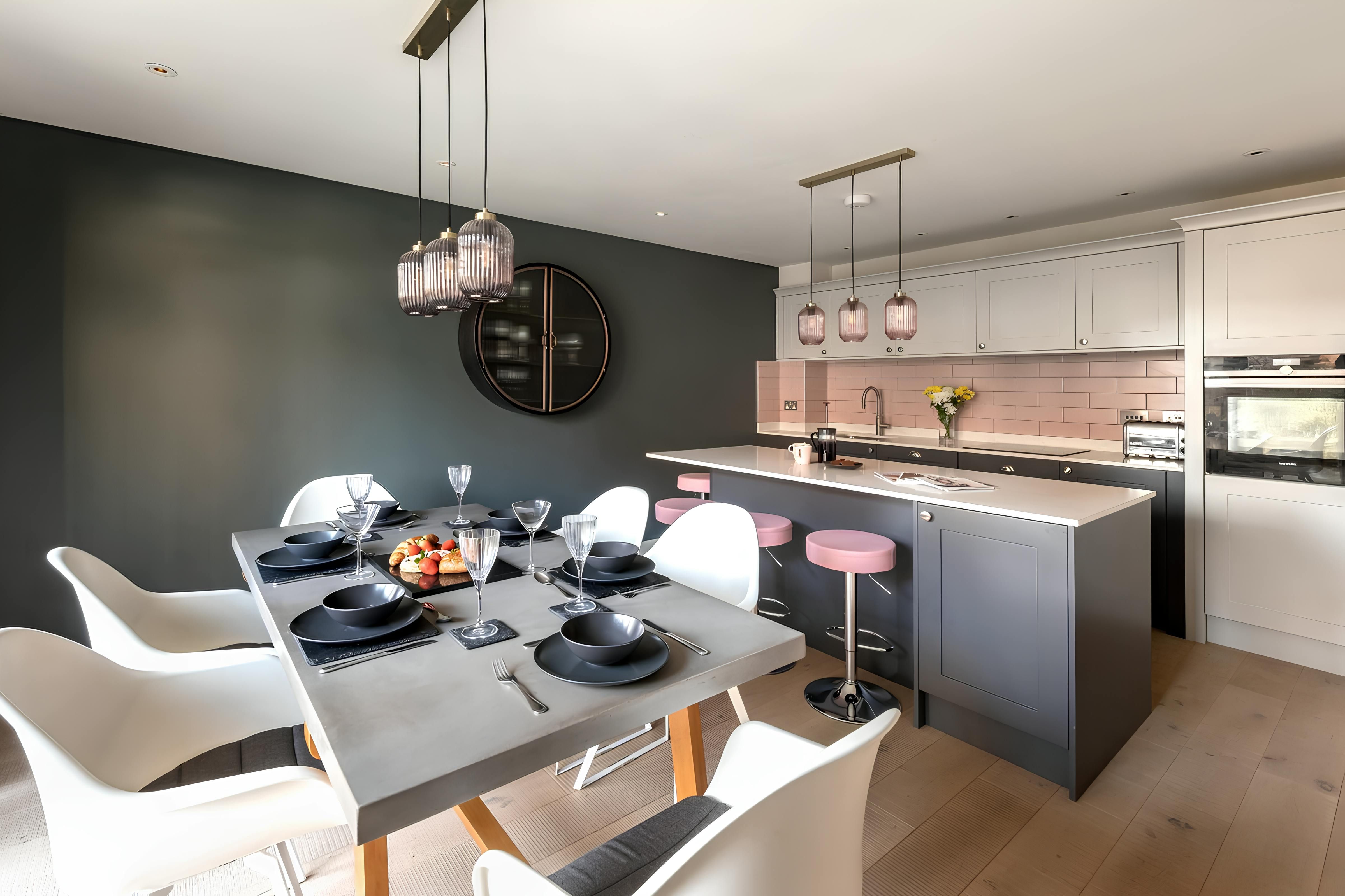 Chic and contemporary, this townhouse is a perfect base in Bath for a family or group of friends. It’s located in Bath’s Artisan Quarter, home to quirky independent shops and cafes, and is just a ten-minute walk from the centre of Bath. When you’re not out seeing the sights, you’ll be happy to have such a comfortable place to call home. We love the pretty pastel-pink kitchen, and the first-floor balcony. Children will love the games room, which is equipped with a foosball table, board games, and a Peloton bike. There’s also a desk for those working remotely while in Bath – this home has everything you might need.