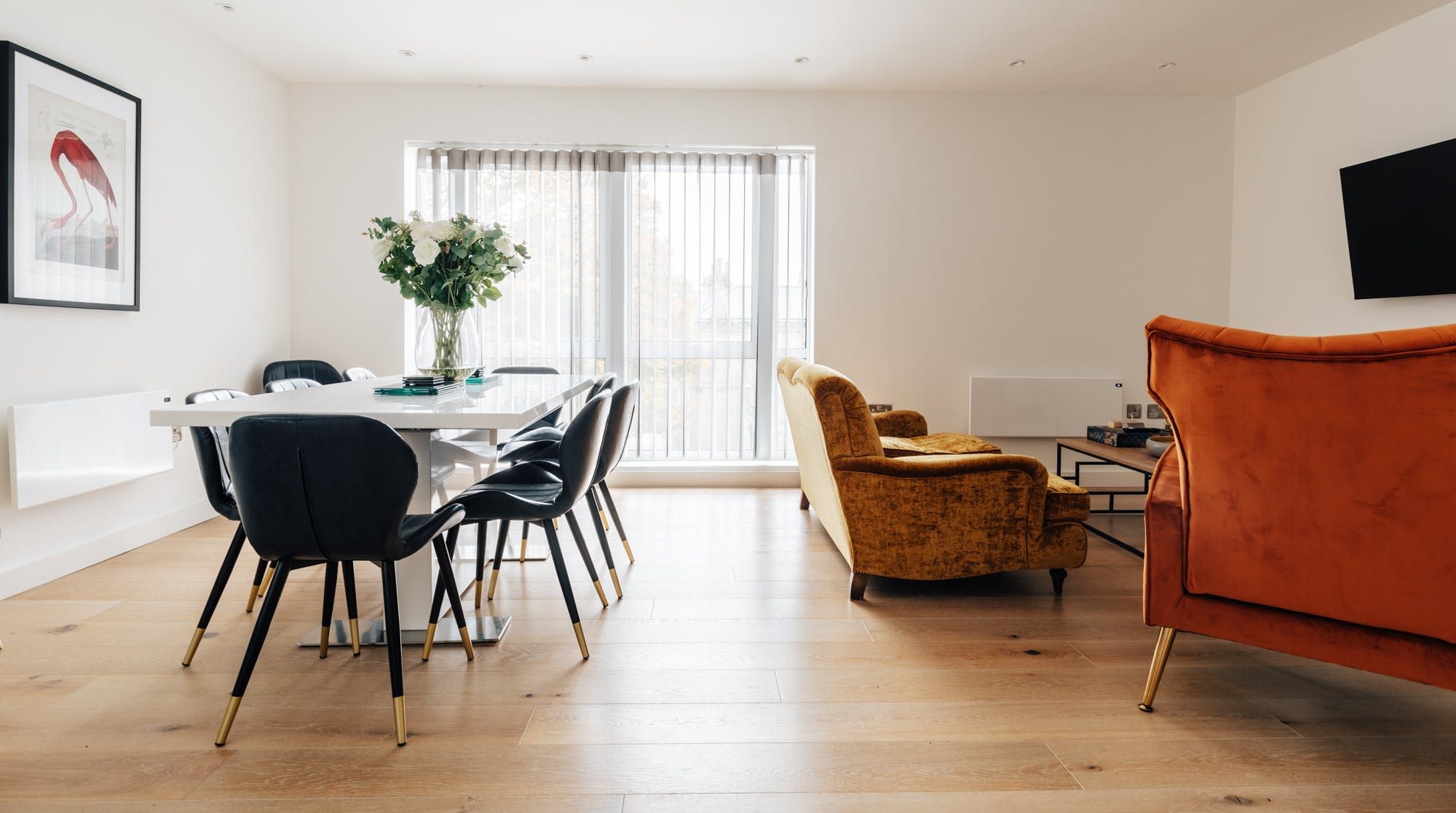 This stunning second floor apartment boasts elegant interiors and enviable views of Bath’s World Heritage City skyline. Featuring a lovely, light filled open plan kitchen cum dining and living space, courtesy of near floor to ceiling windows, and two king-size bedrooms, this home is perfect for a couple of couples or a small family. Tastefully decorated, you’ll love this home for its whitewashed walls, sleek wooden floors and penchant for the decadence of velvet and velour.